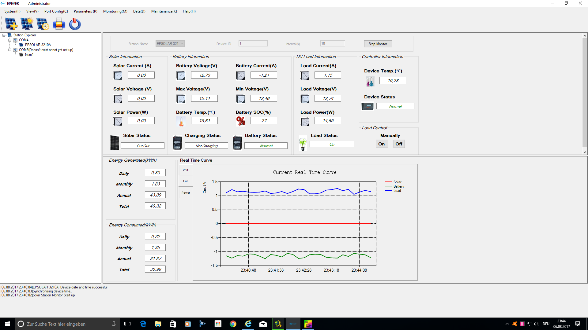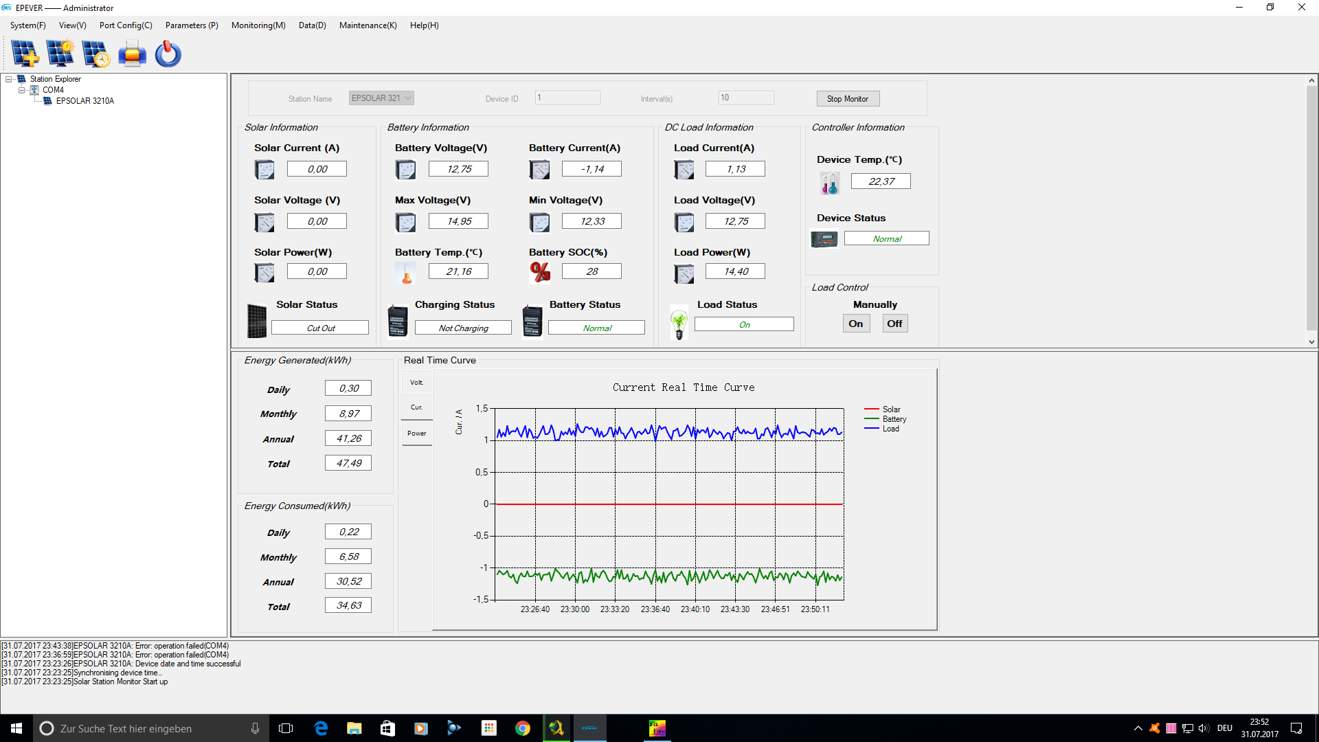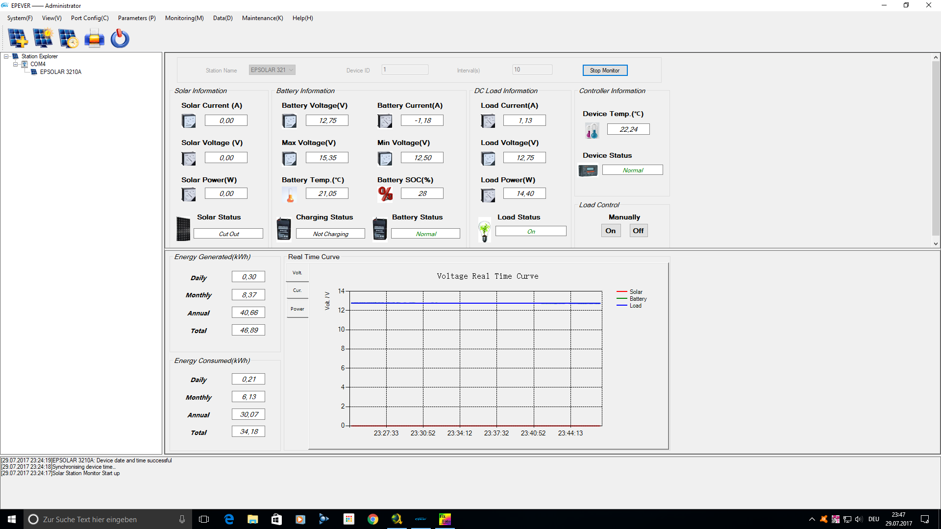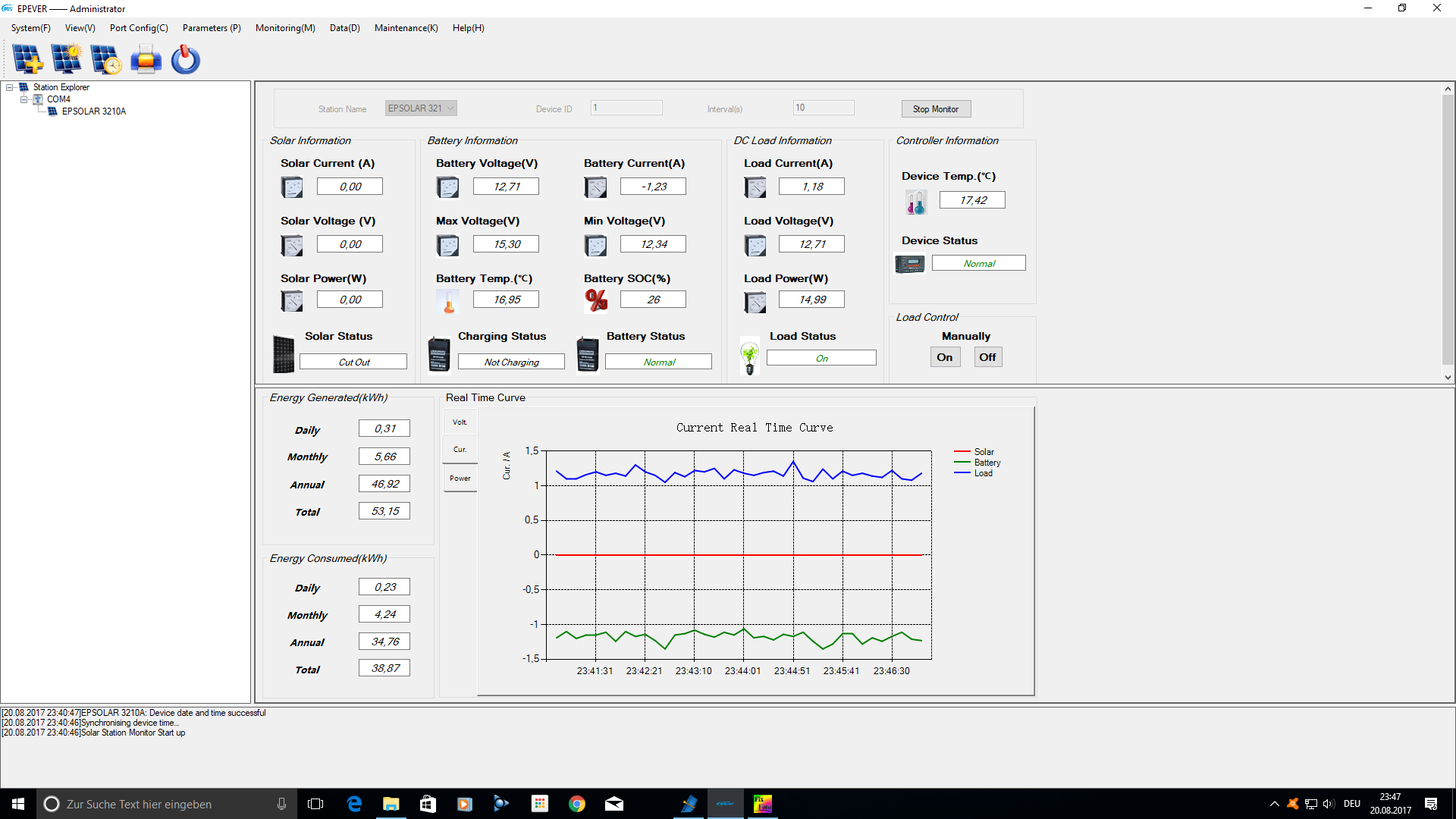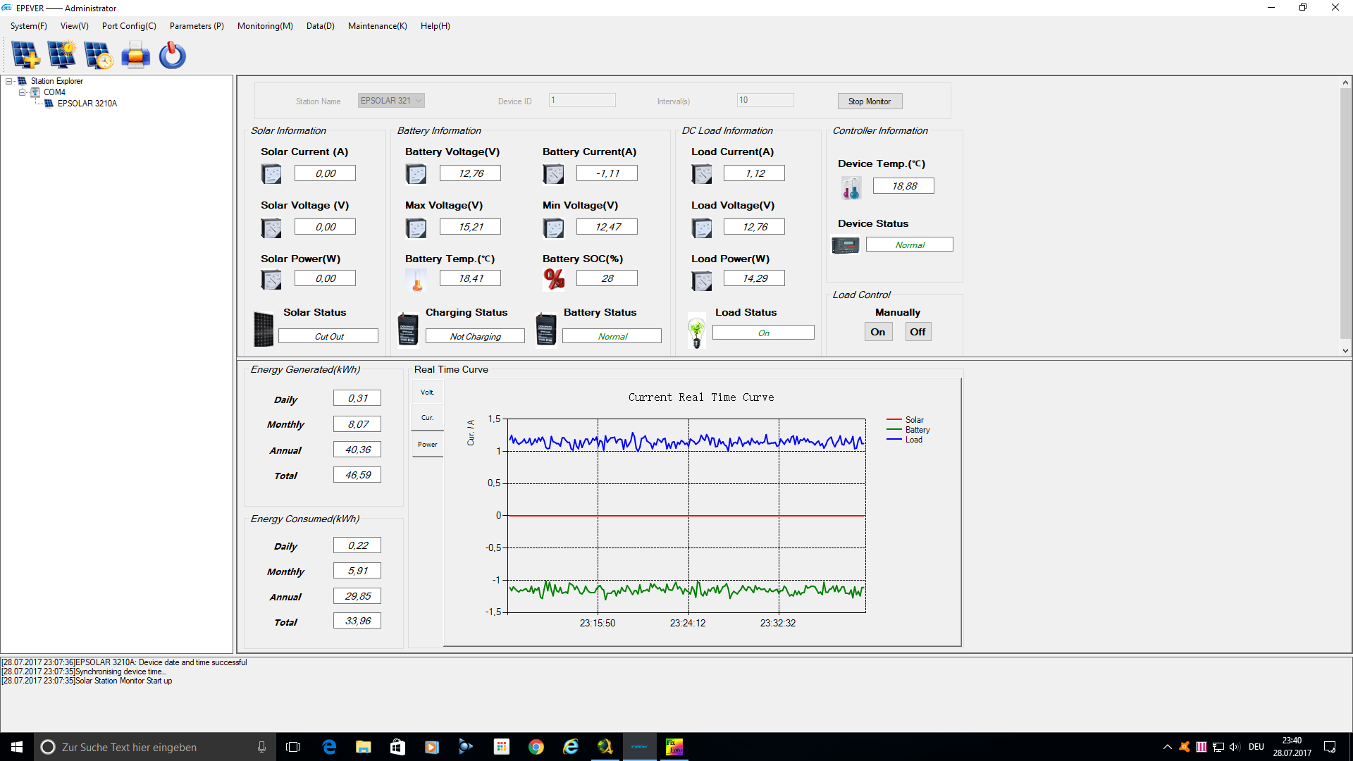 Tag 281 (Freitag, der 28.07.2017)- Schmuddelwetter mit 2 lichten Mini-Momenten. Aber Regen und Wolken satt standen heute auf dem solaren Speiseplan. Auffaellig war das die Helligkeit (ausser in den dunklen Phasen mit Regen) recht hoch war und die geschlossene Wolkendecke scheinbar doch einiges an Photonen durchkommen liess. Die Inselanlage hat bei diesem Kuddel-Muddel solide arbeit Geleistet und bis Mittags 310Wh produzieren koennen. Wieso keine 280Wh? Zu meinem Erstaunen hat die Anlage heute auf GASUNGS-LADUNG umgeschaltet. Das macht der EPSOLAR immer am 28sten eines jeden Monats um eine Schichtung der Saeure zu verhindern und auch die Kristall-Billdung auf den Bleiplatten zu unterbinden. Das hat die Anlage am 28 Juni nicht gemacht ( einige Tage nachdem ich den 2ten SOLIS-Akku parallel zum WINNER W100 angedockt hatte). Wieso das nun wieder mit der Automatischen GASUNGSLADUNG funktioniert entzieht sich meiner Kenntnis. Vielleicht braucht die Anlage nach mechanischer Kopplung der beiden Akkus samt Information des EPSOLAR das nun 2 Akkus a 100Ampere im System haengen, ein paar Tage um das System vorsichtig einzufahren. Das koennte der Grund fuer das Ausfallen der Gasungsladung am 28 Juni gewesen sein ( ich ging faelschlicherweise davon aus das im Parallel-Betrieb die Gasungsladung am 28sten nicht mehr durchgefuehrt wird ). Nun am 28 July funktioniert das wieder und das wird sicherlich auch jeden weiteren Monat funktionieren. Somit kam heute etwas mehr zusammen, wobei aber das Wetter so schlecht wurde das nicht mehr viel mit GASEN war. Finde ich gut das es doch funktioniert und es nur eine Pause im letzten Monat gab...