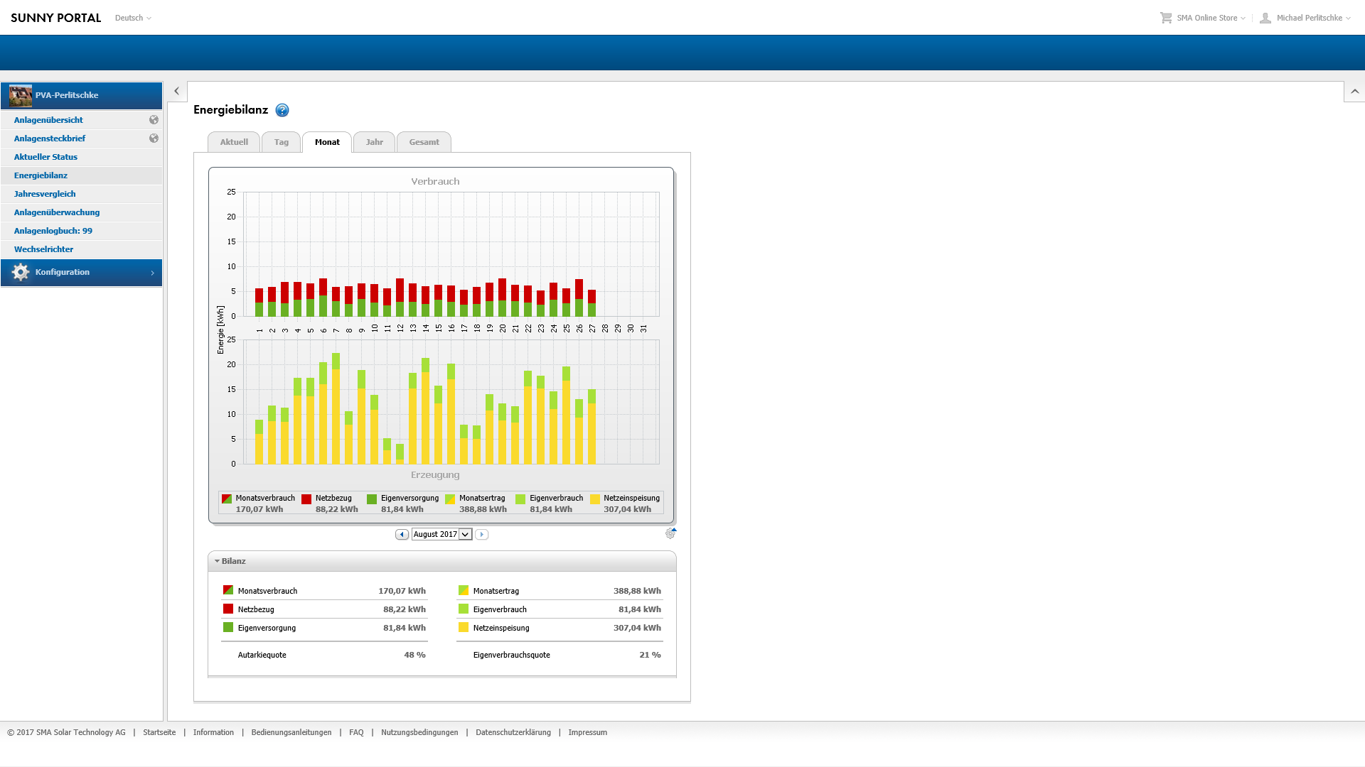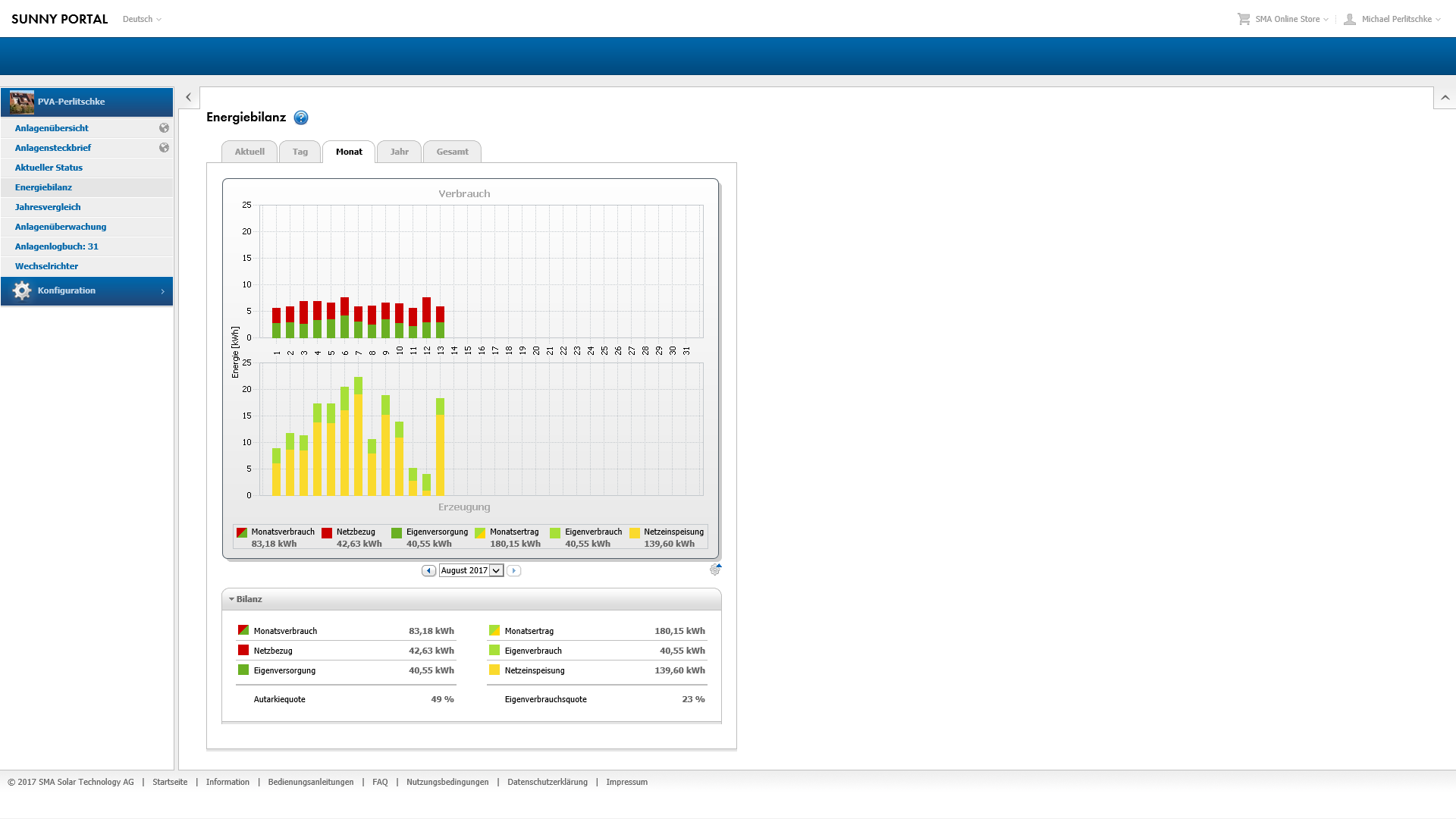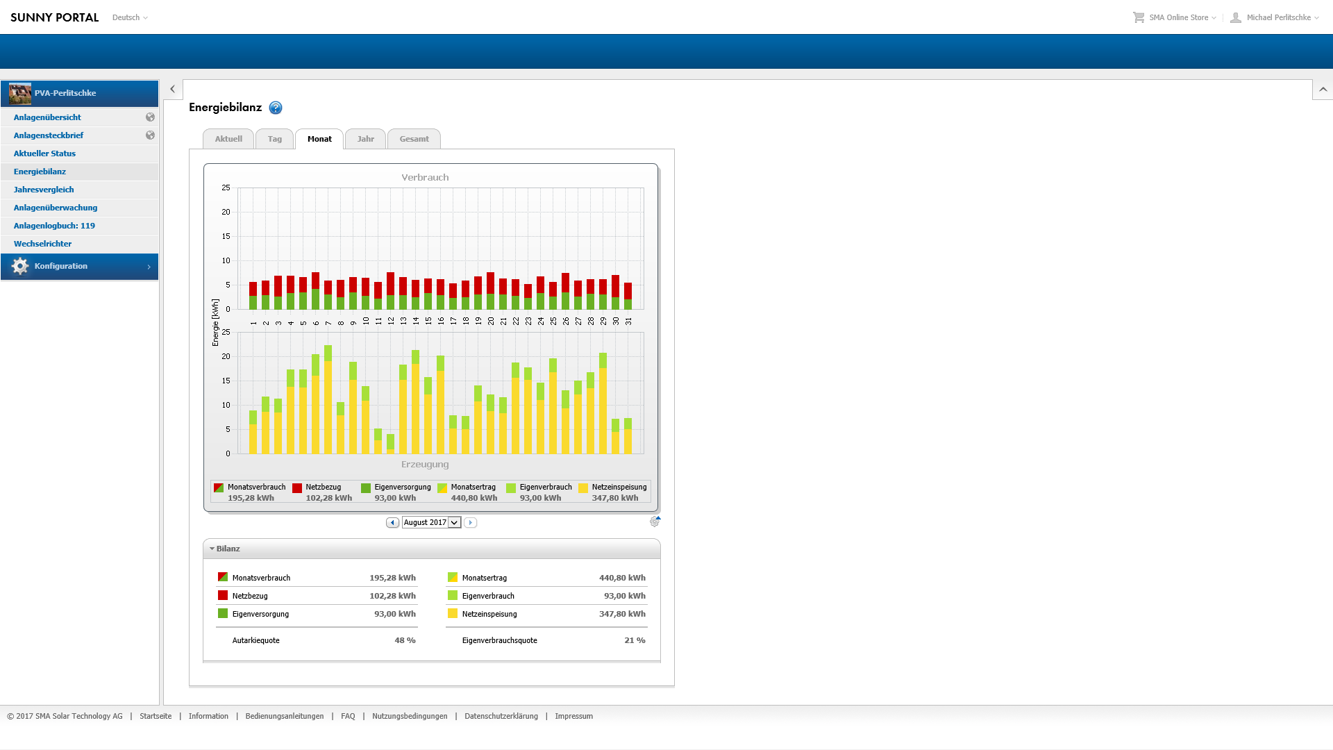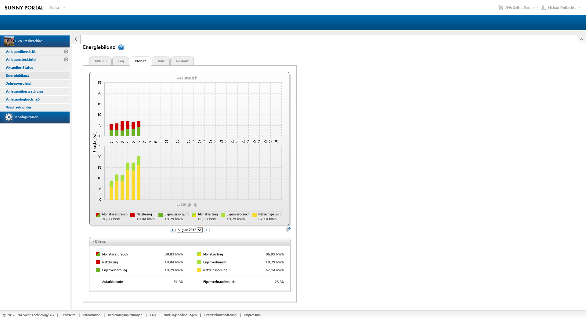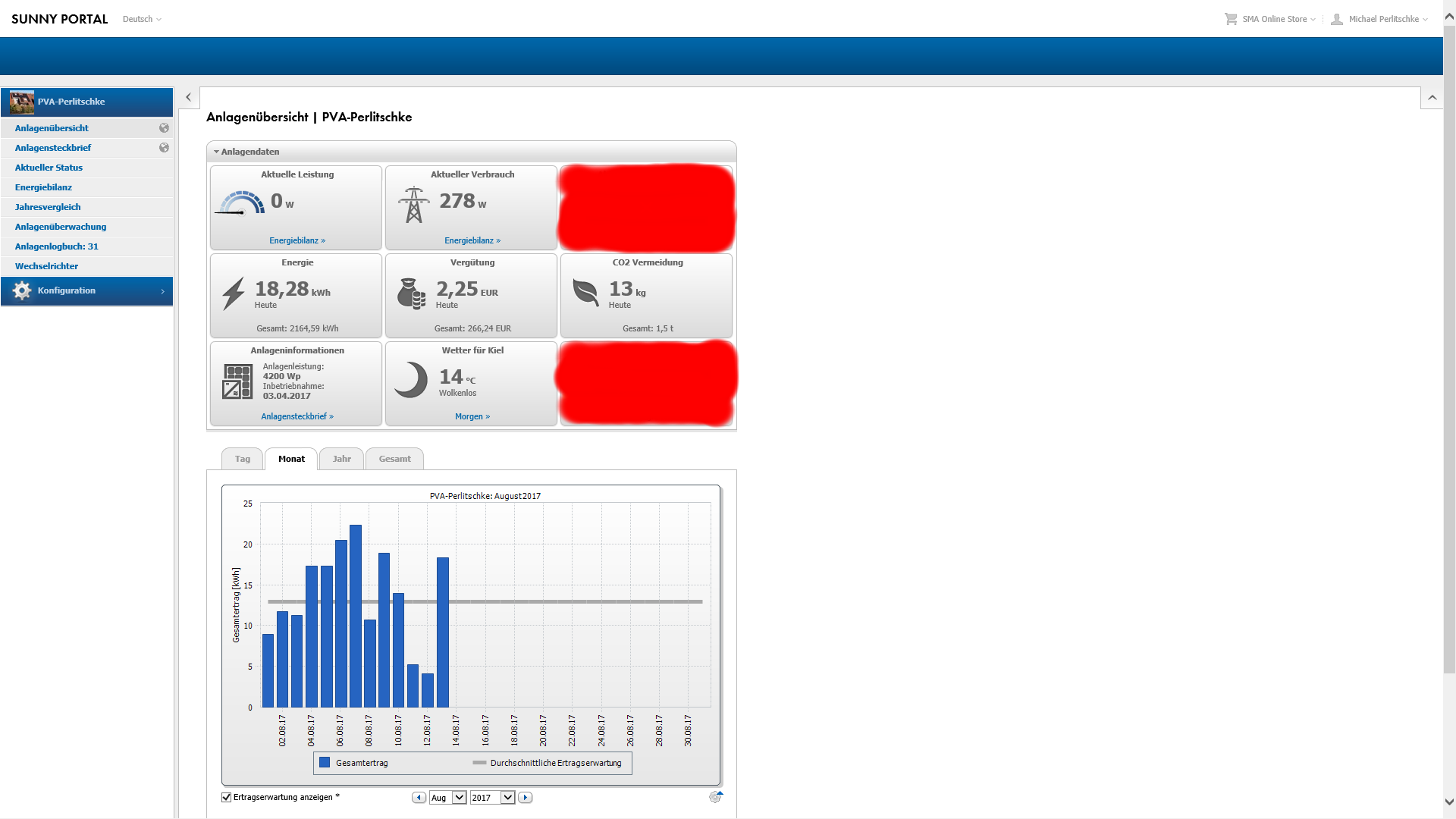D.h. fuer den August, das ich durch den Verkauf 17,22 Euro erwirtschaften konnte, aber fuer 13 Euro Strom zurueck kaufen musste. Nur ein mageres Plus von 4 Euro in 13 Tagen. Hierbei muss man aber beachten, dass ich keinerlei Kosten fuer Strom inform von Abschlagszahlungen hatte, die Instllation also den Bedarf voll decken konnte. Also dieser Posten der ohne Solar-Anlage aufgelaufen waere zu den 4 Euro hinzu addiert werden muss.
