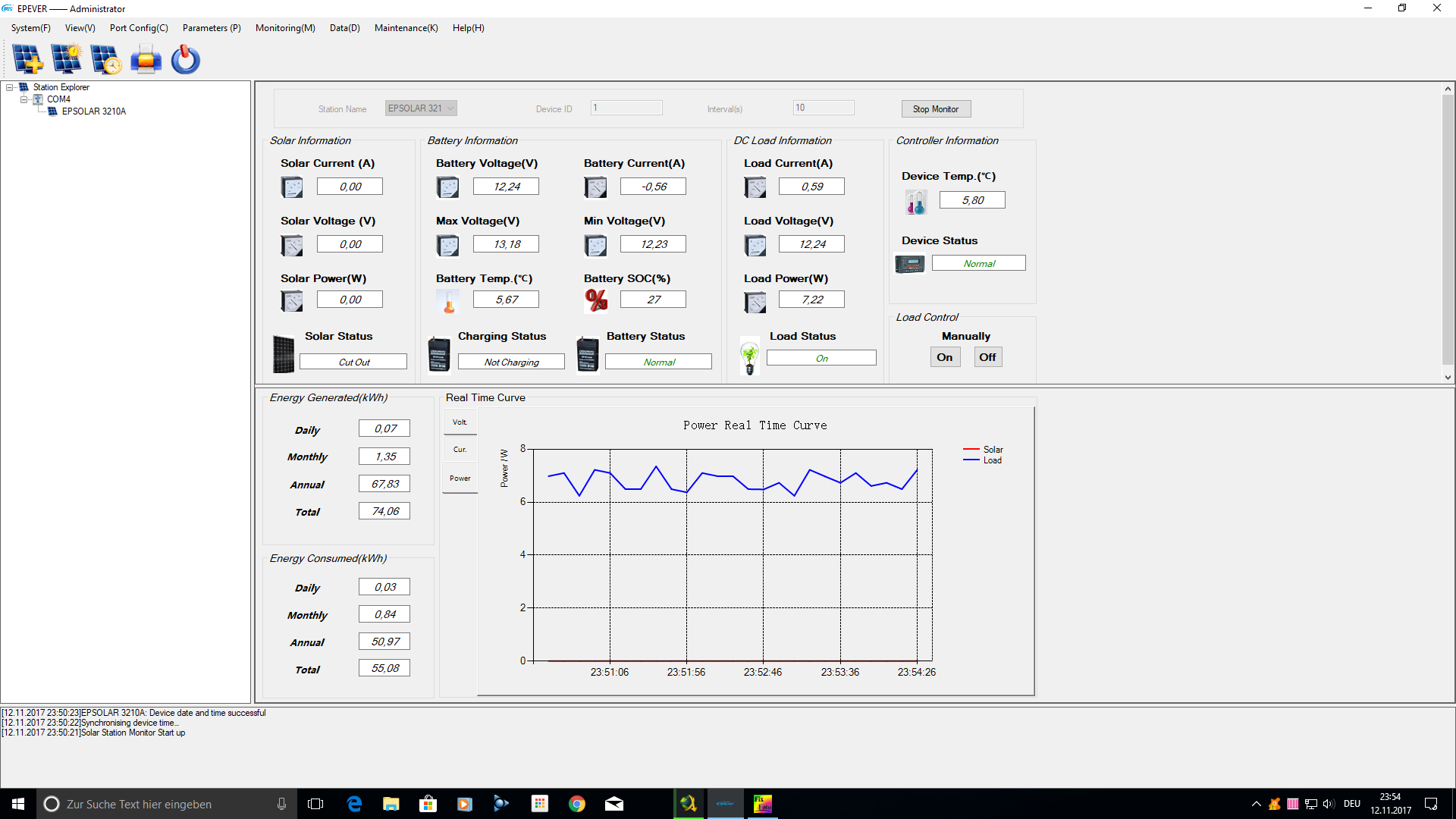 Uebrigens, solange der Raspberry PI laeuft, kann man nicht mehr wie bekannt mittels COM2TCP einen ComPort zum EPSOALR Tunneln und mit dem Windows SolarStationMonitor auf den EPSOLAR Laderegler zugreifen. Grund: Der Raspberry PI ist staendig mit dem EPSOLAR durch das Netzwerk und dem WLAN-Modul draussen im Schuppen verbunden. Um also konventiell an den EPSOLAR mittels SolarStation Monitor zu kommen, muss man den PI runterfahren und/oder vom Strom trennen. Dann ist der EPSOLAR resp. das Perle WLAN-Modul nicht mehr durch den PI3 blockiert und man kann wie gehabt mittels COM2TCP und SolarStationMonitor auf den EPSOLAR zugreifen. Eigentlich braucht man den SolarStationMonitor nur fuer die Batterie-Konfiguration oder um die Last Ferngesteuert EIN/AUSZUSCHALTEN, aber es ist schon wichtig das man im Bedarfsfall auch mit der Windows-Software zugreifen kann. Man muss aber wissen, dass das nur dann geht, wenn der PI ausgeschaltet ist.
