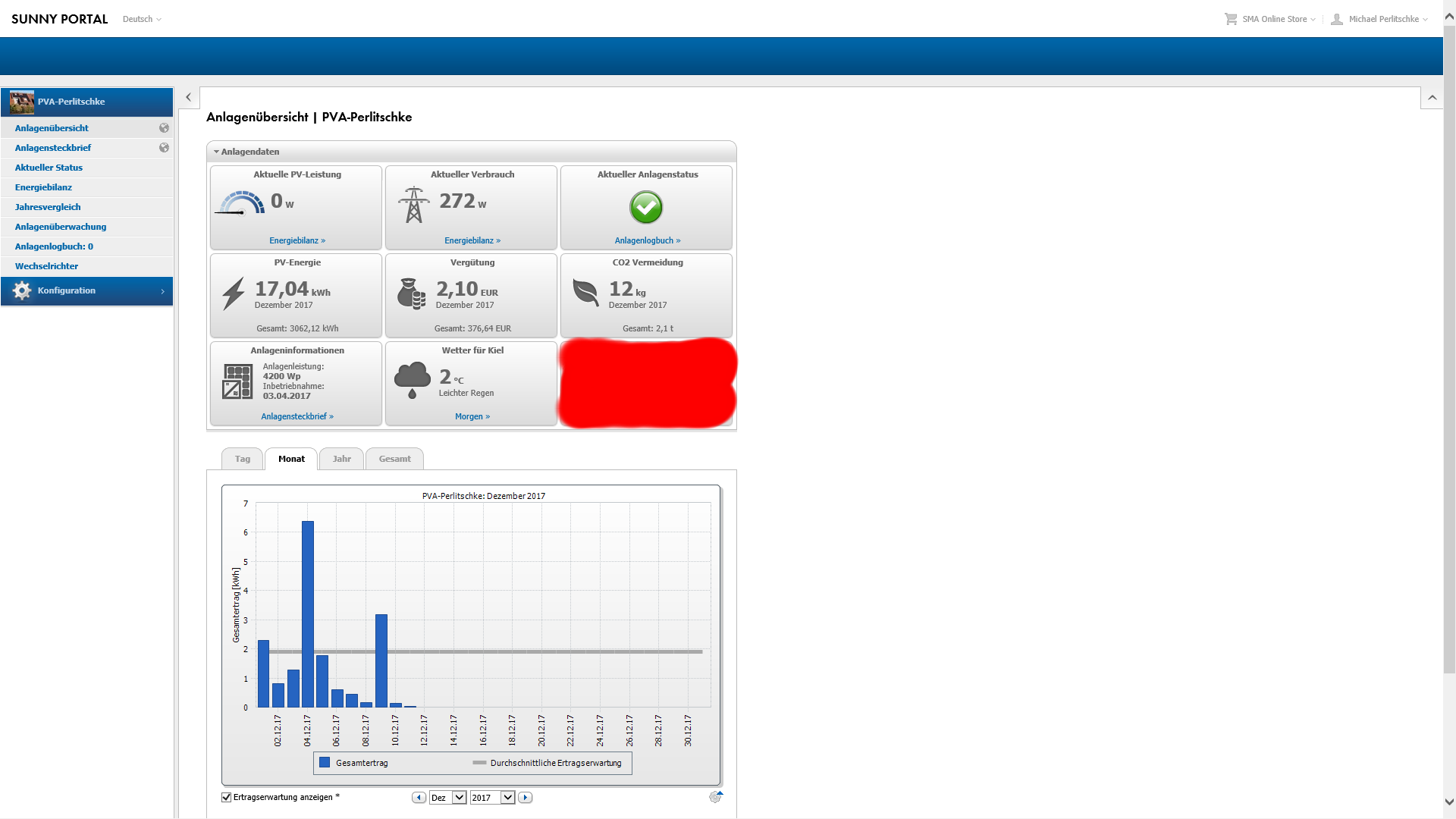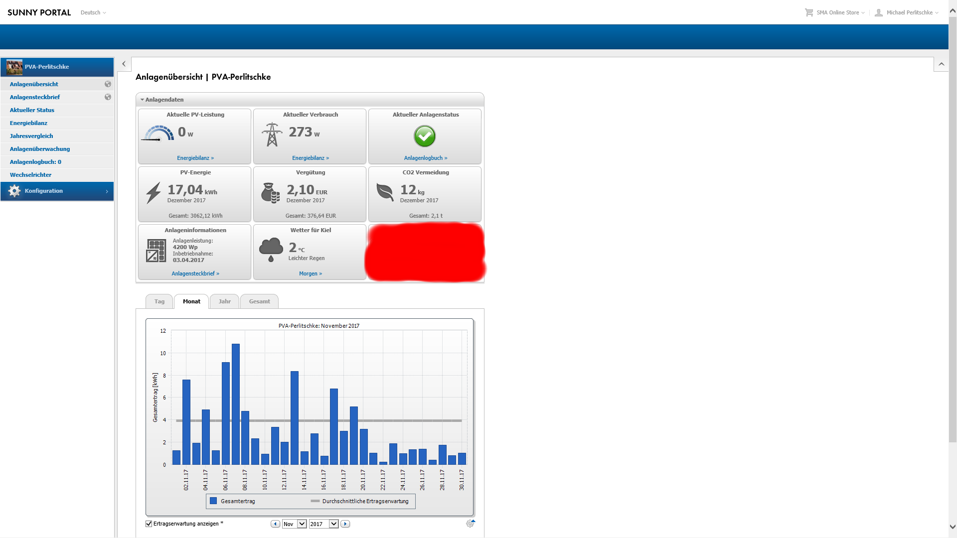 Hier die 4.2kwp Photovoltaik-Anlage auf dem Dach: Die Ertragserwartung fuer den November liegt bei nur noch 117,64kWh. Hier sieht man auch wie unguenstig dieser Monat aus solarer Sicht wirklich ist. Diese Woche kamen nur 27,7kwh zusammen. Und das bei 1 guten und 2 brauchbaren Tagen. Das uebertrifft die Anlage im Sommer an einem guten Tag