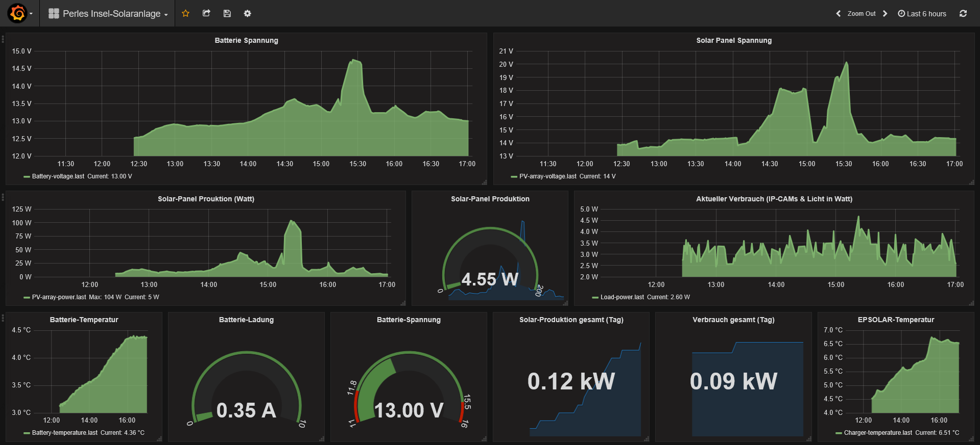 Und so wie es unten nun aussieht, bleibt es erstmal auch. Neben dem Download-Paket zum nachmachen, werde ich dann das Dashboard auch im Internet freigeben. Dann kann jeder selbst nachschauen wovon ich bei der Insel-Anlage und meiner Dachanlage (das laeuft ja schon lange ueber SMA und funktioniert auch sehr gut bei Euch) konkret rede und kann mir die Screenshots sparen. Desweiteren habe ich auch schon eine Loesung fuer das Problem des PI3 der ja im Betrieb den EPSOLAR dauerhaft blockiert. Wenn man den PI3 direkt nach draussen bringt und von der Insel-Anlage mit Strom vorsorgen laesst (die Datenuebertragung und Connect zum Router laeuft dann ueber das eingebaute WLAN-Modul im PI3), koennte man den per SSH ganz bequem ferngesteuert runterfahren (auch aus den USA ueber die sichere VPN Verbindung). Dann waere der EPSOLAR wieder frei fuer den getunnelten SolarStationMonitor den ich auch in den USA einsetze. Wenn man nun moechte, das der PI wieder neu starten soll schaltet man im SolarstationMonitor einfach die LAST (an dem der PI ja auch haengen wird) kurz AUS und wieder an. Dann startet der PI3 wieder ganz normal durch und uebernimmt seine normalen 24/7 Logging-Aufgaben. Ich habe eben mal den Stromverbrauch des PI nachgemessen und der duempelt zwischen 2,4 und 2,7 Watt herum. Also ideal um den von der Insel-Anlage dauerhaft mit Strom versorgen zu lassen. Da der PI3 mit 5 Volt betrieben wird, kann man diese 5 Volt mit einem Step-Down Converter-Modul welches die 12-15 Volt der Solarinsel auf korrekte 5 Volt runterschraubt erledigen ( ein aehnliches Modul habe ich in der Solarinsel ja schon im Einsatz um den beiden IP-CAM exakte 12 Volt zu liefern). Aber erstmal muss ich schauen, wie verlaesslich das ganze hier im Netzwerk funktioniert (derzeit flitzen die Daten noch mittels Ethernet provisorisch an einem meiner Tenda Gigabit Homeplugs im Bad uebers Stromnetz durch die Gegend)...