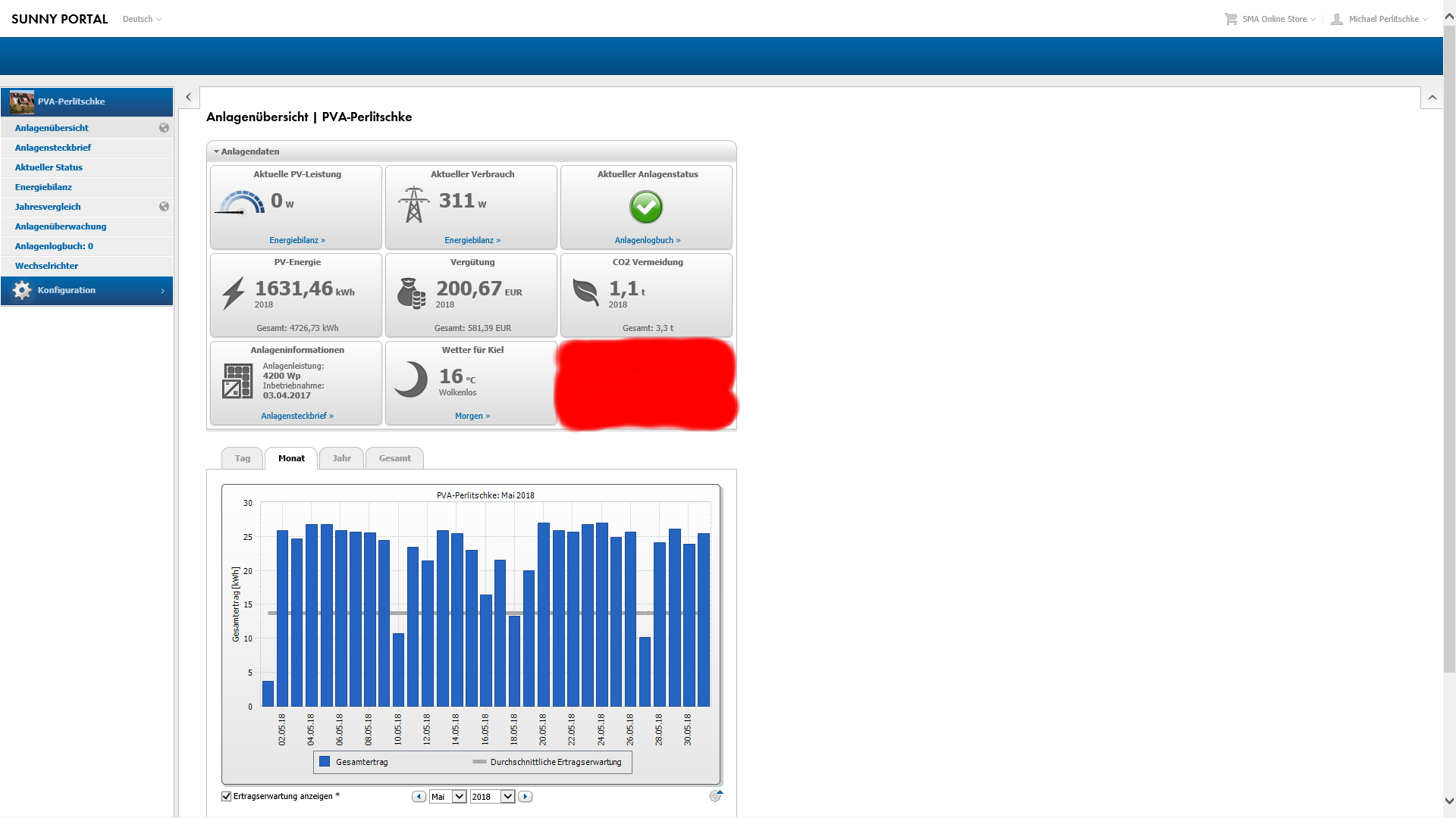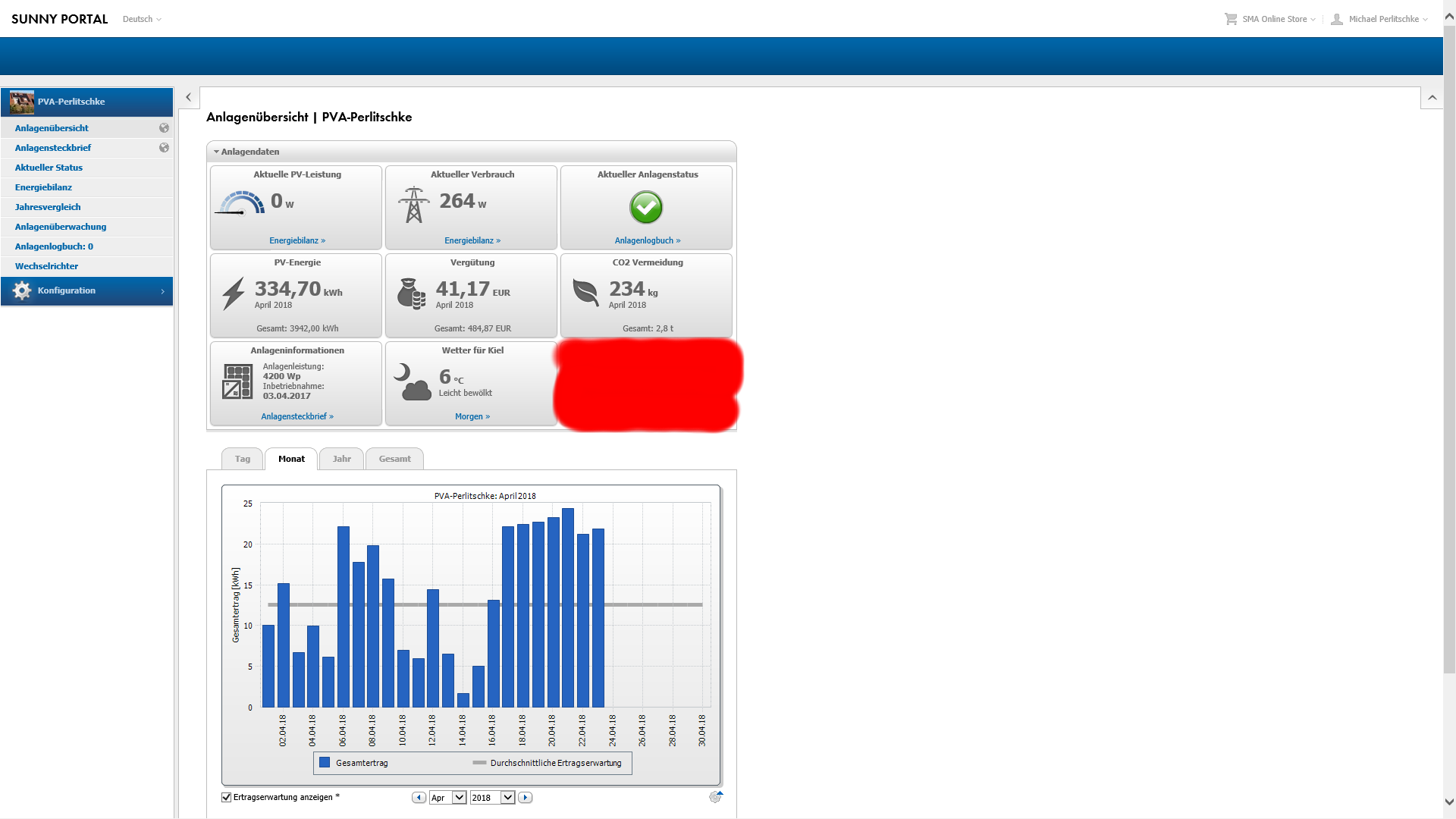 Die Anlage hat in nur 2 Monaten 1119,43kwh resp. 33% der angepeilten Jahresleistung vom Dach geholt (Jahresziel 3351,60kwh). Das zweite Produktionsjahr 2018/2019 (1 April 2018 bis 1 April 2019) beginnt also ausgesprochen erfreulich und mit einer dicken positiven Überraschung. Auch habe ich Euch mittlerweile mehr interessanter Live Daten freigegeben. Der langweilige Anlagensteckbrief mit Modulbezeichnungen und Wechselrichter Typ wurde stattdessen entfernt, aber dafuer der viel interessantere Jahresvergleich mit allen monatlichen Ertraegen freigegeben. Ihr koennt nun auch taeglich ganz genau schauen wo die Produktions-Ziele liegen; was vom Dach kam und wieviel seit der Inbetriebnahme an Strom vom Dach gekommen ist. So erhaltet Ihr einen rel. genauen Ueberblick ueber die Leistungsfaehigkeit dieser kleinen nicht perfekt ausgerichteten Anlage und was eine nicht perfekt ausgerichtete kleine PV-Anlage genau produziert hat. Mehr Transparenz geht nicht und ich denke es ist wichtig, damit Ihr erkennt, warum ich eine PV-Anlage betreibe und warum ich mit der Anlage auch als Investitionsgegenstand sehr gluecklich bin...