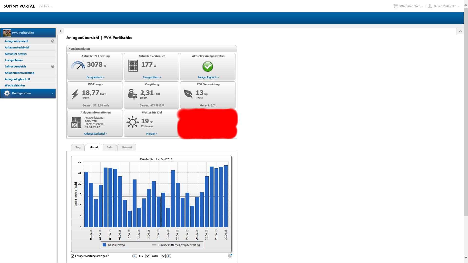 Hier die 4.2kwp Photovoltaik-Anlage auf dem Dach: Und jetzt kommen wir fast automatisch zur kleinen oder sollte man besser grossen Dachanlage schreiben? Im Juni kamen 569,78kwh vom Dach. Die Ertragserartung für den Juni lag bei 419,23kwh. Also hat die Anlage im Juni satte 35,91% mehr an Strom erwirtschaftet als Prognostiziert. Ein neuer Rekord auch zum Vorjahr Juni 2017 wo lediglich 20,43% über Projektion produziert wurde. Lustigerweise hat die Anlage am letzten Produktions-Tag, also dem 30 Juni ein neuen Tagesrekord produziert. Satte 28,20kwh kamen an diesem Tag vom Dach. NEUER REKORD SEIT DEM DIE ANLAGE LÄUFT! Der Stromzukauf von den Stadtwerken im Juni (Nachts) lag bei 88kwh was ca. 26,40 an Kosten bedeutet. Von den produzierten 569,78kwh habe ich selbst 113kwh verbraucht (Autarkiequote=56%) was eine Ersparnis von 33,90 Euro ergibt und 456,84kwh für 0,123 Cents verkauft (Eigenverbrauchsquote=20%) was letztendlich 56,20 Euro Einnahmen bedeutet. Dieser Juni lag also deutlich über dem des Vorjahres, da ca. 10% mehr an Strom produziert wurde. Wie gesagt, in Summe lag der ungeplante Überschuss für den Juni 2018 bei ca. 36%. Ein fantastisches Ergebnis und die Dachanlage zeigt mal wieder erneut was selbst mit einer so kleinen Anlage alles machbar und möglich ist. Ganz toll!!!
