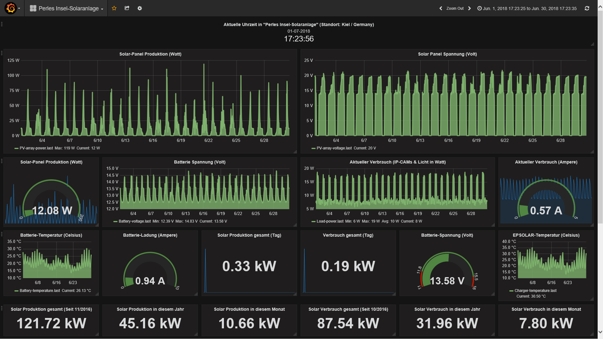 Somit kann ich die Last der beiden Kameras ganz bequem ueber den ohnehin 24/7 laufenden Raspberry PI steuern und wenn die Energie knapp wird Strom dynamisch einsparen. Ein entsprechendes YouTube Video werde ich natuerlich auch produzieren damit jeder den soetwas interessiert alles nachbauen kann. Ja, die kleine Insel-Solaranlage wird langsam aber sicher immer flexibler und interaktiver. Ich schaetze mal das ich eine Kamera ab mitte oder Ende Oktober trennen muss und Ende November dann auch die zweite Kamera temporaer vom Netz nehmen muss ( also immer wenn jemand hier ist) um Strom zu sparen. Nur Nachts und in Zeiten wo niemand hier ist wird die Hauptkamera natuerlich laufen. Damit man mich nicht mittels Grafana ausspaehen kann z.B. um zu schauen ob jemand hier ist oder nicht und ob die Kameras laufen oder nicht, werde ich irgendwann im November den Online-Zugriff auf den Raspbeery Pi bis Febuar 2019 fuer die Oeffentlichkeit deaktivieren. Also den Account "Forum" Passwort "Forum" in Grafana temporaer loeschen. Ob ich das mit der Einbindung des Relail-Boards noch vor dem Urlaub schaffe wage ich zu bezweifeln (denn es muessen Webseiten erzeugt werden wo ich dann per Mausklick die Verbraucher KAMERA 1 und KAMERA 2 "AN" und "AUS"schalten kann und ein paar Funktions-Tests durchgefuehrt werden inkl. einer Beschreibung und allen Files wie das jeder genauso nachbauen und umsetzen kann.