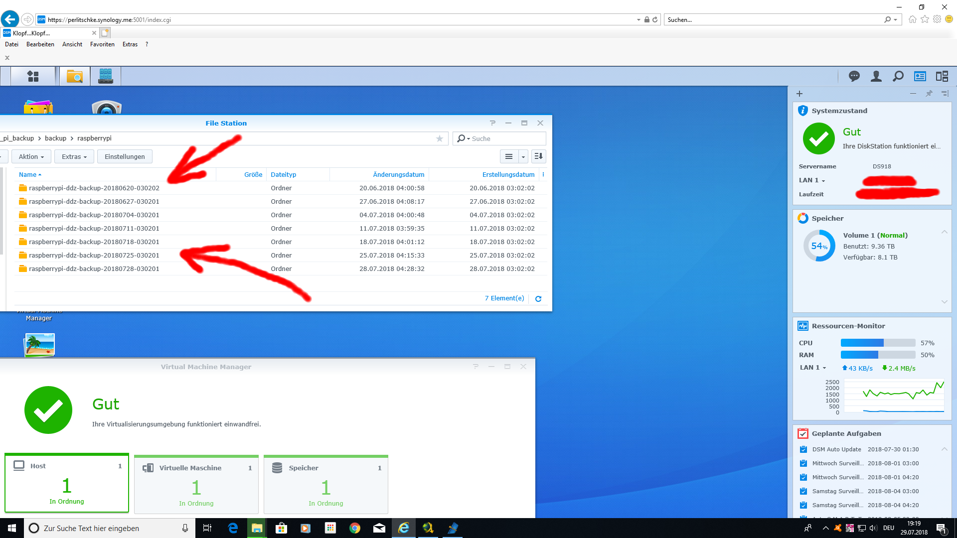 Da das mit den automatischen Wochen-Backups (pro 16GB SD-Kartenbackup uebertragt der PI gepackt 2,8GB in die Synology) so prima und Reibungslos funktoniert, habe ich im PI eine Erweiterung vorgenommen. Nun wird 2mal pro Woche ein Komplett-Backup in die Synology uebertragen und immer die letzten 10 Backups vorgehalten. Sollte das 11 Backup durchgefuehrt werden loescht der PI das aelteste Backup automatisch. Somit kann ich bei technischen Problemen zukuenftig die Ausfallzeiten auf wenige Tage minimieren...