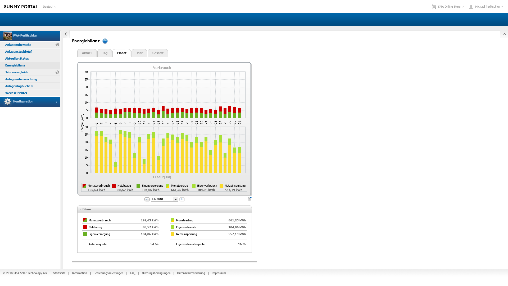 Der Stromzukauf von den Stadtwerken im Juli (Nachts) lag bei 88,69kwh was ca. 26,61 an Kosten bedeutet. Von den produzierten 661,25kwh habe ich selbst 104,06kwh verbraucht (Autarkiequote=54%) was eine Ersparnis von 31,22 Euro ergibt und 557,19kwh für 0,123 Cents verkauft (Eigenverbrauchsquote=16%) was letztendlich 68,53 Euro Einnahmen bedeutet. Dieser Juli lag also dramatisch ueber dem des 2017 Vorjahres, da ca. 35% mehr an Strom produziert wurde. Wie gesagt, in Summe lag der ungeplante Überschuss für den Juni 2018 bei ca. 54,74%. Ein aussergewoehnliches Ergebnis welches dem aussergewoehnlichen Wetter geschuldet ist. Wieder einmal ganz toll!!!