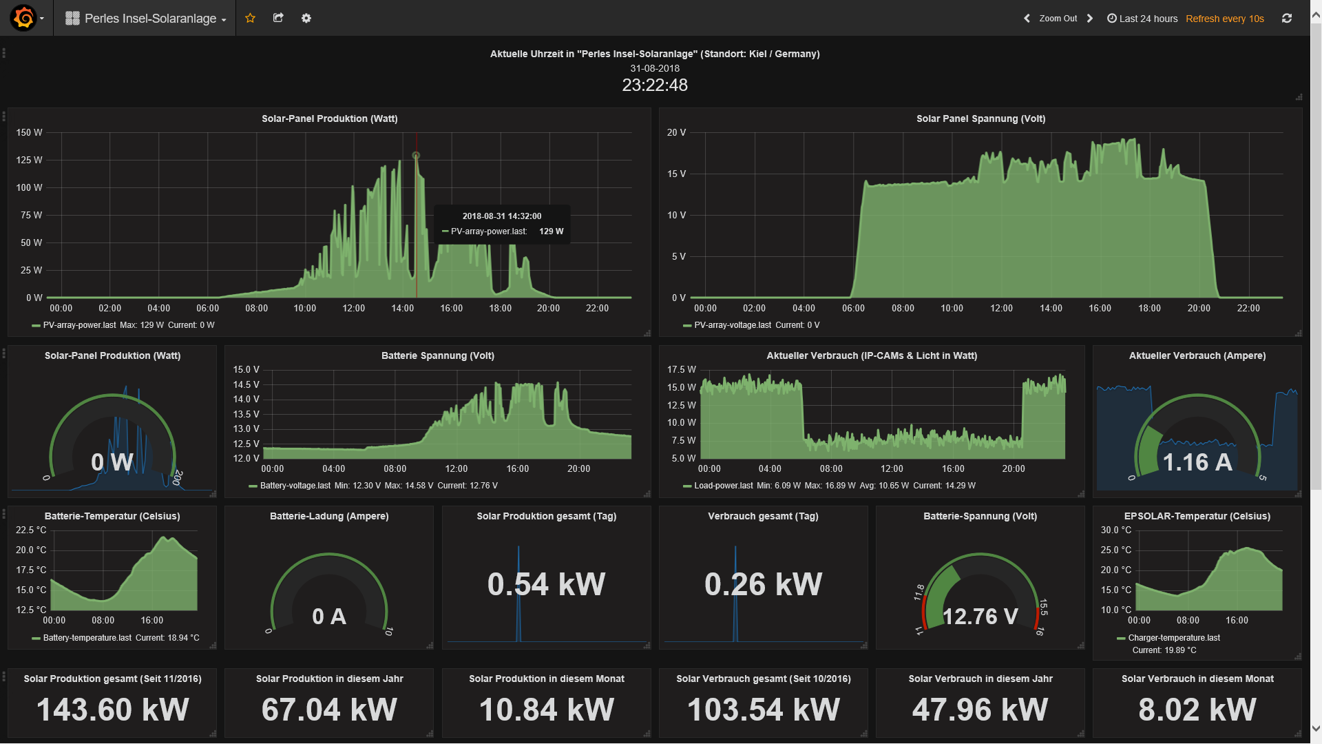 Die kleine 200 Watt Insel-Solaranlage: Natuerlich zeigte sich meine Inselanlage unbeeindruckt, denn diese produzierte schnell und solide die taeglich benoetigten 370Wh an Strom ( 270Wh werden benoetigt) und verbrannte wieder einmal alles andere ungenutzt im Solarregler. Der 30 August (ein uebel schlechter Tag) hat nur zu mageren 70Wh gefuehrt sodass sich die Anlage aus den Akkus bedienen musste. Einen Tag spaeter also am letzten Tag im August (heute) wurden von den Panels bis zu 125 Watt abgerufen und ueber den Tag 540Wh in die Akkus und das System gepumpt. Der schlechte Tag gestern (30 August) wurde also problemlos zu 100% kompensiert. Wirklich beeindruckend was die kleine Anlage produzieren kann und auch beeindruckend wie solide das ganze ueber den kompletten Monat funktioniert. Allerdings darf man nun nicht vergessen das die Tage deutlich kuerzer werden und der Stromhunger insbesondere Nachts bei ca. 17-18 Watt liegt. Das wird die Anlage auch noch im September schaffen, aber ab Oktober wird es dann haarig und ich werde Verbrauchsseitig gegensteuern muessen.