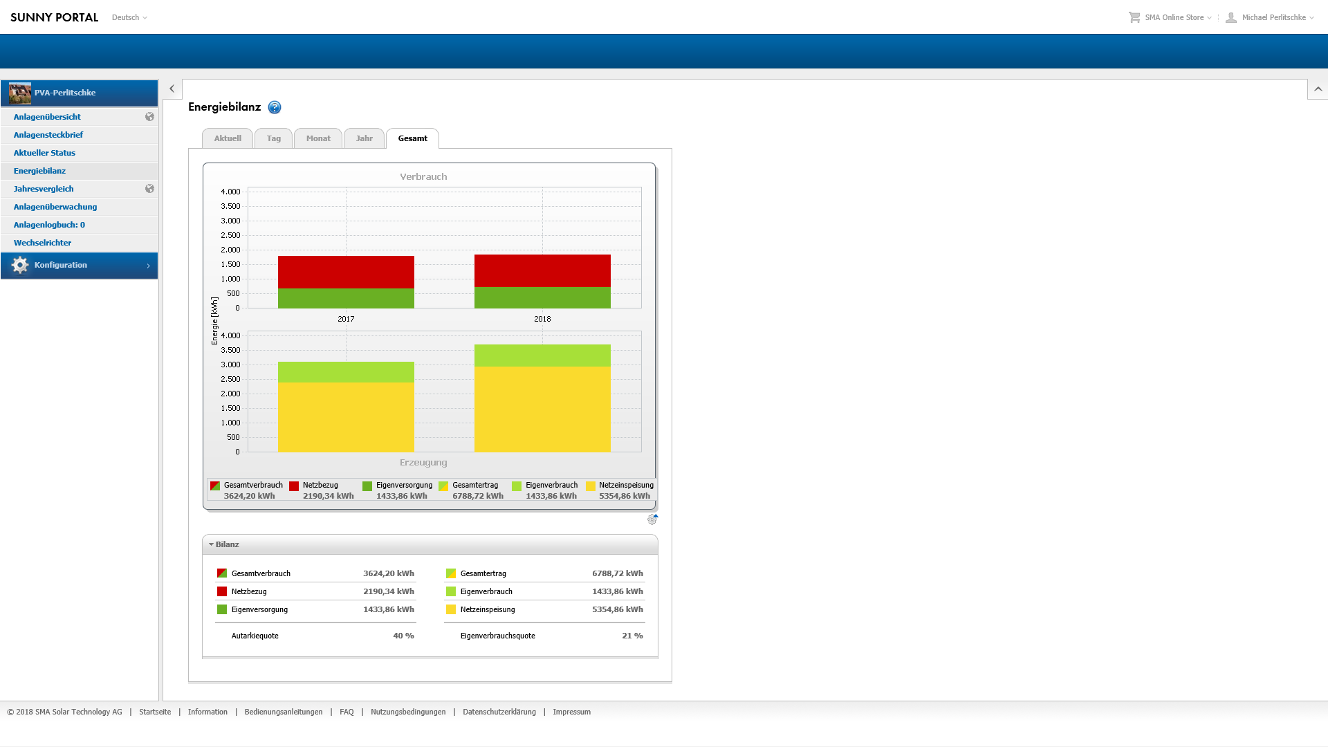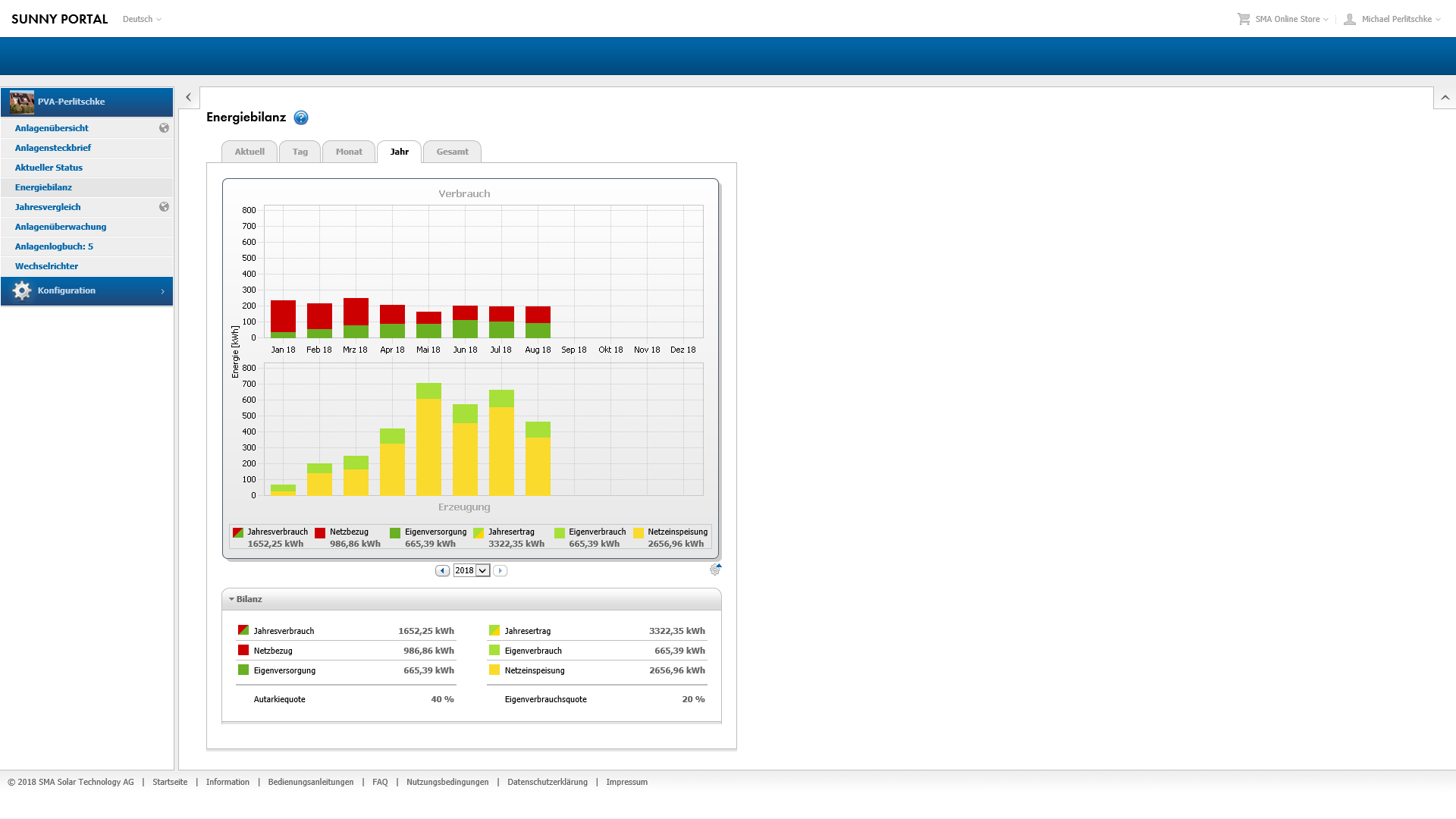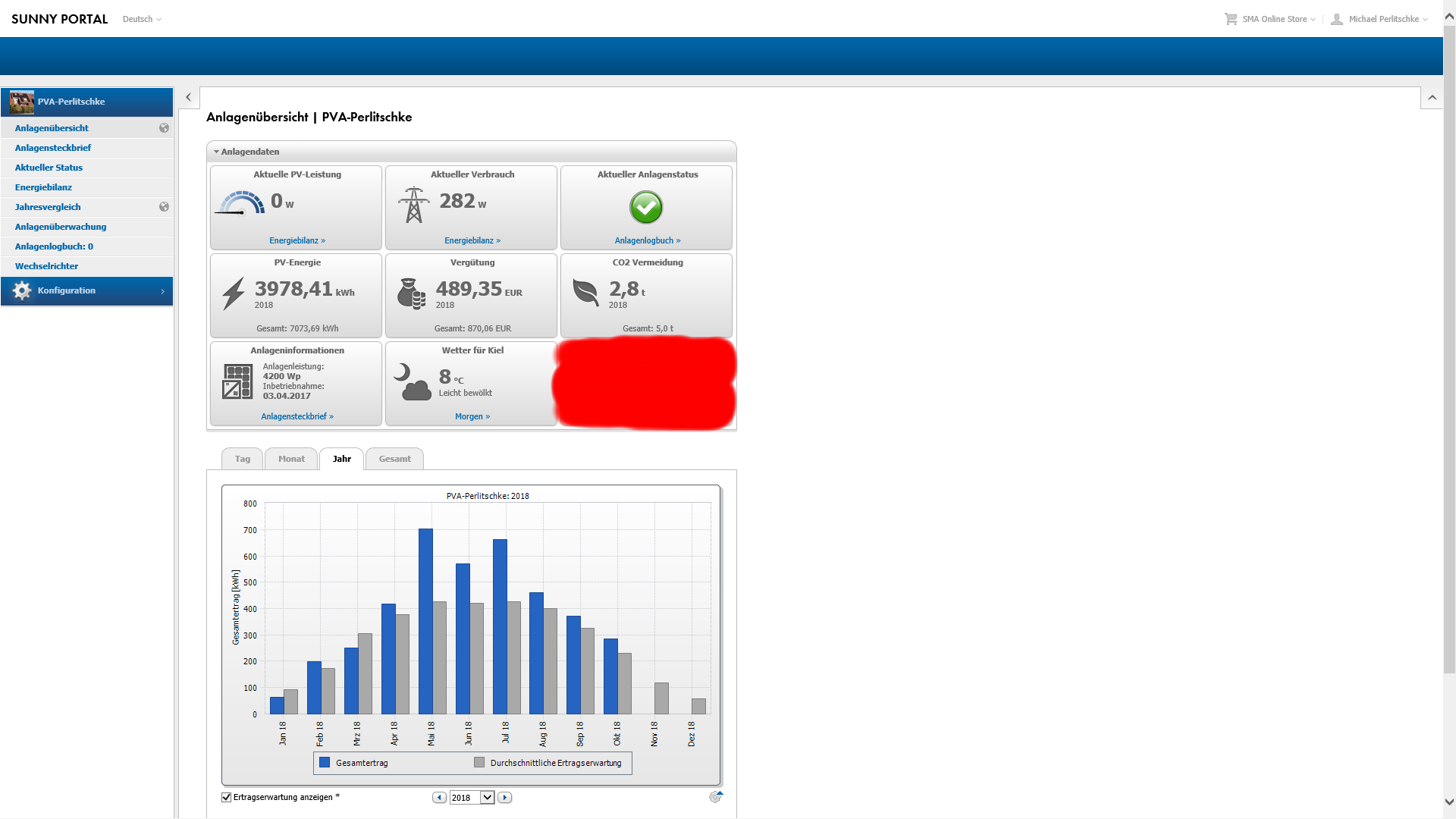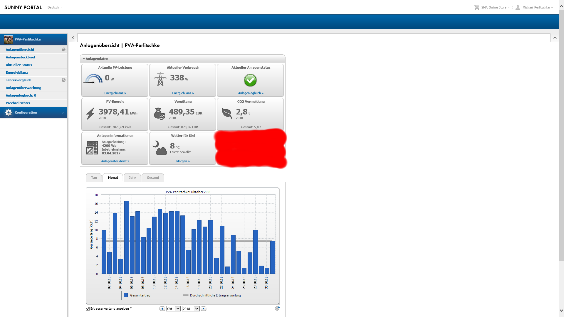 Die Anlage hat nur in den ersten 7 Produktions-Monaten 3466,38kwh resp. 103,42% der angepeilten Jahresleistung (April 2018 bis April 2019) vom Dach geholt (Jahresziel 3351,60kwh). Unglaublich, denn nach knapp 7 Monaten ist das 12 Monats-Ziel geknackt. Alles was nun im November; Dezember; Januar; Februar und Maerz kommt ist zusaetzlicher ungeplanter Gewinn. Uebrigens: Fuer das Jahr 2018 (Januar bis Heute) hat die Anlage 3978,41kwh vom Dach geschaufelt und obwohl der Januar & Maerz so schlechte Ergebnisse produzierten musste ich ich bis heute keinen Pfennig fuer meinen Stromverbrauch bezahlen. In ca. 14 Tagen also um den 15 November wird der Tag kommen an dem ist das erste mal im Jahr 2018 (Januar bis heute) wieder fuer den Strom etwas bezahlen werde. Das bedeutet das ich nur 5 Wochen in Jahr 2018 den Bezugsstrom zu zahlen habe. Die restlichen 47 Wochen war der Strom kostenlos (durch den Stromverkauf). D.h. pro installierten Kilowatt Peak werden das bis Dezember mehr als >1100kwh werden! Eine exellente Performance fuer den Standort Kiel. Aber auch hier darf man nicht vergessen, dass wir ein erstklassigen perfekten Ausnahme-Sommer hatten. Dennoch Respektabel was die Anlage zu leisten imstande ist. Besonders spannend ist aber das 2te Geschäftsjahr der Anlage also von April 2018 bis April 2019. Also besonders der Februar und Maerz als Ertragstraechtige Produktions-Monate. Da koennen ab heute wenn alles gut laeuft nochmals 700kwh zusammen kommen...man darf sich also schon jetzt freuen. Die Anlage produziert nun seit einigen Tagen ungeplante Zusatzgewinne und auf das Jahr gesehen gab es 47 Wochen allen Strom kostenlos. Es ist also nur noch die Frage wieviel Prozent die Anlage im zweiten Produktions-Jahr ins Plus rauscht. The sky is the limit... :D