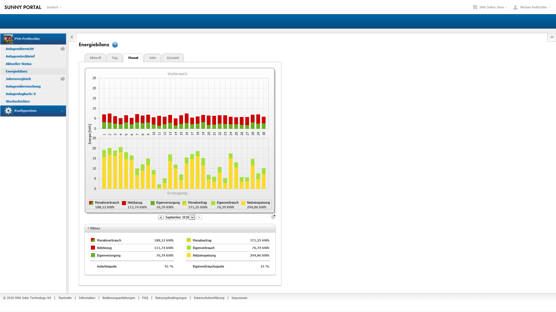 Hier die 4.2kwp Photovoltaik-Anlage auf dem Dach: Nun aber zur kleinen aber fuer mich grossen 4,2kwp Dach-PV Anlage. Wir kennen ja schon den Screenshot von Oben wo man sieht wie das Wetter war. 15 Überdurchschnitte Tage; 5 neutrale Tage und 10 schlechte Tage sind das Ergebnis fuer den September. Im 2017er Vorjahr lag der Ertrag fuer den September knapp unter der Ertragserwartung bei 318,92kwh (324,77kwh ist die Ertragserwartung) und diesen September hat die Anlage 371,25kwh vom Dach geholt. Das liegt 16,4% ueber dem Ergebnis vom Vorjahr und 14,% ueber der Projektion.