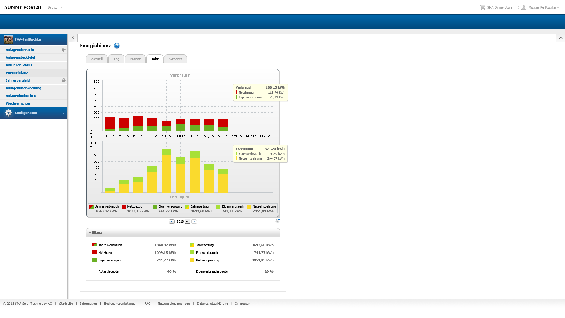 Uebrigens, Ihr wisst ja das ich immer komplette Produktions-Jahre hier beschreibe. Diese gehen von 04/1018 bis 04/2019. Wuerde ich aber vom Jahresbeginn aus rechnen, hat die Anlage die fuer das komplette Jahr 2018 veranschlagten 3351,60kwh laengst erreicht und eindrucksvoll ueberschritten. Denn es kamen vom 1 Januar bis 30 September sensationelle 3693,60kwh vom Dach. Aber diese Information nur so nebenbei und kommen wir wieder zu unserem Abrechnungszeitraum September 2018 fuer das Produktionsjahr 04/2018 bis 04/2019 zurueck...