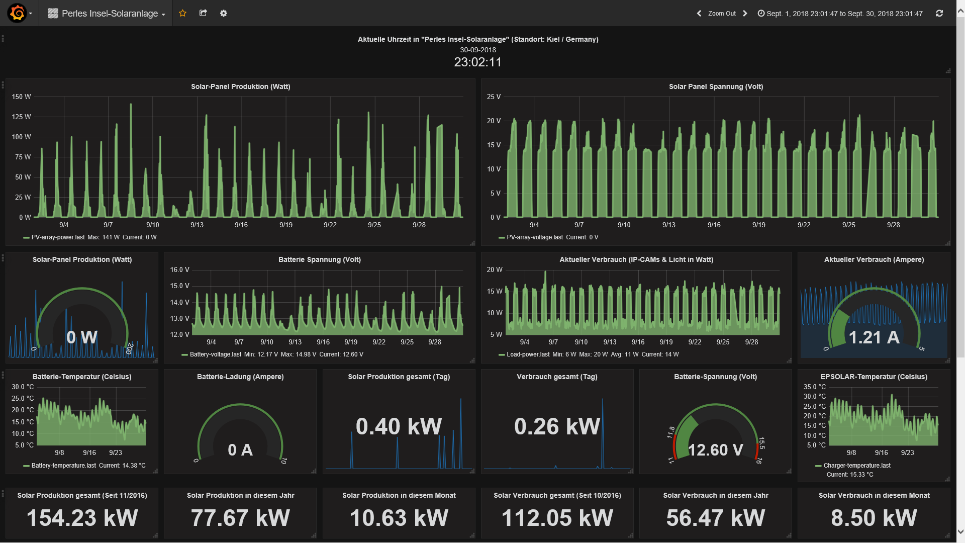 Die kleine 200 Watt Insel-Solaranlage: Gewohnt suveraen hat sich die kleine Insel-Solaranlage geschlagen. Ab dem 20 September also die letzten 10 Tage wurde das Wetter aber dramatisch schlechter und es kam nicht viel an Energie in die Akkus, was bedeutet, das selbige kraetif zubuttern mussten. Schien mal die Sonne so wurden an einem Tag sogar 600Wh produziert und in die Akkus geleitet. Also die Insel-Anlage zeigt deutlich die schrumpfenden Tageslichtzeiten auf (und diese werden merklich sehr schnell kuerzer) und ist am kaempfen die nun immer weiter steigenden Verbraeuche der Hauptverbraucher (die 2 IP Kameras) zu bedienen. Noch funktioniert das ganze, aber wenn mal 3 aus dem Akku zugebuttert werden muss sind in kuerze die 50% Akku-restkapazitaet erreicht. Einmal sah ich morgens sogar 12,20 Volt unter Last was bedeutet das aus den Akkus schon ordentlich Energie rausgezogen wurde. Hier mal ein Screenshot mit dem monatlichen Verlauf: