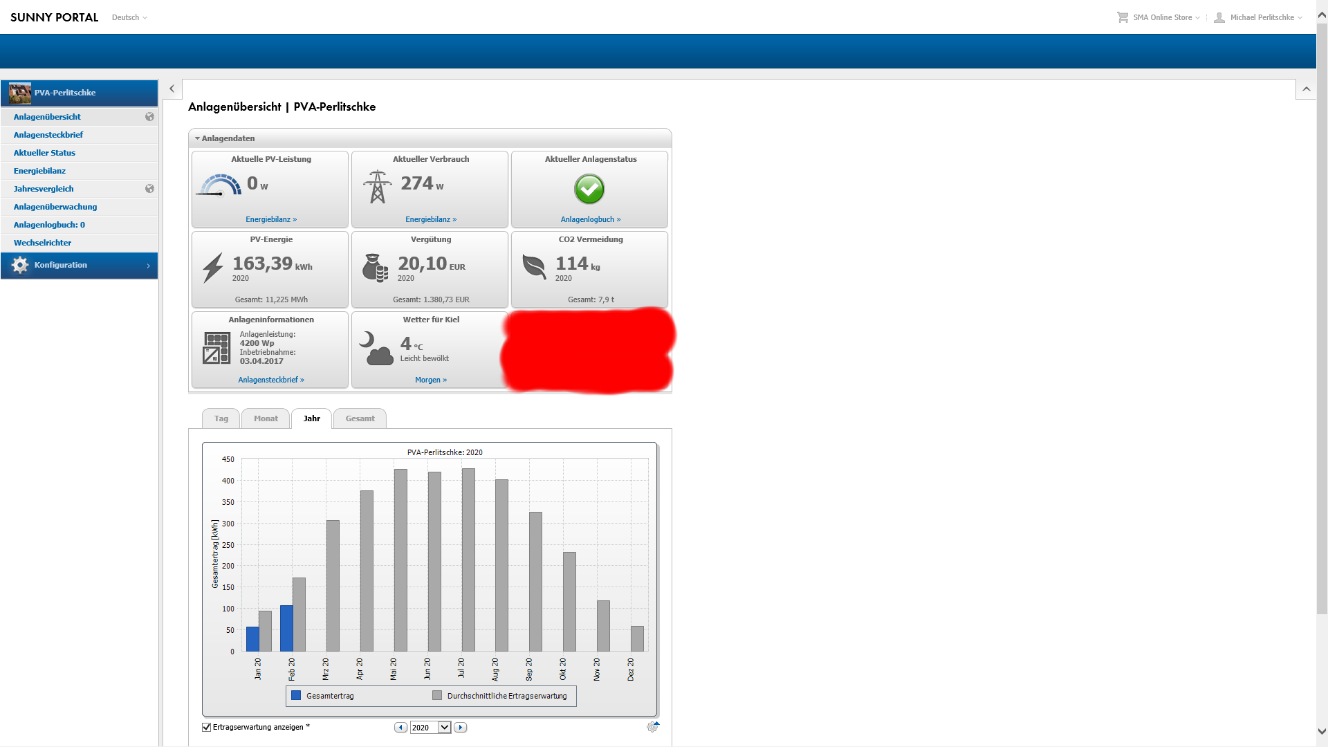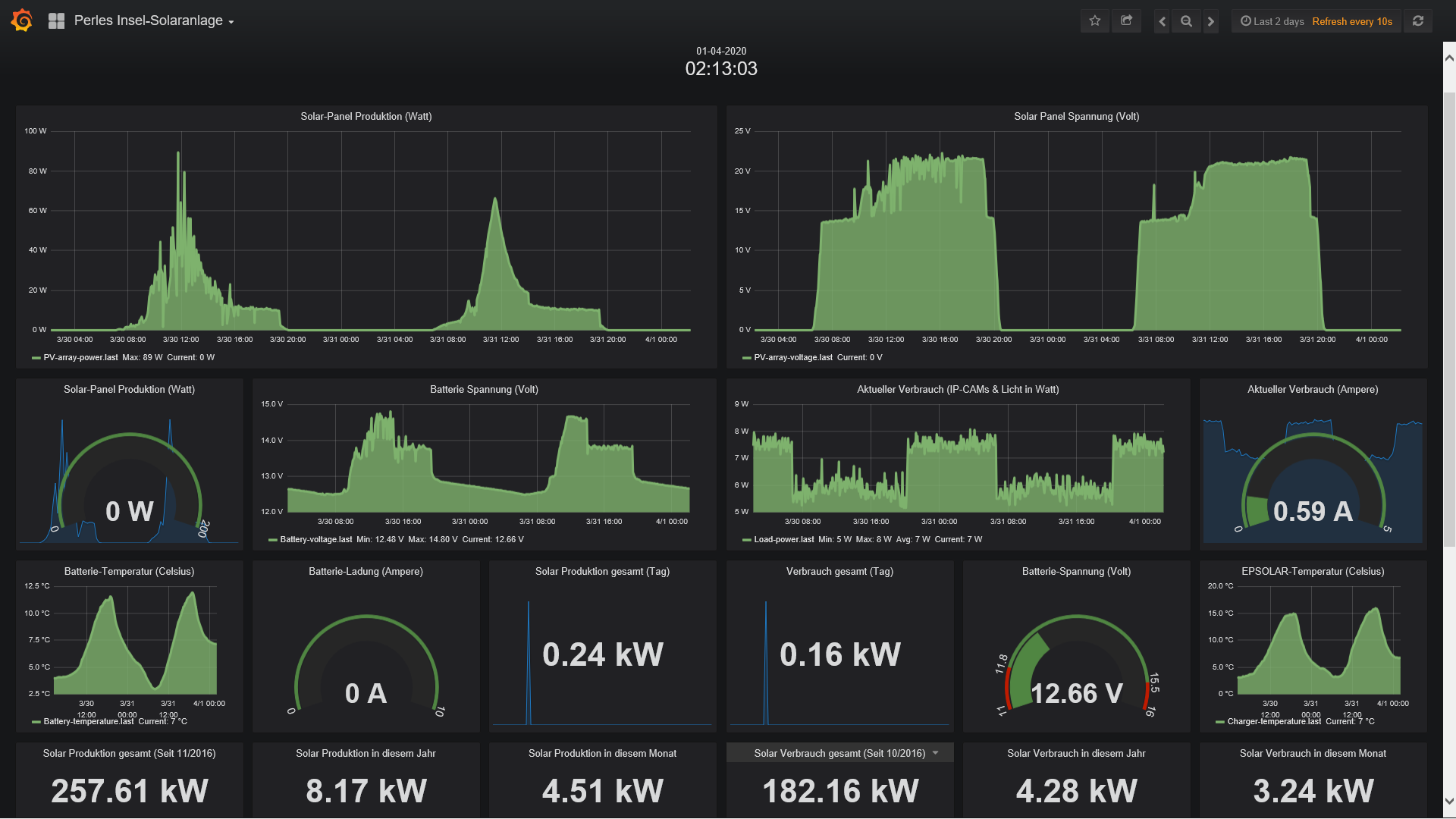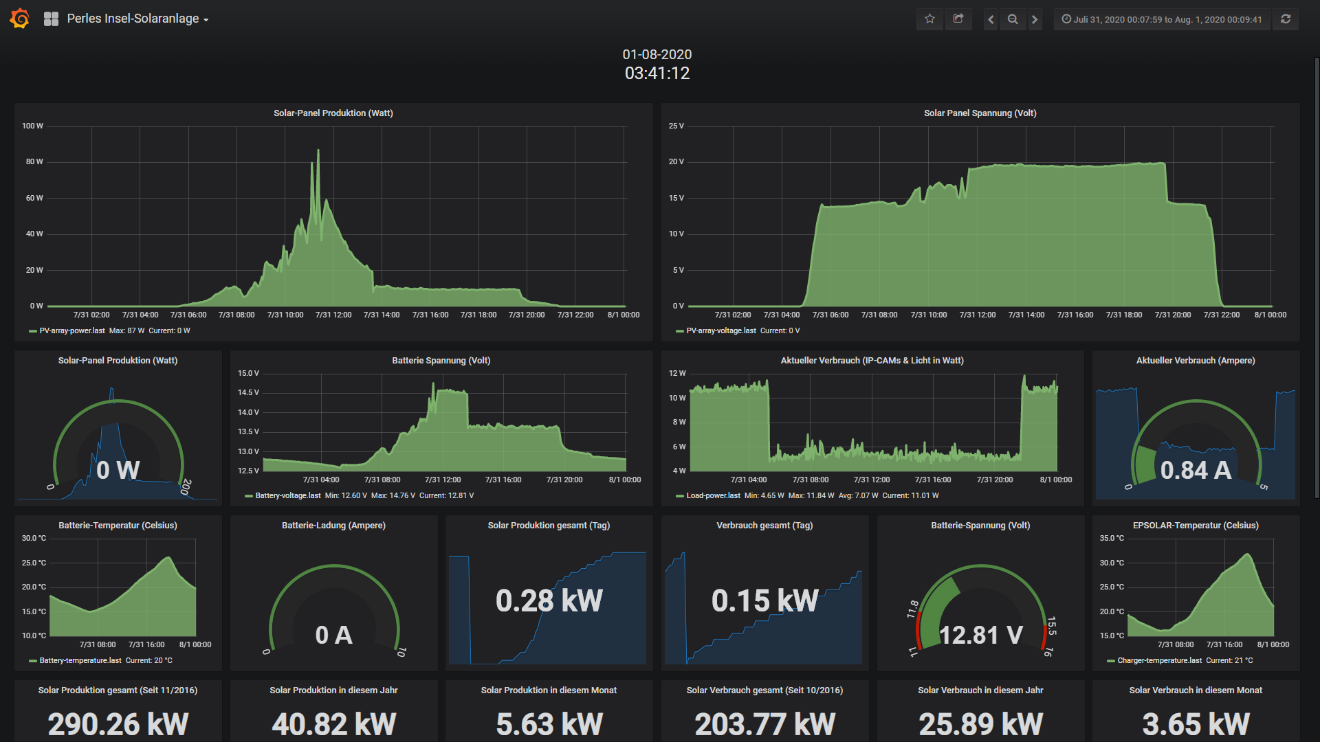 Inselanlage ist seit 13.03. wieder Online...Michael hat geschrieben: ↑Mi 11. Mär 2020, 02:52Auch wenn ich aufgrund der Forums-Schliessung mitte Januar 2020 absolut keinen Anlass und Sinn mehr sehe, das weiterhin oeffentlich zu supporten, werde ich den Link ab dem 15 Märtz wieder oeffentlich zugaenglich machen und die Anlage ins Netz stellen. Grund: Januar; Februar und Maerz waren fuer die Insel-Anlage keine guten Monate. Dennoch lief die Anlage natuerlich, aber der Raspberry Pi als Server und Logger war OFFLINE um Strom zu sparen.ArAl hat geschrieben: ↑Sa 7. Mär 2020, 07:39Dieser Link funktioniert nicht mehr.Michael hat geschrieben: ↑Sa 8. Feb 2020, 03:59Mittwoch, der 01.01.2020 bis einschliesslich Freitag, der 31.01.2020: