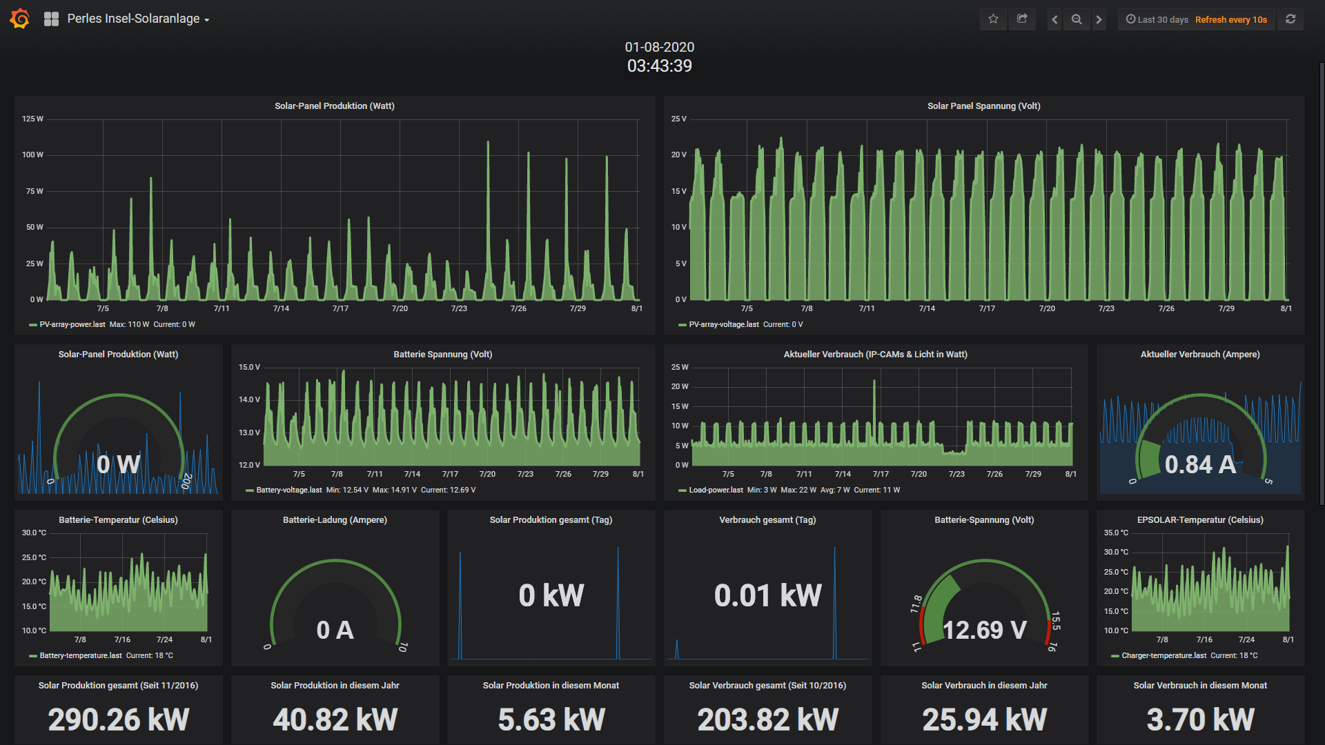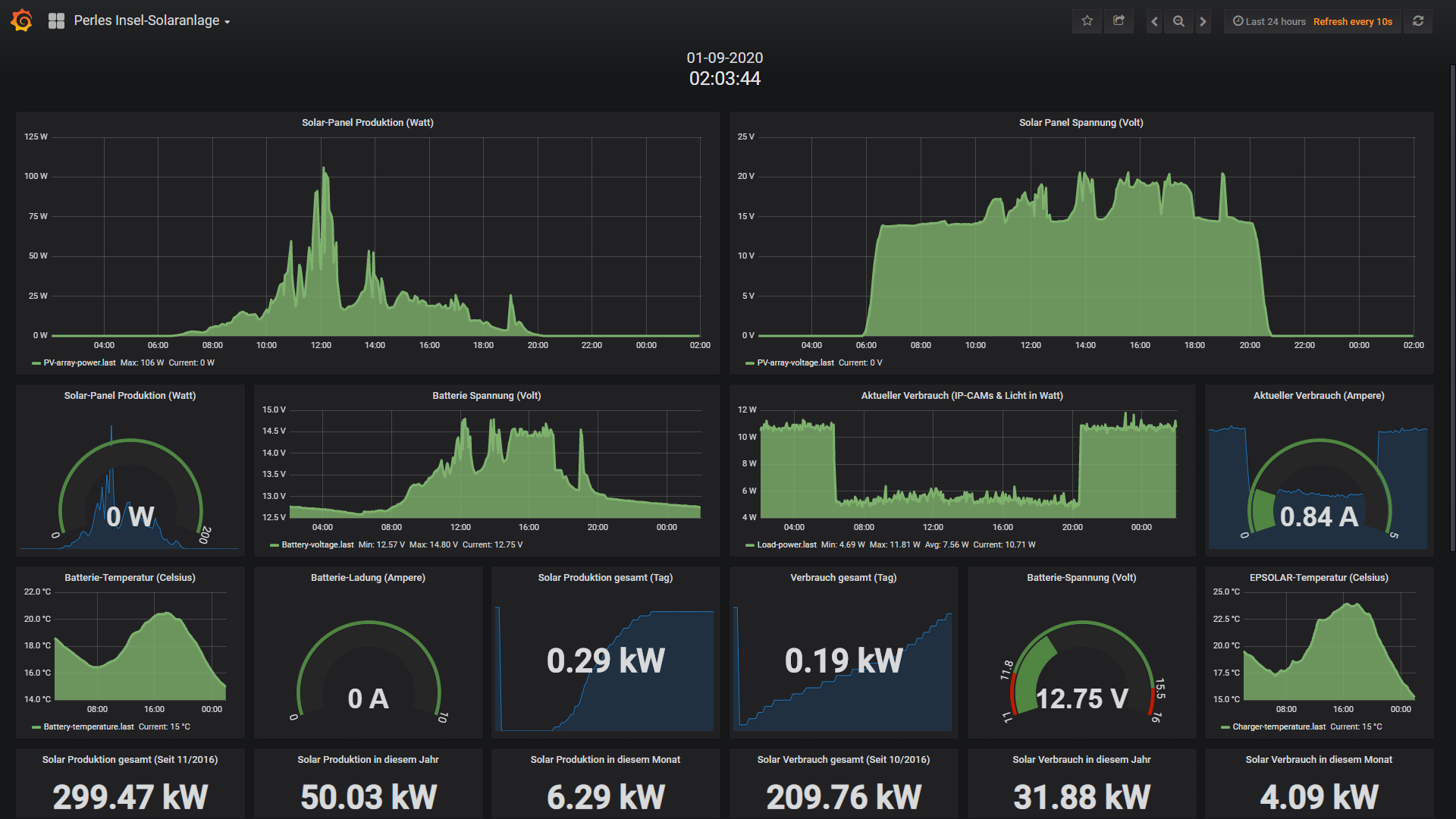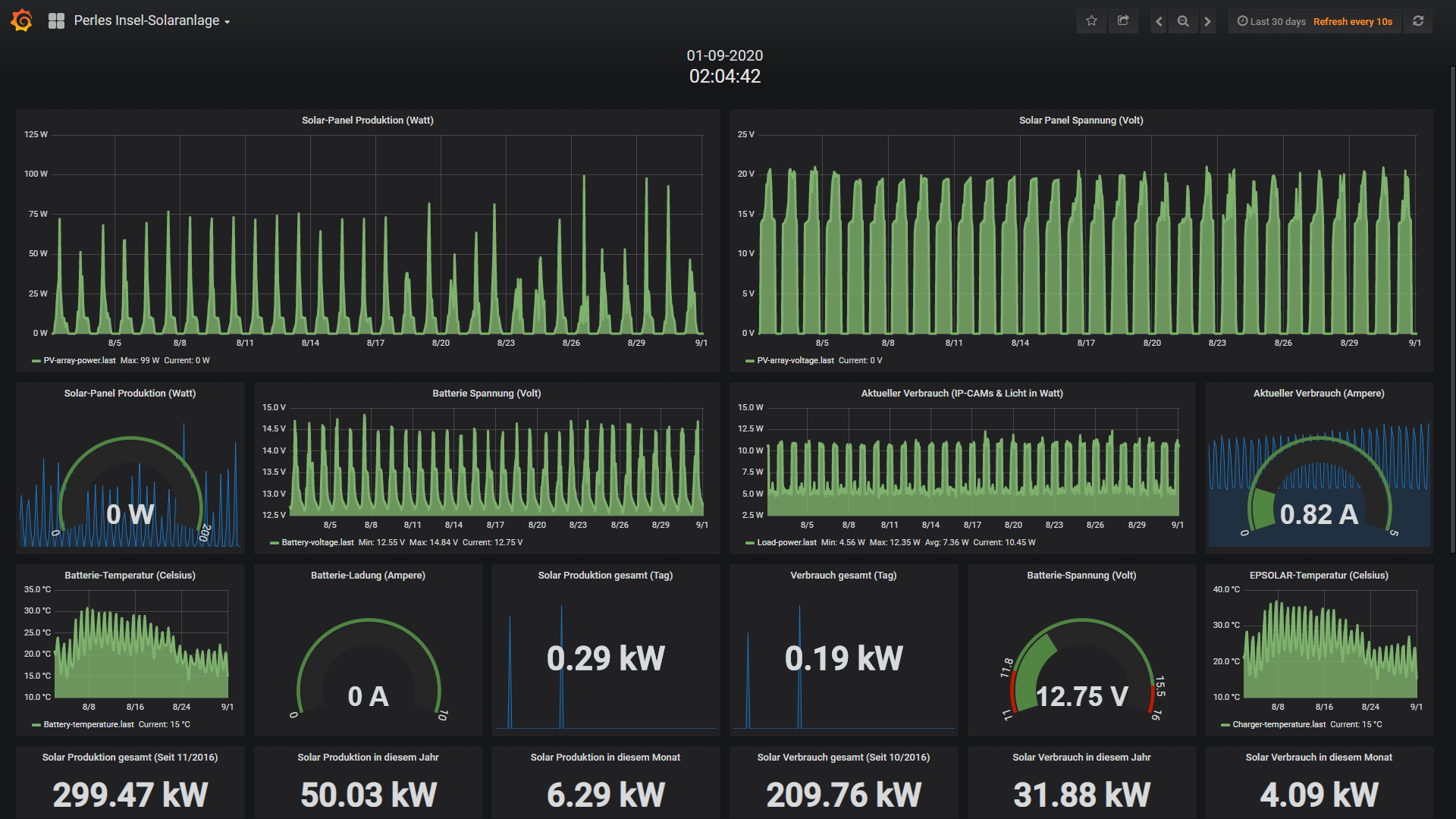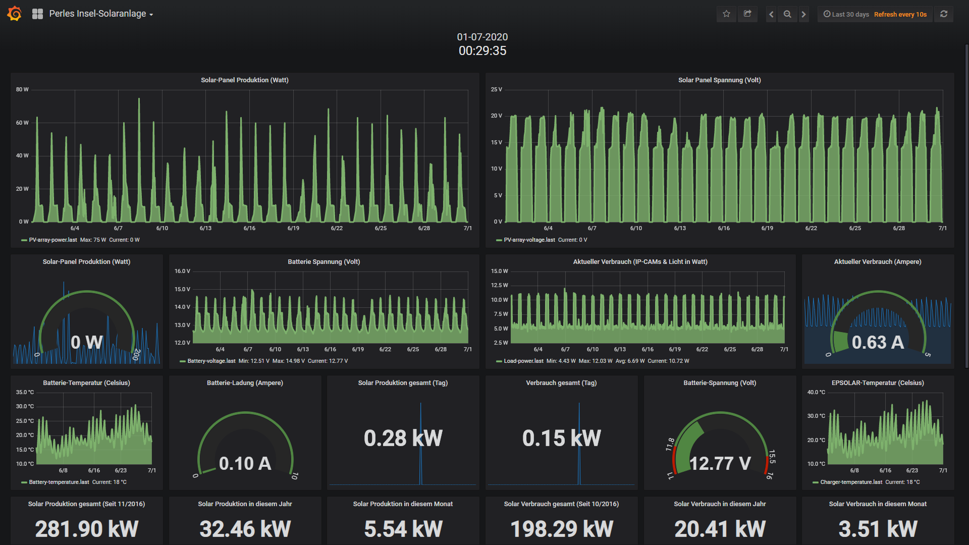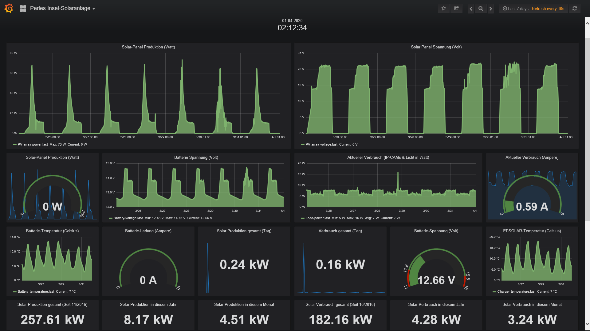 Die kleine 200 Watt Insel-Solaranlage: Wie nicht anders zu erwarten hat die kleine Insel-Solaranlage absolut keine Probleme mit dem nachschieben verbrauchter Energie. Ca. 150Wh werden in 24 Stunden verbraucht und ca. 280Wh wieder nachgeschoben. Bis zwischen 11 Uhr fängt die Insel an richtig zu produzieren und um 13 Uhr ist die Energiemenge im Sack. Also alles kein Problem, die Insel-Anlage läuft nach wie vor wie ein Uhrwerk und das vor 2 Monaten installierte Zusatz Infrarot-Flutlicht arbeitet hochpräsise. Das schöne ist zudem das man sich um absolut nichts kümmern muss. 2mal die Woche macht der Raspberry PI Datenlogger sein komplett-Backup der 16GB SD-Karte; der Grafana Internet-Server samt dem schaltbaren Internet-2 Channel ON/OFFmodul arbeitet perfekt etc.p.p. Macht einfach nur Spass und zeigt das ich bei der Wahl der Komponenten und Anlagen-Konzeption wirklich alles richtig gemacht habe. Alles funktioniert wie ein gut geschmiertes PV-Getriebe...