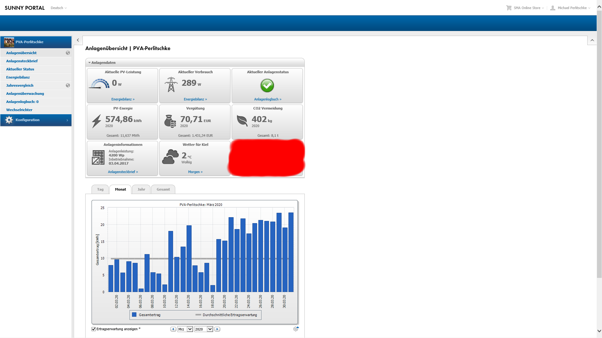Der Maerz wird meiner Schätzung nach das dritte Produktionsjahr mit einem ungeplanten Ertragsplus von ca. 9-12% resp. 109-112% Ertrag abschliessen. Das ist ein durchaus sehr solides und erfreuliches Jahres-Endergebnis. Denn bisher hat die Anlage in jedem Jahr mehr als durchschnittlich angegeben Strom produziert. Alles laeuft somit weiterhin nach Plan resp. weit ueber Plan!