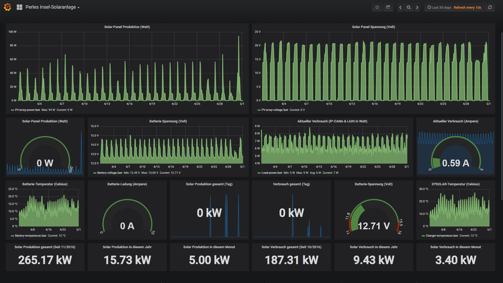 Die kleine 200 Watt Insel-Solaranlage: Hier gibt es ja nun auch schon lange nichts mehr zu bemängeln. Die Solarinsel schnurrt durch die ein Kätzchen und arbeitet wie ein Uhrwerk. Die Tagesverbräuche werden innerhalb kurzer Zeit wieder in die Akkus gepumpt noch ehe die Sonne die Panel richtig bescheint und diese in der Lage wären grosse Mengen Strom zu liefern. Aber wir wissen ja, wenn die Akkus voll sind, schaltet der EP-Ever Laderegler runter und verbrennt den gelieferten Strom um diesen zu nutzen oder erfassen. Da in der TZeit wo die PV-Insel Anlage ungedrosselt laeuft, also vom Mitte Februar bis Ende Oktober, Strom im absoluten Überfluss zur Verfügung steht, wird in kürze ein neuer Verbraucher einzug halten. Um was es sich genau handelt inkl. aller Details komme ich im nächsten Insel PV Mai-Update. Hier nun noch ein paar Screenshots zur exellenten Situation der Insel-Anlage: