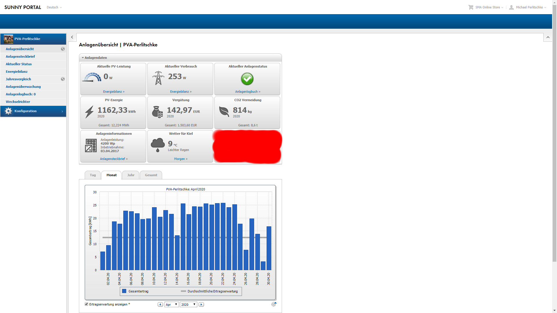 Hier die 4.2kwp Photovoltaik-Anlage auf dem Dach: Im Wetter-Update oben für diesen April habe ich das Wetter ueber den gruenen Klee gelobt. Dieser Monat wurde Ertragsseitig wieder ein neuer Rekord eingefahren was uns nun quasi automatisch zu den erfreulichen Ertragsergebnissen bringt. Die Durchschnittliche Ertragserwartung für den April liegt bei exakt 375,71 kwh. Und nun wieder ein Trommelwirbel...es wurde ein neuer April-Rekord mit unglaublichen 587,47 kwh vom Dach gefischt. DER ZWEITE REKORD IN FOLGE! Das entspricht unglaublichen 56,36% ueber der abgepeilten durchschnittlichen Projektion. 2017 kamen 408kwh & 2018 ca. 416kwh & 2019 sogar 550kwh vom Dach. Aber 2020 erstaunliche 587,47kwh. Brutal geil und Rekord.