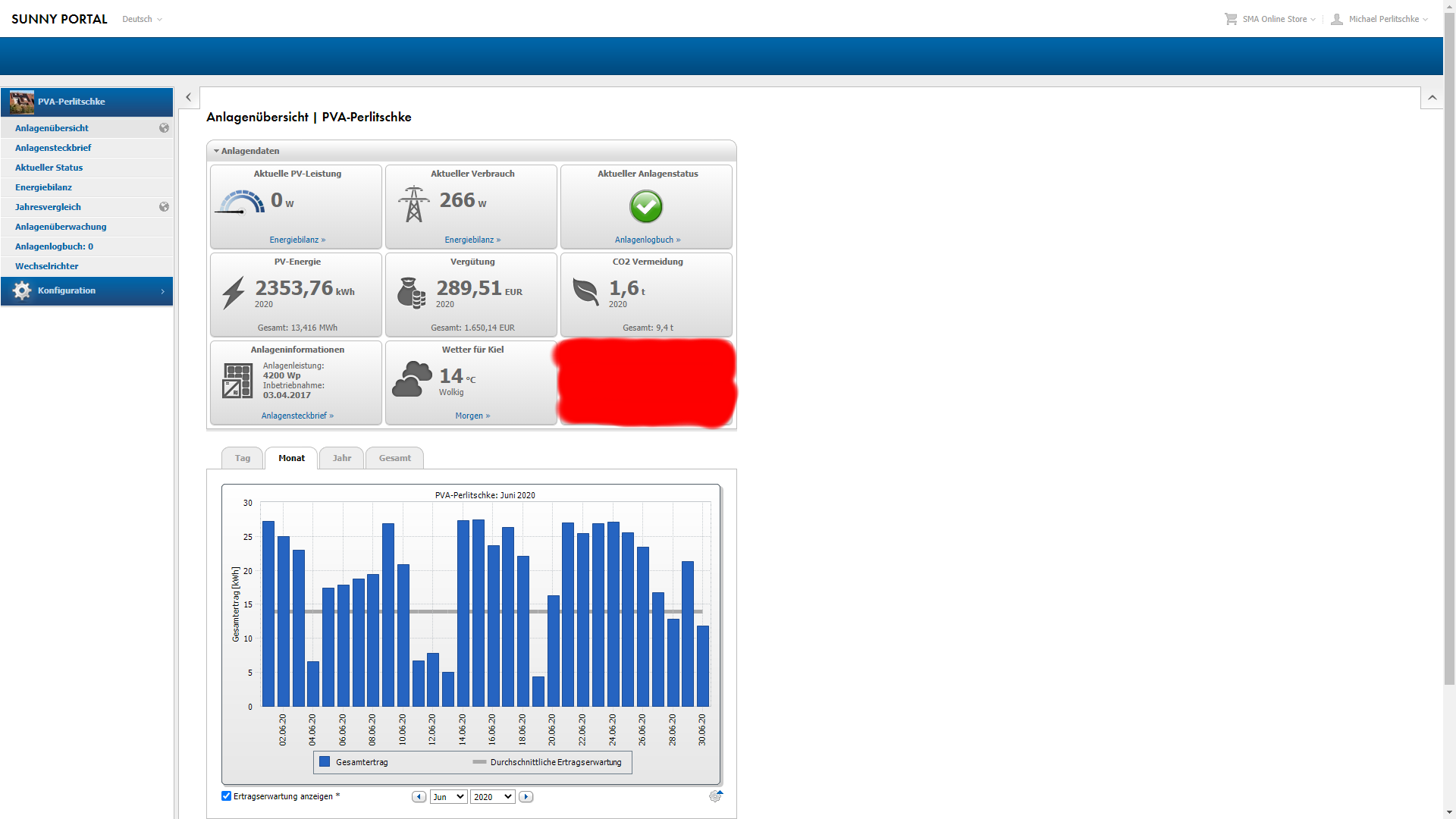 Hier die 4.2kwp Photovoltaik-Anlage auf dem Dach: Nun wird es spannend, denn jetzt kommen wir zur kleinen aber ganz gross funktonierenden 4,2kwp Dachanlage. Das Wetter in diesem Juni war toll, aber reicht dieses "TOLL" aus um uns ein lächeln ins Gesicht zun zaubern. Klare Antwort: JA, UND WIE! Dieser Juni hat wieder ein Produktions-Rekord mit stattlichen 587,84kwh erbracht. In keinem Juni der 3 Jahre zuvor war das möglich was letztendlich auch zu einer Betriebswirtschaftlich sehr erfreulichen Situation führte. Die Durchschnittliche Ertragserwartung für den Juni liegt bei exakt 419,29 kwh. Da aber wie eben schon geschrieben satte 587,84 vom Dach kamen, entspricht das unglaubliche 40,19% über der abgepeilten durchschnittlichen Projektion. Extrem geil, aber schaut selbst: