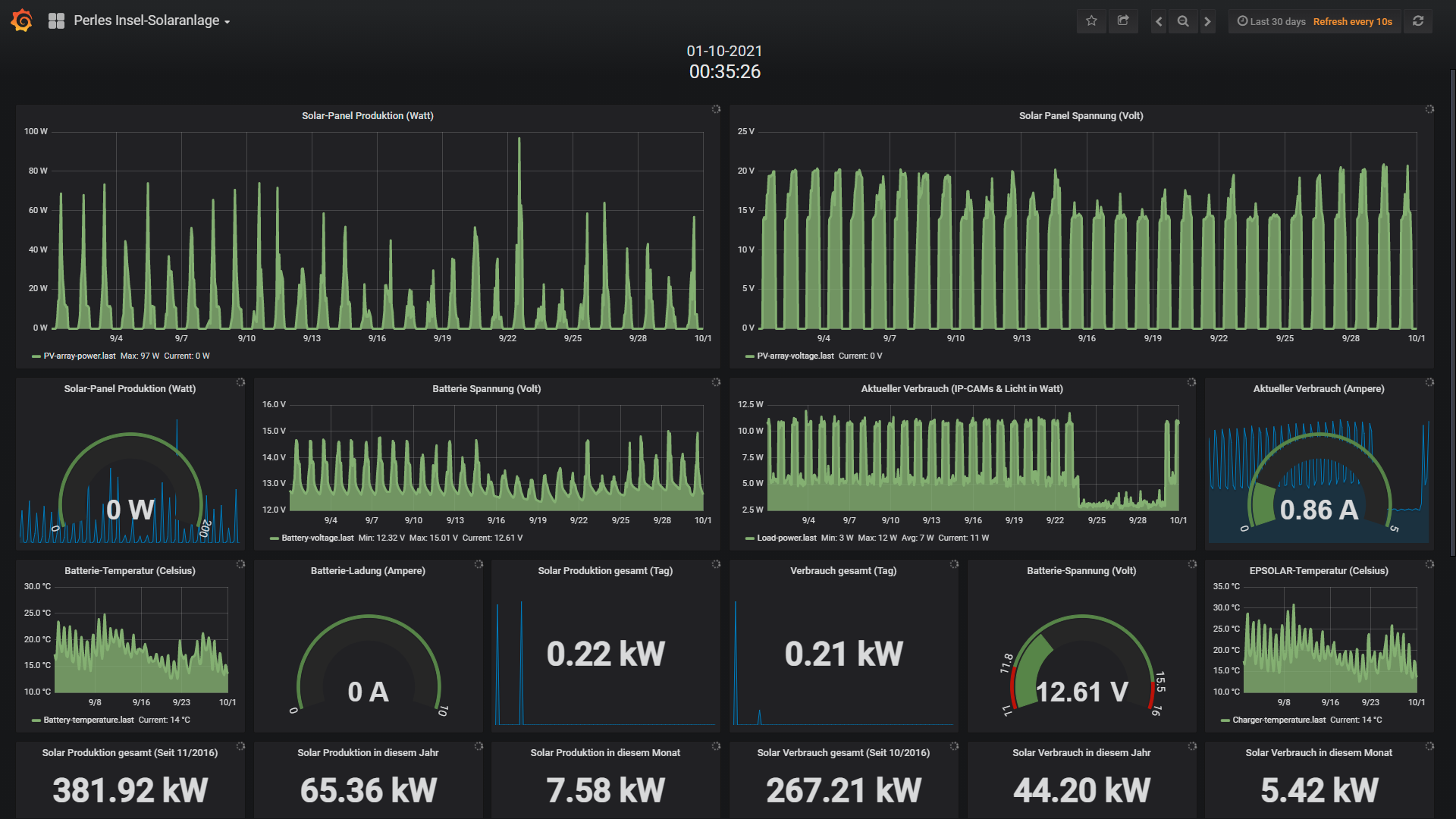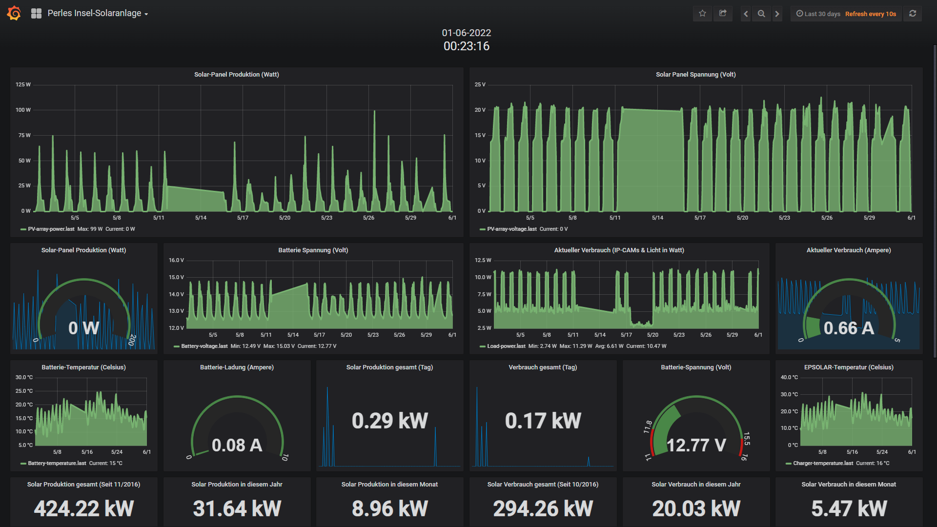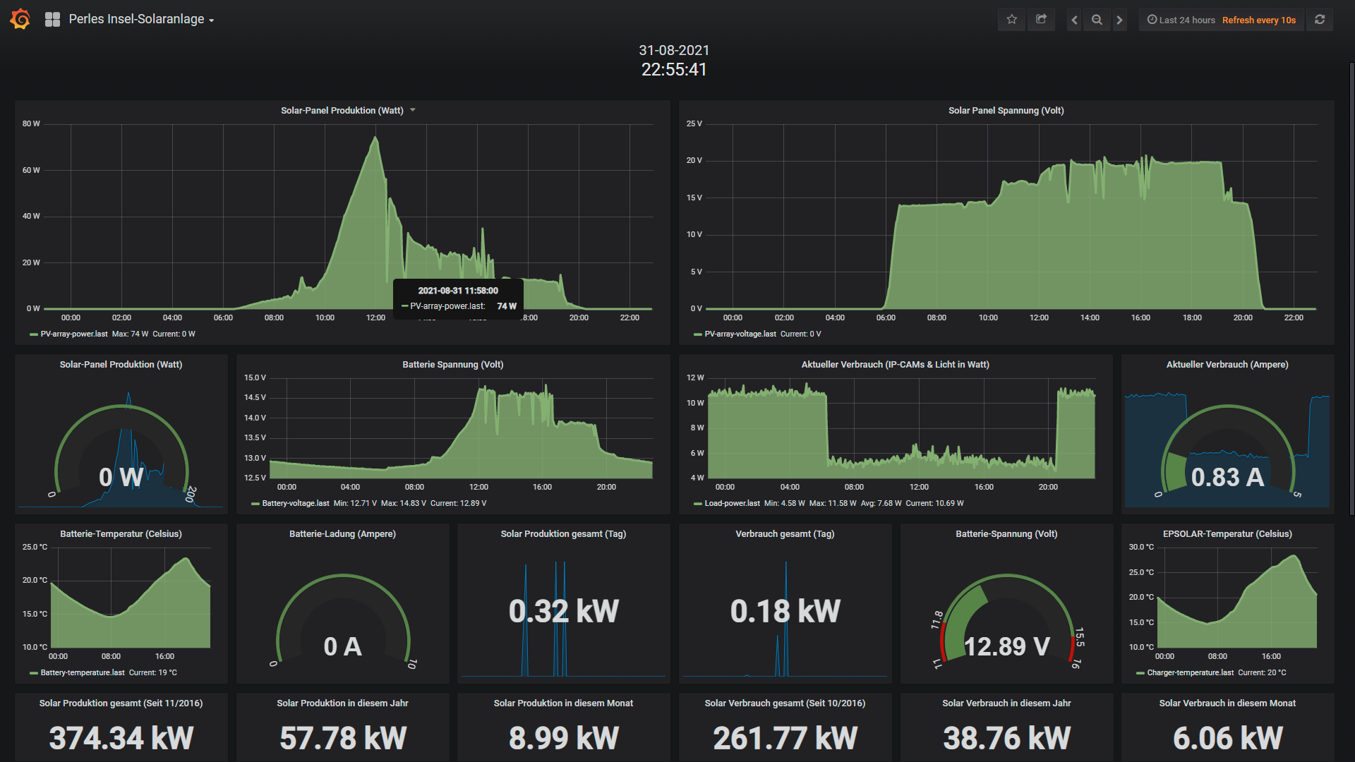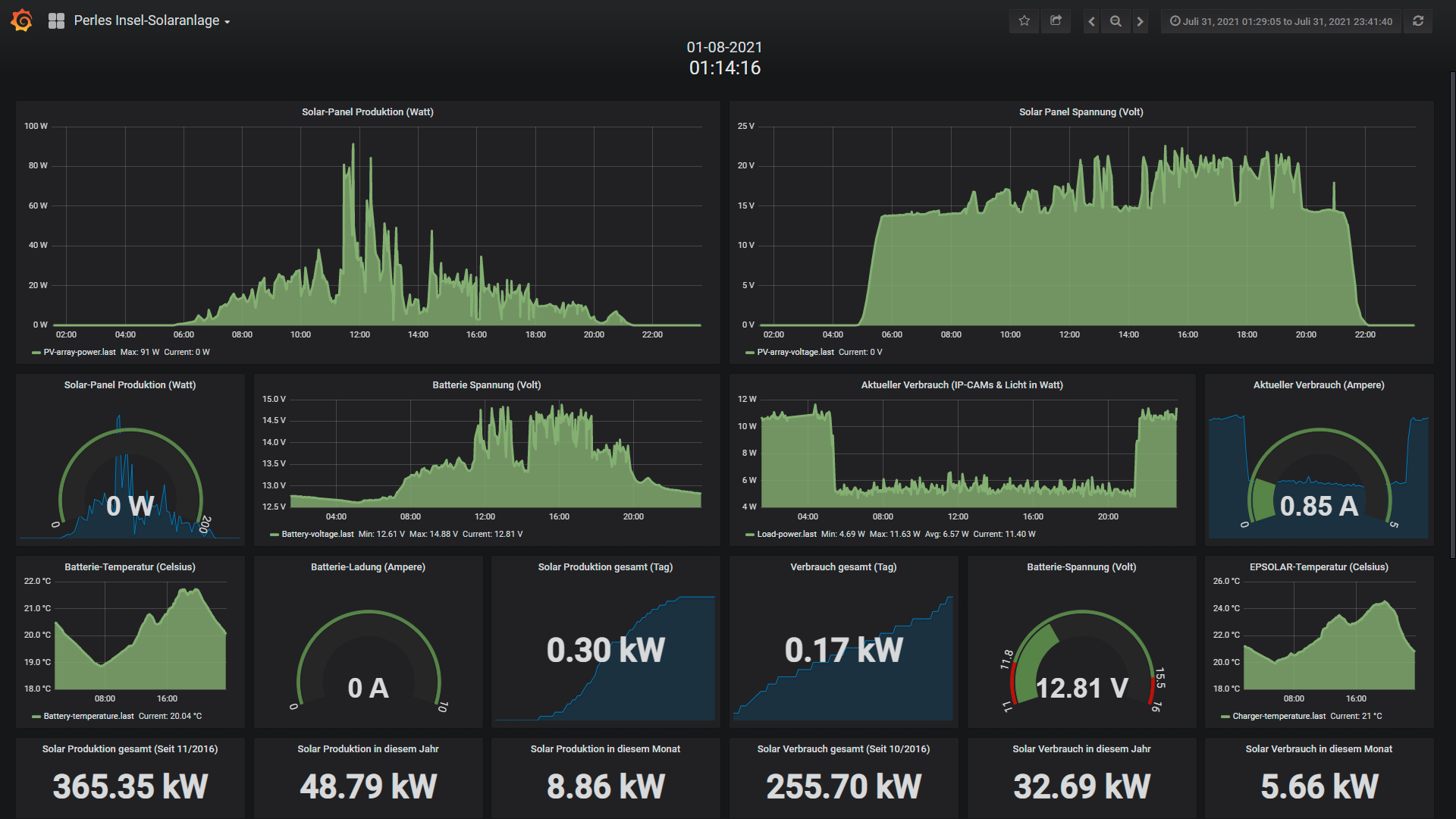 Die kleine 200 Watt Insel-Solaranlage: Unsere kleine Selbstbau 200 Watt Insel-Solaranlage tangierte das alles nicht die Spur. Die Tage sind lang und die beiden 100 Watt Panele sorgten problemlos dafür das die Akkus immer schnell nachgefüllt sind. Sollte mal ein Tag ins Wasser fallen, dann wird halt am Tag drauf die fehlende Energie spielerisch und sehr flott in die Akkus geschaufelt. Auch in diesem Monat gab es keinerlei Auffälligkeiten, da die Anlage autark wie ein Uhrwerk lief. Auch die Voll-Backups auf den NAS-Server der im Raspberry PI verbauten 16GB Speicherkarte 2mal in der Woche durchführt verliefen problemlos. Erstaunlich wie ROBUST sich dieses System seit nun 5 Jahren schlägt. Einzig ein neuer 100Ah Akku fuer 75 Euro wurde Anfang diesen jahres fällig unnd ein neues 2 Channel Schalt-Relais musste vor Jahren mal ersetzt werden. Die schon letzten Monat angesprochene & geplante Installation eines neuen helleren Energie-Effizienteren IR-Flutlichts für die Nachtsicht meiner Kameras habe ich auf den Oktober verschoben (denn da werden die Tage so kurz das jedes gesparte Watt wichtig wird). Ansonsten: Alles Pickobello mit der Insel-Anlage! Hier wie gewohnt zwei Screenshots: