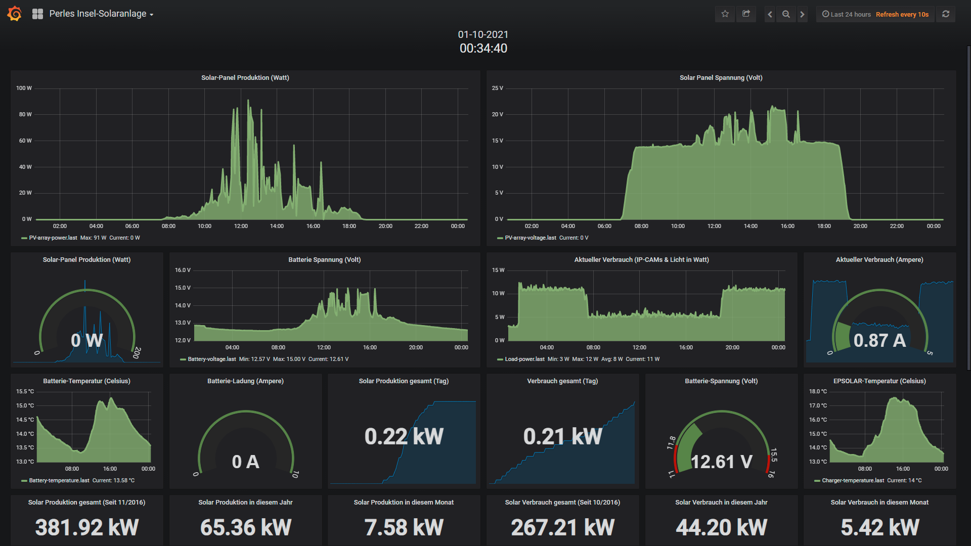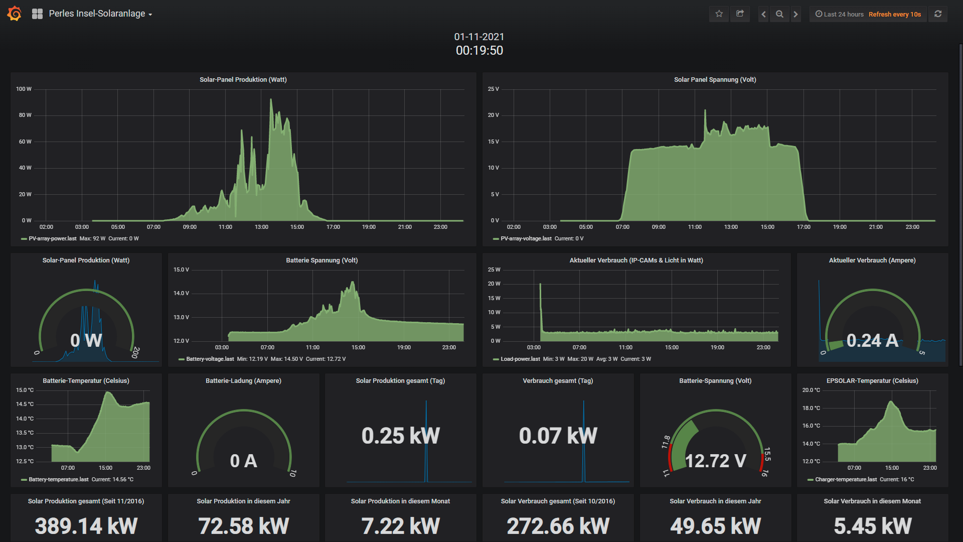 Die kleine 200 Watt Insel-Solaranlage: Auch diesen Monat schlug sich die Insel-PV Anlage wacker und holte wie gewohnt artig den verbrauchten Strom vom Himmel um die Akkus wieder zu füllen. Ab Mitte Oktober hatte die Anlage aber stellenweise wirklich zu kämpfen und musste sich über Tage aus den Akkus bedienen, da tagsüber aufgrund bewölktem Himmels fast keine Energie erzeugt werden konnte. Ab Mitte Oktober habe ich dann für 1 Woche die Verbraucher ferngesteuert mittels Smartphone deaktiviert um etwas Strom zu sparen. Nach dieser Woche habe ich dann die Kamera wieder aktiviert, aber sicherheitshalber auf das IR-Flutlicht verzichtet. Erschwerend hinzu kommt der immer ungünstigere Sonnenwinkel (die Panel werden nur noch 1 Stunde direkt von der Sonne getroffen) und die sich täglich immer schneller verkürzenden Tage. Man merkt, lange wird es nicht mehr dauern bis die Energie so knapp wird das Strom gespart werden muss. Hier dann noch die obligatorischen zwei Screenshots: