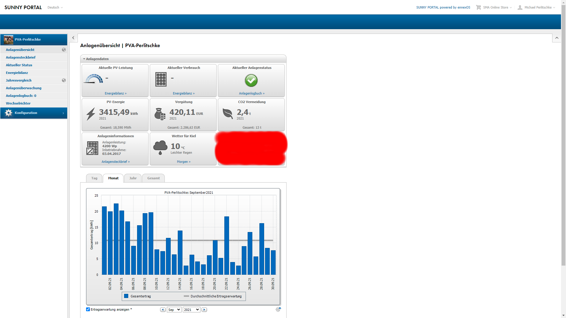 Hier die 4.2kwp Photovoltaik-Anlage auf dem Dach: Wie immer kommen wir jetzt zum wirklich spannenden Teil, unserer kleinen 4,2kwp (4200 Watt) Dach Solar Anlage. Die Dach-PV Anlage hat bei diesen doch sehr schlechten Wetterbedingungen zu kämpfen gehabt. Das erste schöne Monatsdrittel war extrem wichtig, denn sonst wäre die Anlage bei einem satten Minus gelandet. Wenn auch verdammt knapp konnte das Monatsziel gerade so erreicht werden. Dennoch war dieser September wie auch schon im August also dem Vormonat, der seit Betrieb 2017 zweitschlechtes September-Monatsertrag. Nur 2017 war der Spetember noch schlechter! Die durchschnittliche Ertragserwartung für diesen September lag bei 324,77kwh und tatsächlich erzeugt wurden in diesem Monat mit ganz viel Glück 334,49kwh. Also ein ungeplantes mageres Produktions-Plus von lediglich 2,99% über der durchschnittlichen Ertragserwartung. Auch hier schaut Euch selbst die desolate September-Situation an: