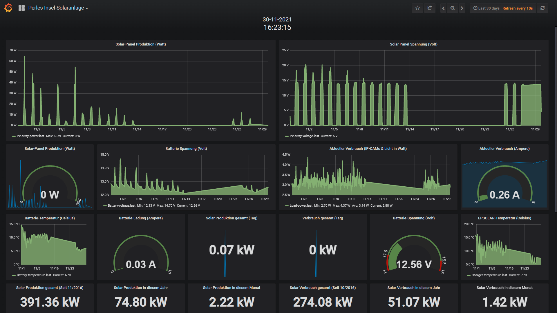 Die kleine 200 Watt Insel-Solaranlage: Die ersten 14 Tage des Novembers konnte sich die Insel-Anlage immer mal wieder ein Stück aus der Batterie-Reserve bedienen. Aber das Regenwetter resp. Wolkenwetter konnte nur bedingt das nachfüllen was erforderlich gewesen wäre. Diese Tendenz kannte ich auch von den vielen Jahren zuvor, drum beschluss ich mitte des Grusel-Monats die Reissleine zu ziehen und die Anlage und Verbraucher in den Stromspar-Modus zu versetzen, sodass nur noch das am Solar-Regler verbaute WLAN-Modul lief welches nicht wirklich Strom zieht. Selbst den Raspberry Pi der zwischen 3-4 Watt zieht habe ich getrennt um die immer leerer werdenden Akkus etwas zu entlasten. Aber das ist alles nicht wirklich ueberraschend, denn die Tage sind verdammt kurz geworden und bei dem trüben Wetter kam nicht viel vom Himmel. Alles alles wie ich es auch von den Vorjahren her kenne. Hier dann noch der obligatorische Screenshot des November-Desasters: