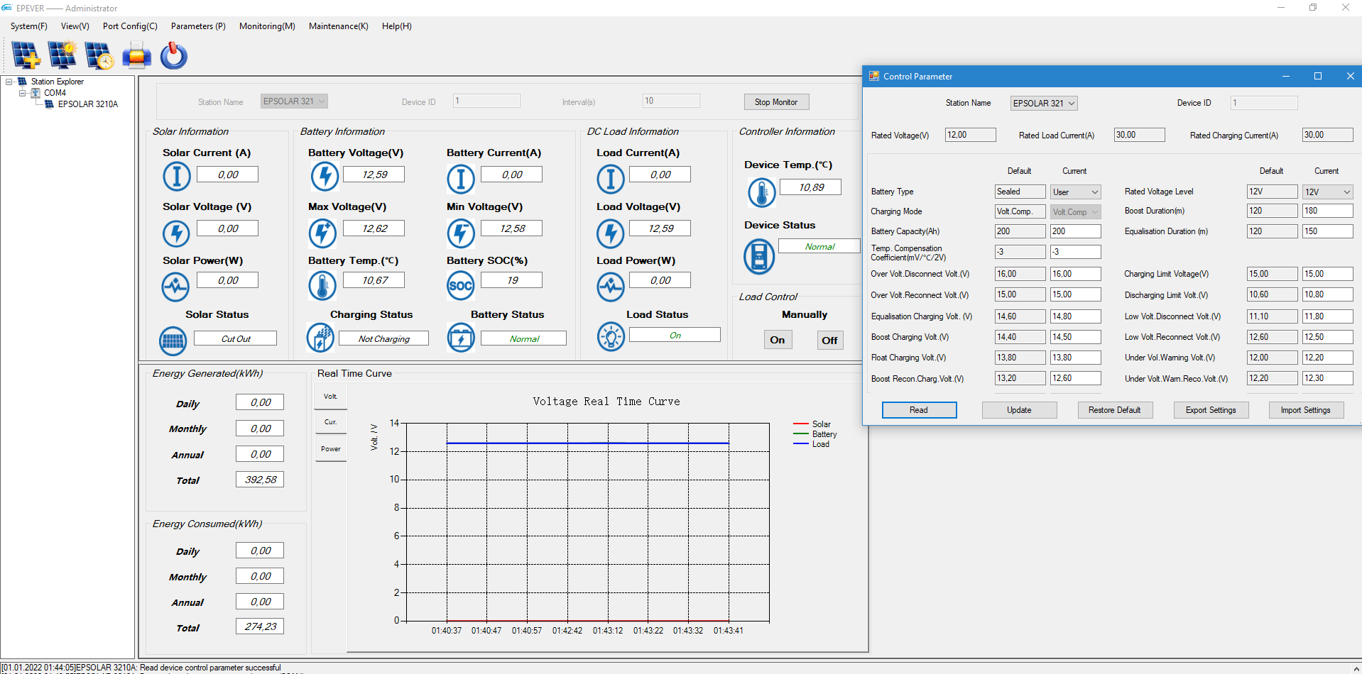 Die kleine 200 Watt Insel-Solaranlage: Die Insel-PV Anlage hatte in Dezember extrem hart zu kämpfen, da einfach keine Energie vom Himmel kam. Folglich habe ich alles angeschaltet (inkl. Raspberry Pi Daten-Logger; Lueftung; Relaisboards die in Summe pro Tag 70 Wattstunden an Energie ziehen also verbrauchen). Wirklich alles! Gegen Ende Januar haben sich die Akkus wieder langsam gefuellt (und die Tage werden im dritten Drittel des Januars auch langsam merklich länger), sodass ich wieder die Kleinstverbraucher wie den PI zugeschaltet habe. D.h. wie auch die 6 Jahre zuvor befand sich die Solar-Insel im Winterschlaf. Neu war das ich wegen des schlechten Novembers recht früh alles im Dezember durchgehend bis Ende Januar komplett abschalten musste um die Akkus zu schützen resp. in einem guten Ladezustand zu halten. Diesen habe ich natürlich mittels des Solar-Station Monitors und einem getunnelten Com-Ports regelmaässig fernüberwacht. Hier dann noch die obligatorischen zwei Screenshots: