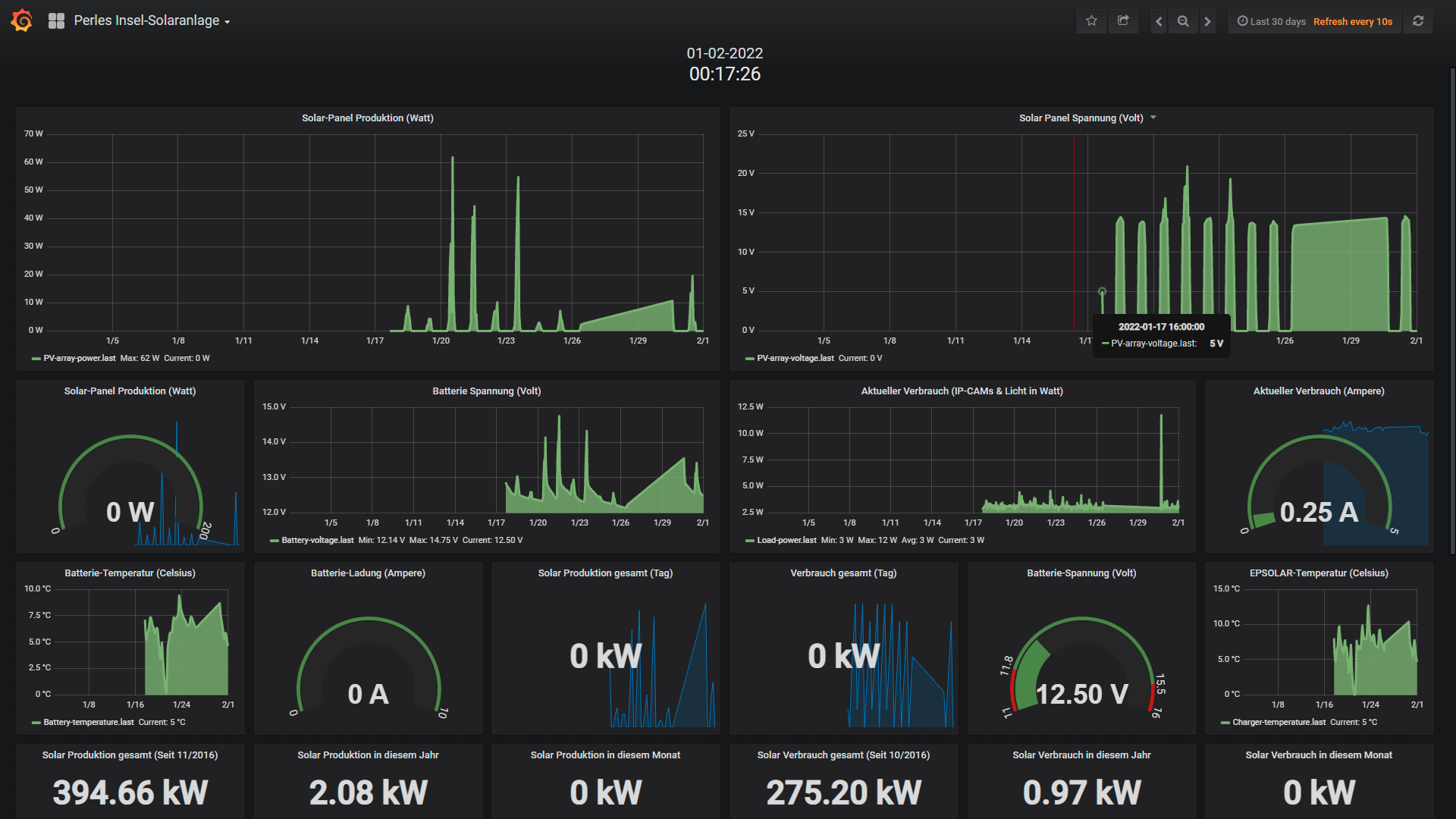 Die kleine 200 Watt Insel-Solaranlage: Die Insel-PV Anlage hatte in Februar auch nichts zu lachen und extrem hart mit den kurzen und sehr dunklen Tagen zu kämpfen, da einfach keine nennenswerte Energie vom Himmel in die Akkus fiel. Das war so dermassen wenig an Energie, dass ich die Insel-Anlage ab dem 5 Februar wieder in den Stromspar-Modus versetzen musste. Selbst der Rasberry PI wurde abgeklemmt um wertvolle Stromreserven zu schonen (und der verbraucht nur 3 Watt). Ab dem 16 Februar war das System aber wieder am Netz und konnte sich trotz schlechten Wetters gerade so durch den miesen Februar hangeln. Wirklich unschön, aber wir kennen das ja sehr ähnlich von den Jahren zuvor. Hier dann noch die obligatorischen zwei Screenshots: