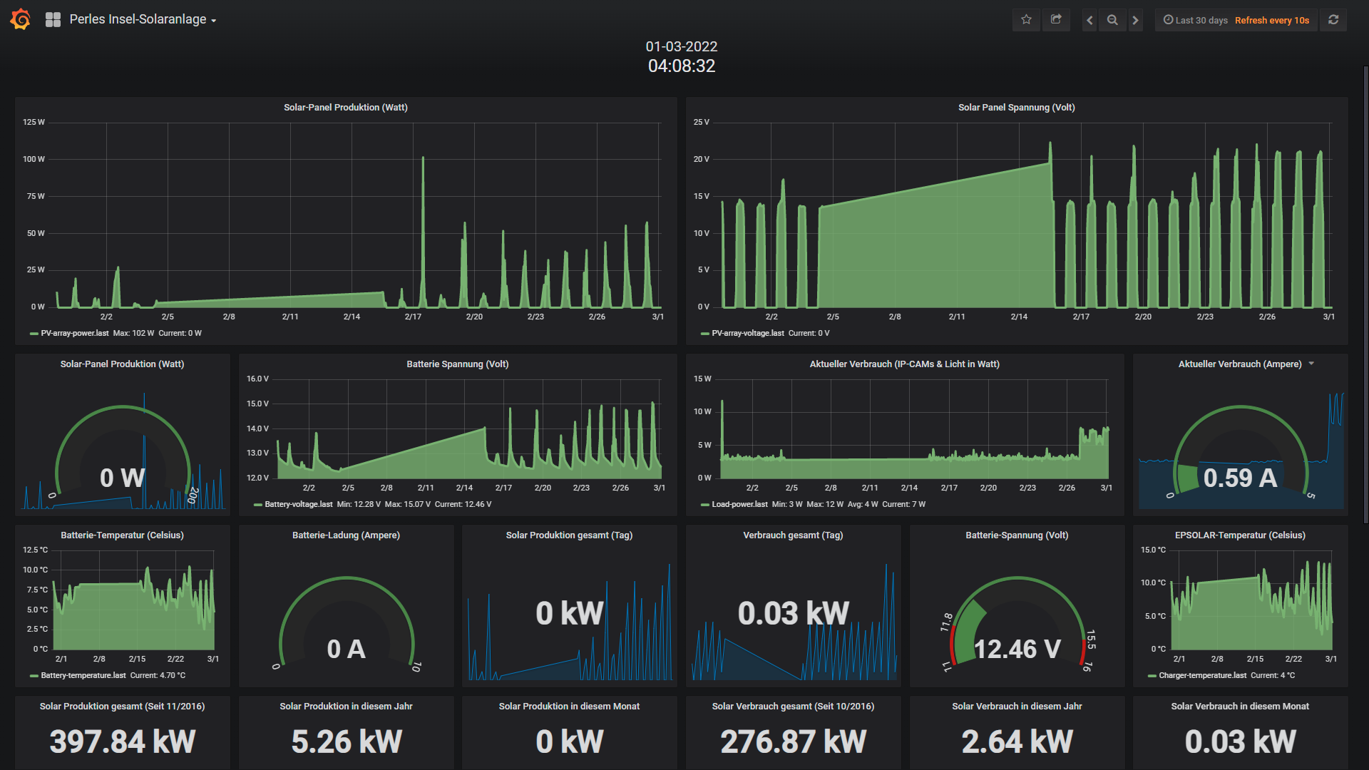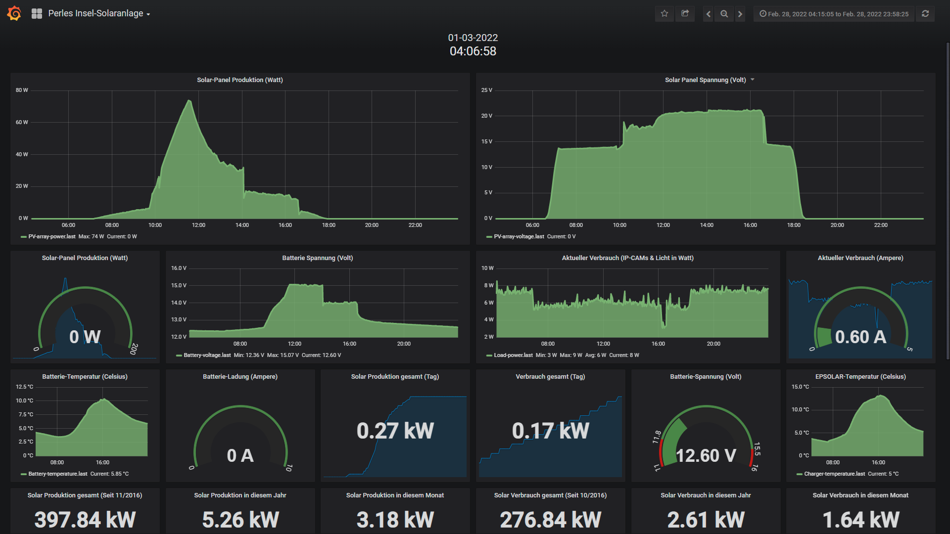 Die kleine 200 Watt Insel-Solaranlage: Die Insel-PV Anlage hatte bei diesen Wetter natürlich keine Probleme mehr und lief nun wieder mit voller Last und allen Verbrauchern. Bei diesem Überschuss an Sonne war es täglich ein Kinderspiel die beiden 100Ah Akkus wieder bis zum Anschlag zu füllen. Allerdings quittierte die Micro-SD SanDiak 16Gb Speicherkarte am 9 Marz ihren Dienst. Nach >5 Jahren und geschätzt einer halben Million Schreibzugriffen (eher sogar noch deutlich mehr) war die SanDisk verschlissen und musste gegen eine neue 1:1 SanDisk 16GB ersetzt werden. Auf diesen Defekt der SD-Karte warte ich nun schon 2 Jahre und es ist verblüffend wie lange die SanDisk diese Logging-Folter praktisch überstaenden hat. Daten von 4 Tage sind dabei verloren gegangen (9-13 März) da ich auf das letzte Komplett-Backup der SD-Karte zugreifen musste. Wir wissen, 2 mal die Woche führt der Raspbeery PI per WLAN ein automatisches VOLL-BACKUP auf meinen NAS-Server durch. Somit liegen immer rotierend die letzten 10 Voll-Backups (Image-Files) der SD-Karte auf meinem 30TB NAS-Server. Das letzte Backup habe ich nach dem Kauf der neuen Sandisk auf die neue Micro SD-Karte geschrieben und diese dann in den Raspberry PI eingesetzt. Somit läuft nun wieder alles wie gewohnt! Das die SD-Karte aber so dermassen lange durchhaelt (der Pi ist 24/7 am Daten loggen also schreiben) ist wirklich unglaublich. Wir erinnern uns, 2016 habe ich mit einer NoName Karte begonnen und diese war nachn wenigen Monaten kaputt. Da kann man mal sehen, was es bedeutet 1 Euro mehr in Markenqualitaet zu investieren. Hier noch der März Screenshot mit der kleinen SanDisk Lücke :