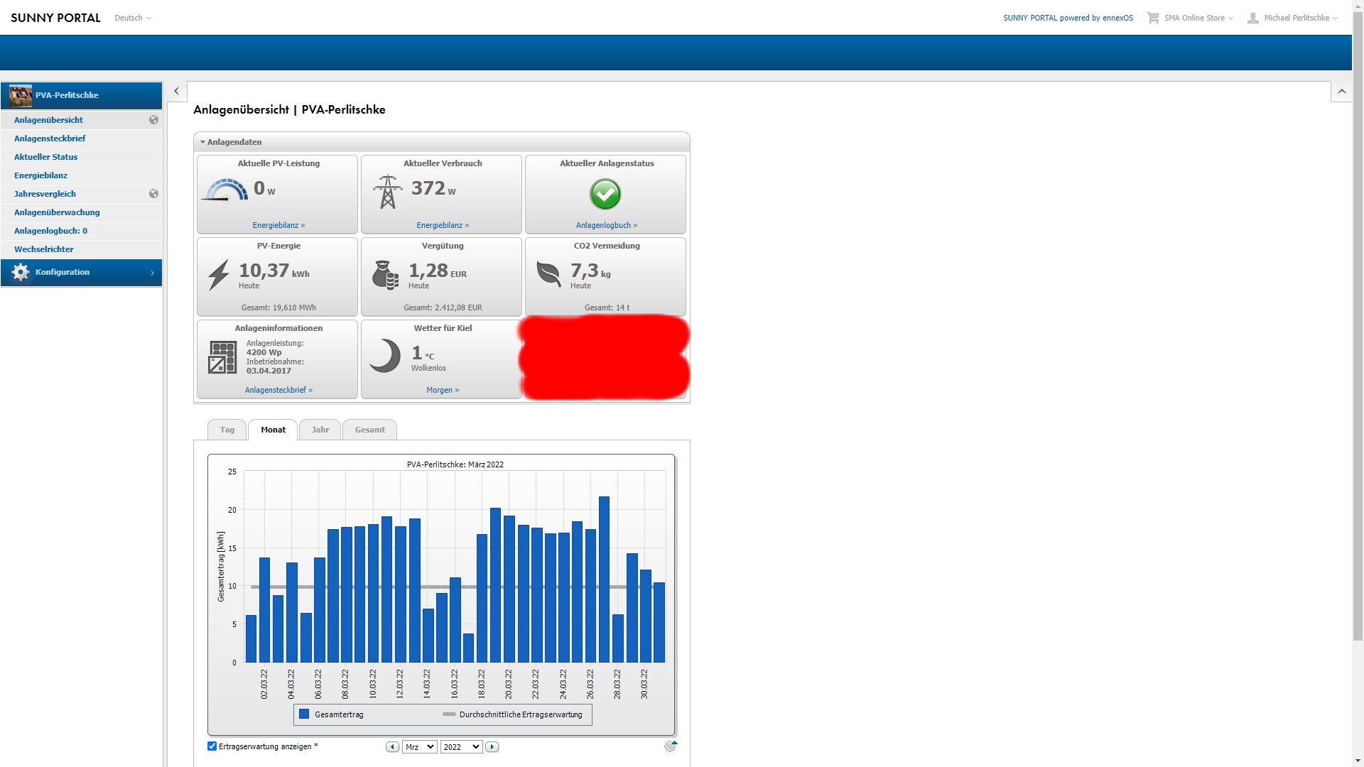 Hier die 4.2kwp Photovoltaik-Anlage auf dem Dach: Bei diesen Bombenwetter hatte es die kleine 4,2kwp Dach PV Anlage leicht. Diese produzierte Strom; Strom und noch mehr Strom. Und das in einem Umfang wie ich es zuletzt im Rekordjahr 2018 erleben durfte. Die Ertragserwartung für den März lag bei 306kwh und vom Dach kamen sensationelle 444,31kwh. Das ist ein neuer März-Rekord. Der schon tolle März im Jahr 2018 brauchte 411,47kwh. Aber diesmal 444,31kwh. Das liegt unglaubliche 45,2% über dem Plan. Also NEUER REKORD!!! Wirklich erfreulich, da der November; Dezember; Januar & Februar immer im Minus lagen. Aber November; Dezember & Januar sind nicht tragisch, denn in diesen Monaten kommt ohnehin sehr wenig Strom vom Dach. Aber dieser März und 444,31kwh. WOW, das ist mal eine Ansage die Ihr Euch besser mal selbst ansehen solltet: