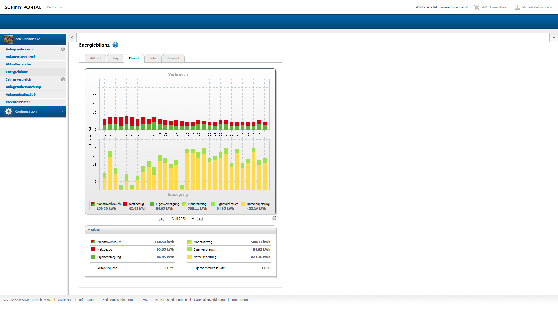 Hier die 4.2kwp Photovoltaik-Anlage auf dem Dach: Bei diesem Wetterbedingungen hatte meine kleine 4,2kwp Dach PV Anlage auch leichtes Spiel. Da ich mich in den USA aufgehalten habe, ging natürlich das meiste an produzierten Strom vom Dach direkt ins Netz und den Verkauf. Es hätte sogar für einen neuen April-Spitzenplatz gereicht, wenn die ersten 10 Tage des Aprils nicht so durchwachsen gewesen wären. Denn die Ertragserwartung für den April lag bei 375,71kwh und vom Dach kamen beachtliche 508,11kwh. Nur das Jahr 2019 & 2020 waren noch besser. Das liegt dennoch bei sehr beachtlichen 35,2% über der Ertragserwartung. Der nun erste Monat im 6ten Produktionsjahr startet also sehr gut durch resp. legt die Messlatte hoch. Aber schaut selbst: