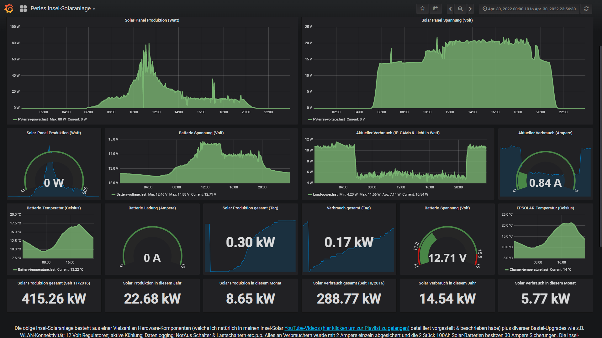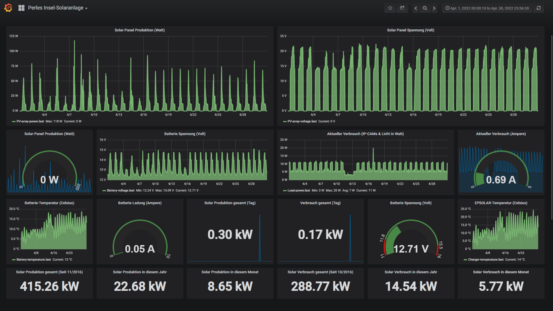 Die kleine 200 Watt Insel-Solaranlage: Die kleine Insel-PV Anlage hatte bei diesen überwiegend schönen Wetter natürlich keine Probleme, wobei es auch keine Probleme gegeben hätte wenn das Wetter schlecht gewesen wäre. Denn die Tage werden immer länger und es reicht schon ein bisschen Sonne um die Akku wieder flott auf 100% zu laden. Aus bisher ungeklärten Ursachen hatte sich der Raspberry Pi Datenlogger mitte des Monats abgeschaltet resp. seinen Dienst verweigert. Dieses hatte ich erst nach 6 Tagen bemerkt und das Problem konnte durch ein kurzen System-Reset (also wenige Sekunden Arbeit) beseitigt werden. Hier noch der April Screenshot: