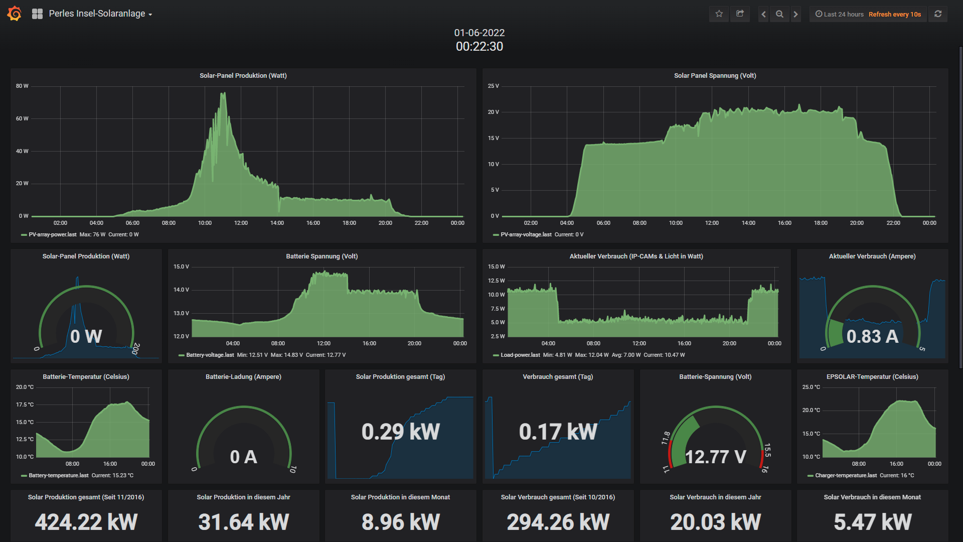 Die kleine 200 Watt Insel-Solaranlage: Die kleine 200 Watt Insel-Solaranlage lief natürlich wie nicht viel anders zu erwarten absolut rund und es gab bis auf eine Kleinigkeit beim Raspberry PI Datenlogger keinerlei Auffälligkeiten. Ertragsseitig kam mehr als genug Energie von den beiden Solarpaneln um die beiden 100Ah 12 Volt Akkus RUCKZUCK schon gegen Mittag wieder auf 100% Kapazität zu bringen. Aber dieses Verhalten kennen wir schon seit Jahren, denn der Überschuss welcher vom Himmel fällt ist gigantisch. Die Anlage braucht nur 2 Stunden um den Verbrauch der extrem kurzen Nächte inform von den Paneln gefischten 300wh bei einem Verbrauch von 170wh nachzutanken. Auch die beiden Komplett Backups (16GB SD-Karte) des an dem System hängenden Raspberry Pi liefen wie eigentlich seit Jahren problemlos. Fast, denn zwischen dem 8-10 Juli hat sich der PI Aufgehängt und konnte keine Daten mehr loggen. Ein kurzer Neustart hat das Problem dann elegant behoben. Uebrigens, es ist schon fazinierend wie hart und zuverlaessig dieser kleine Mini-Computer rund um die Uhr arbeitet. Da nehme ich es dem Raspberry Pi auch nicht uebel, wenn der mal etwas zickig wird. Die geplante Installation eines neuen Energie-Effizienteren IR-Flutlichts für die Nachtsicht meiner Kameras habe ich auf den Herbst verschoben. Hier mal ein Screenshot von der Inselanlage: