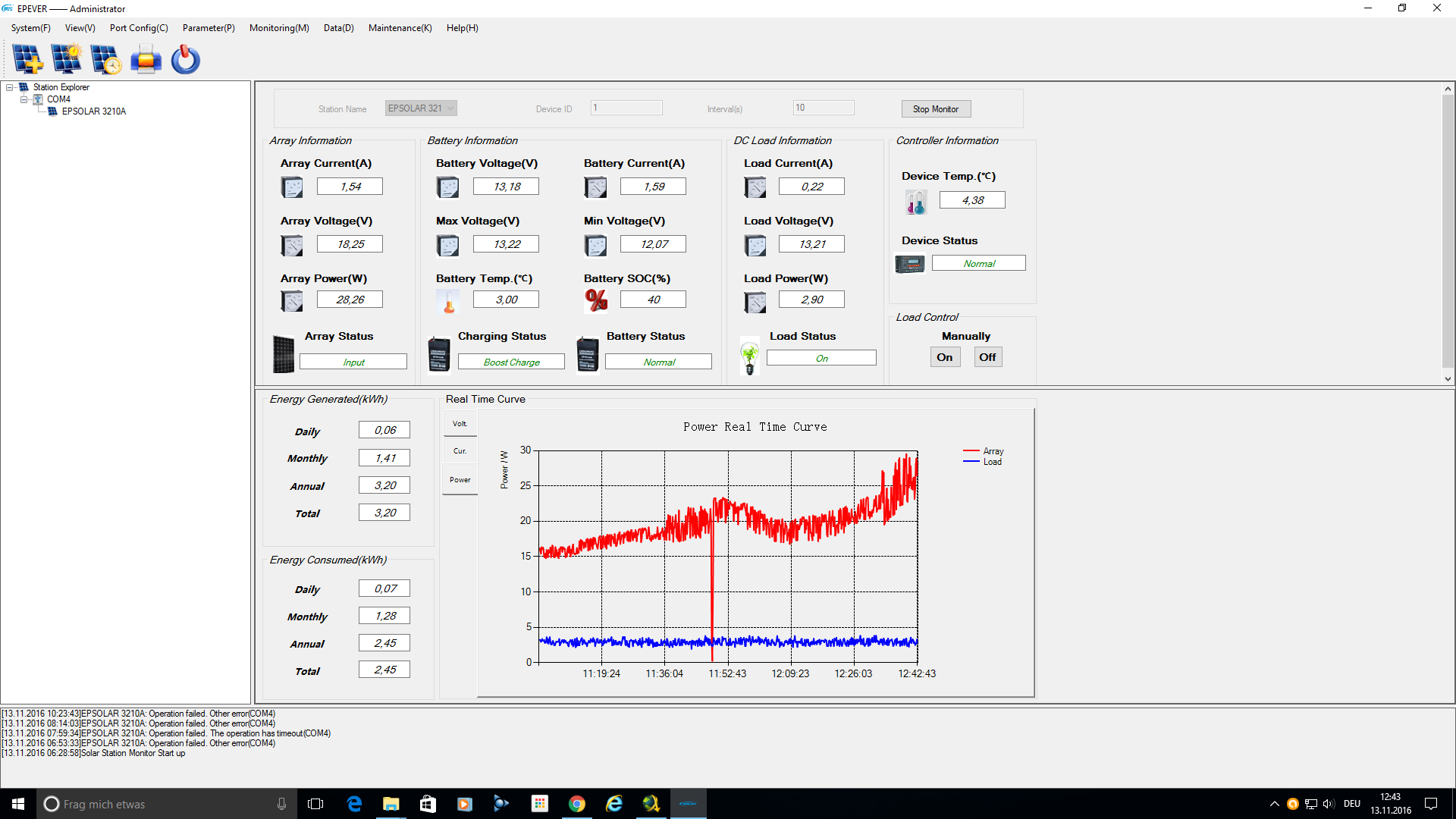 Was im Oktober noch funktionierte, wird im November spaetestens ab Mitte November zu einem Negativ-Geschaeft insbesondere wenn es fast nur bewoelt sein wollte. Die Rechung EINNAHME vs. VERBRAUCH geht einfach nicht auf. Diese Situation wird sich taeglich weiter verschlimmern, da der kuerzeste Tage am 21 Dezember mit zum Vergleich zu Heute nochmal 1 1/2 Stunden weniger Tageslicht und einem max. 12 Uhr Sonnenstand von nur 12 Grad ist ( 100 Minuten vorvor oder spaeter 12 Uhr liegt die Sonne <10 Grad am Himmel, also rauscht quasi ueber den Boden ).