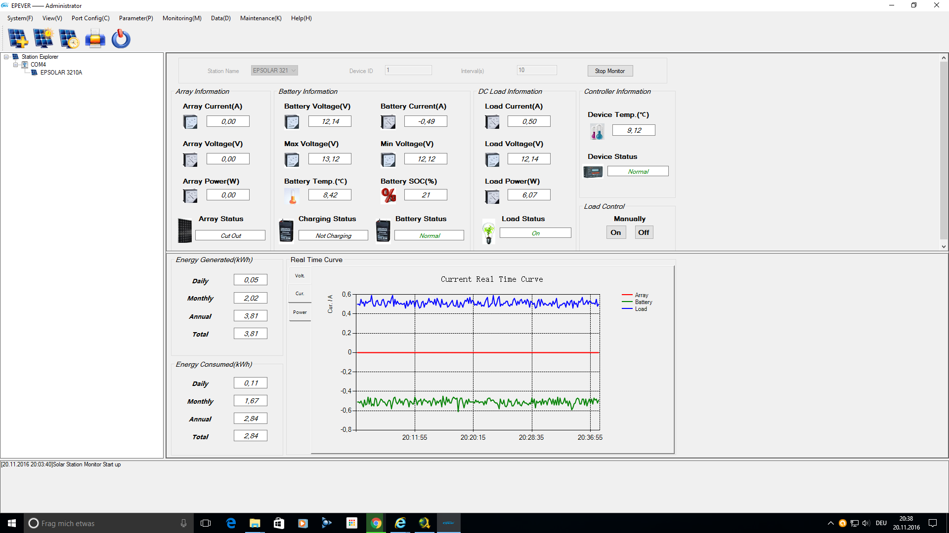 Ich werde diesen Winter wie folgt vorgehen: Einfach laufen lassen und beobachten wann der SPSOLAR-Regler die Last also Kamera automatisch deaktiviert (ich habe das ja bei konvervativen 11,80 Volt spezifiziert um den Akku nicht zu tief zu entladen und belasten) und wie es mit den Ausfallzeiten aussieht. Ferner werde ich genau die taeglichen Ertraege weiterhin protokollieren um eine Schnittmenge fuer die 4 kritischen Monate zu erhalten. Sollte es groessere STOP-Zeiten geben, muss das Kamera-Managment umgestellt werden um Strom zu sparen. Der einfachste Weg waere dann die LAST zu deaktivieren wenn man zuhause ist. Die Einbrueche in meiner unmittelbaren Nachbarschaft fanden entweder Nachts wenn man schlaeft oder wenn niemand zuhause war statt. D.h. zwischen Nov. und Feb. kann man die Last immer nur zu diesen Zeiten manuell zuschalten. Dank Fernsteuerung mittels meiner konstuierten WLAN-Regelung am EPSOLAR Regler ist das ja nur ein Mausklick und ganz bequem und schnell nebenbei zu erledigen.