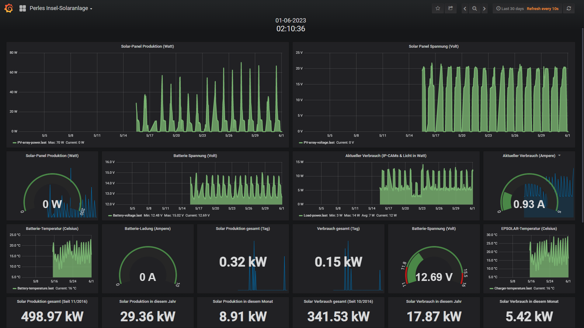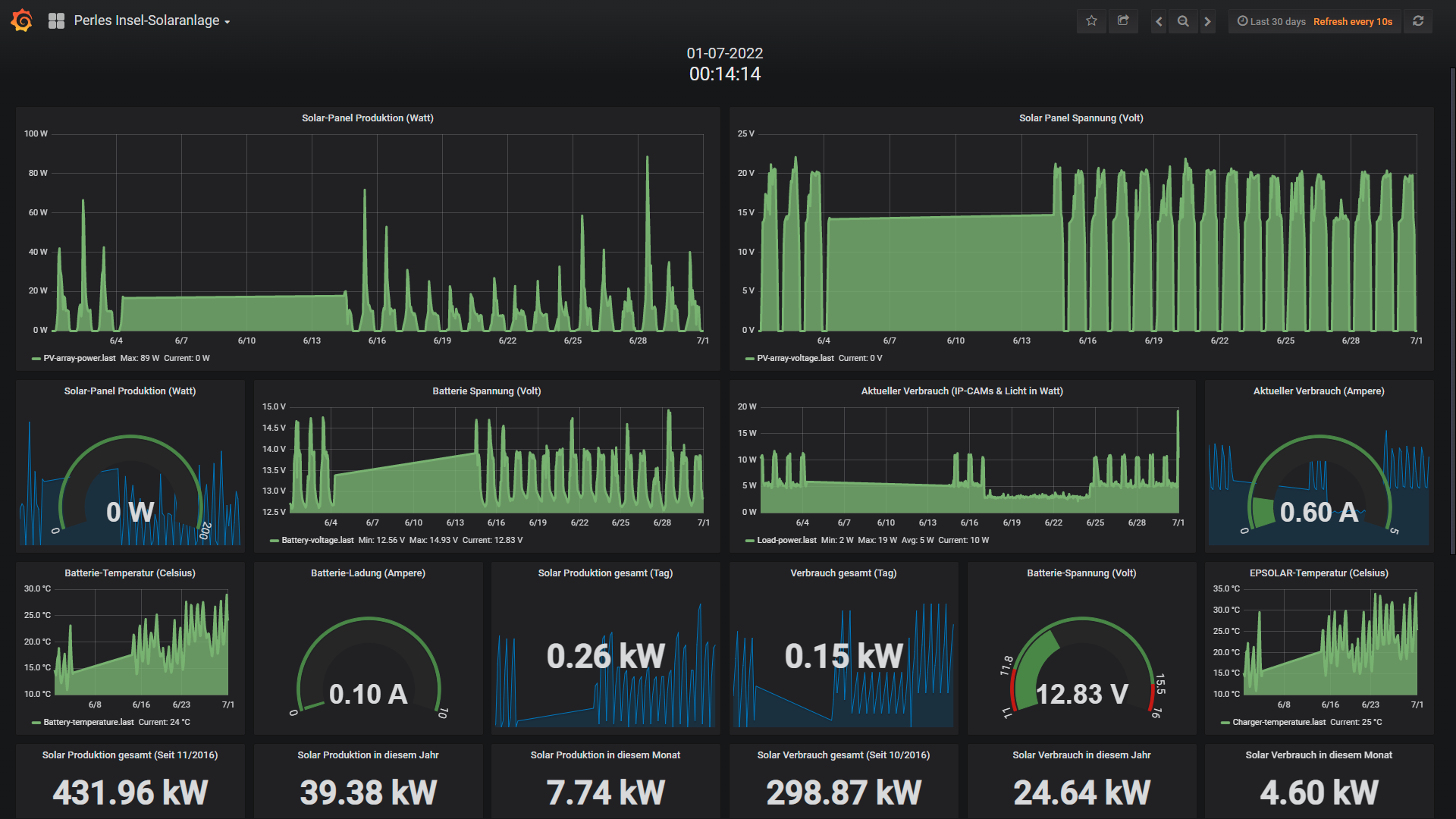 Die kleine 200 Watt Insel-Solaranlage: Bei derartig guten Wetterverhältnissen hatte auch die Insel-PV Anlage keine Probleme und leichtes Spiel (wie eigentlich immer zwischen März und Oktober). Energie steht jeden Tag satt bereit und es dauert lediglich 1 Stunde bis die Akkus wieder zu 100% gefüllt sind. Dennoch gab es in diesem Juni einen 10 Tage Ausfall des Datenloggers, den ich aufgrund meiner Corona-Infektion erst sehr spät nach eben diesen 10 Tagen entdeckt habe. Aus unerfindlichen Gründen hat sich der COM-Port meines EPEVER Solar-Ladereglers aufgehängt, sodass keine Daten vom Raspberry Pi ausgelesen und gespeichert werden konnten. Ein kurzer Reset hat das Problem wenn auch wegen meines Krankheitsverlaufes (lag hier 14 Tage flach) gelöst. Ansonsten lief die Anlage technisch problemlos, nur das Logging war betroffen. Hier noch der Juni Screenshot: