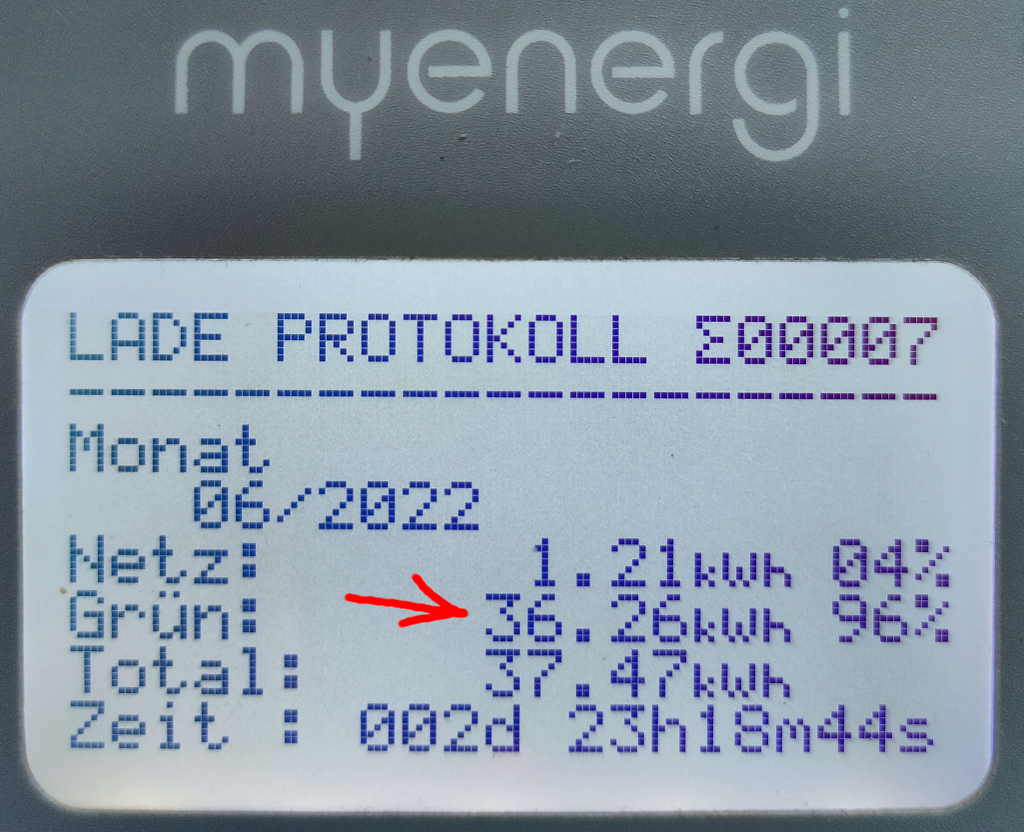 Die myenergie ZAPPI Wallbox: Die kleine Zappi hatte nur bedingt zu tun, da ich mein E-Kona überwiegend dezentral kostenlos CCS Schnellgeladen habe. Immerhin flossen aber dann doch noch 36,26kwh Überschuss vom Dach direkt in den Wagen. Da das SMA Energy-Meter ( aufgrund der 3 Phasen-Zappi Installation ) nicht erkennt, dass Strom ins Auto umgeleitet wird, wird der Ueberschluss von SMA und dessen Energie Meter als EXPORT dargestellt welcher vergütet wird. Auch dann, wenn dieser von der Zappi automatisch in das E-Auto umgeleitet. Die Zappi protokolliert allerdings sehr genau die in den Wagen umgeleitete Energie, sodass es mir mit diesen Daten moeglich ist, diese weiter unten korrekt zu verrechnen. Hier der Juni Screenshots meiner Zappi-Wallbox: