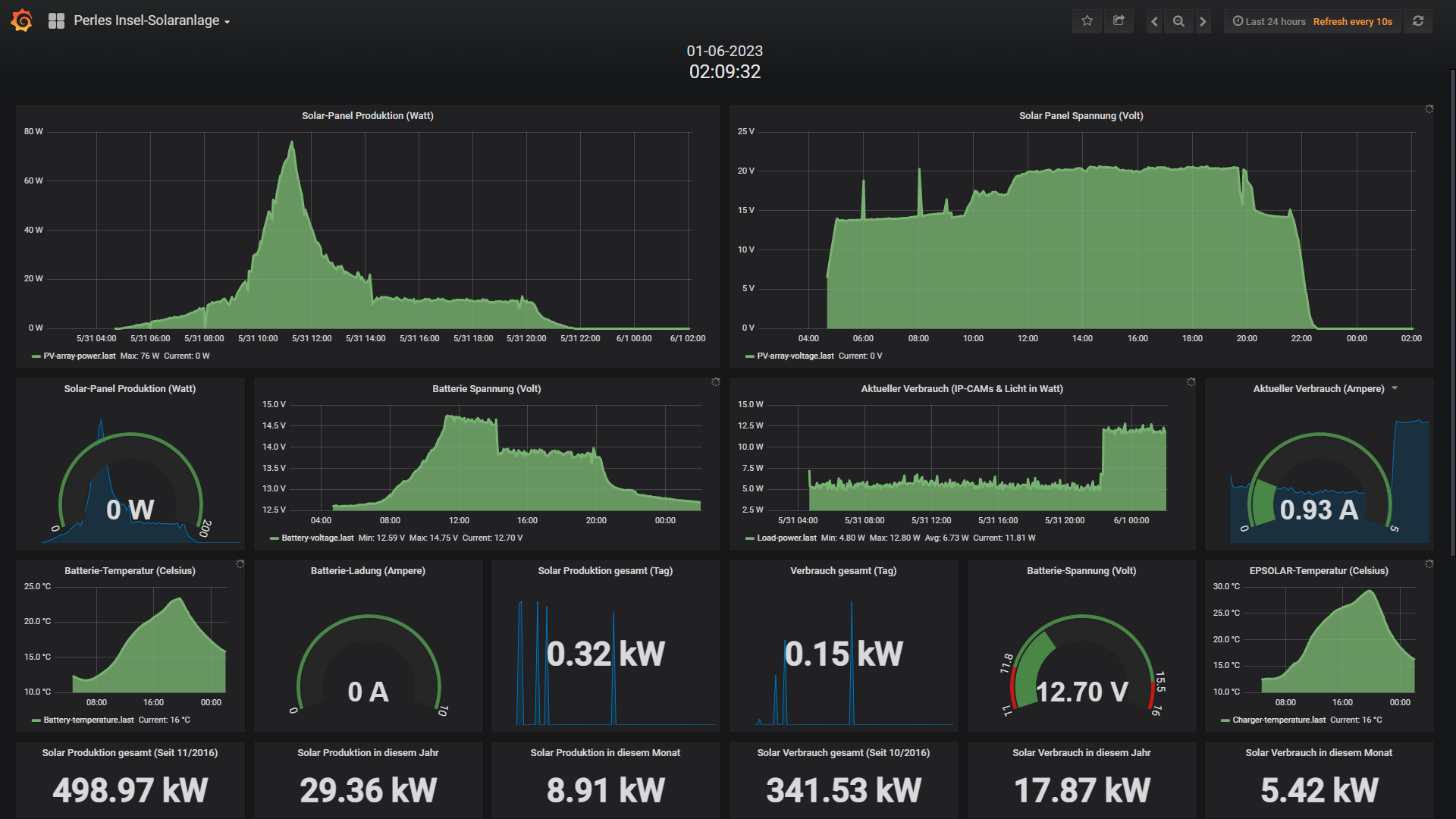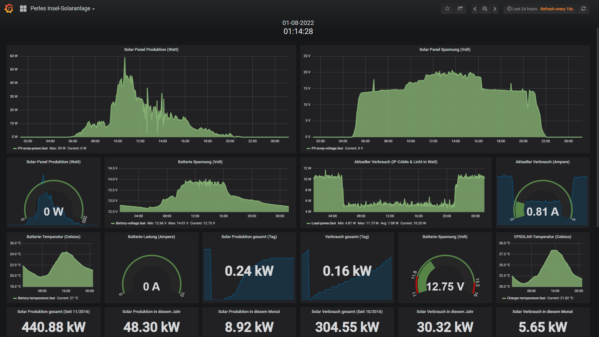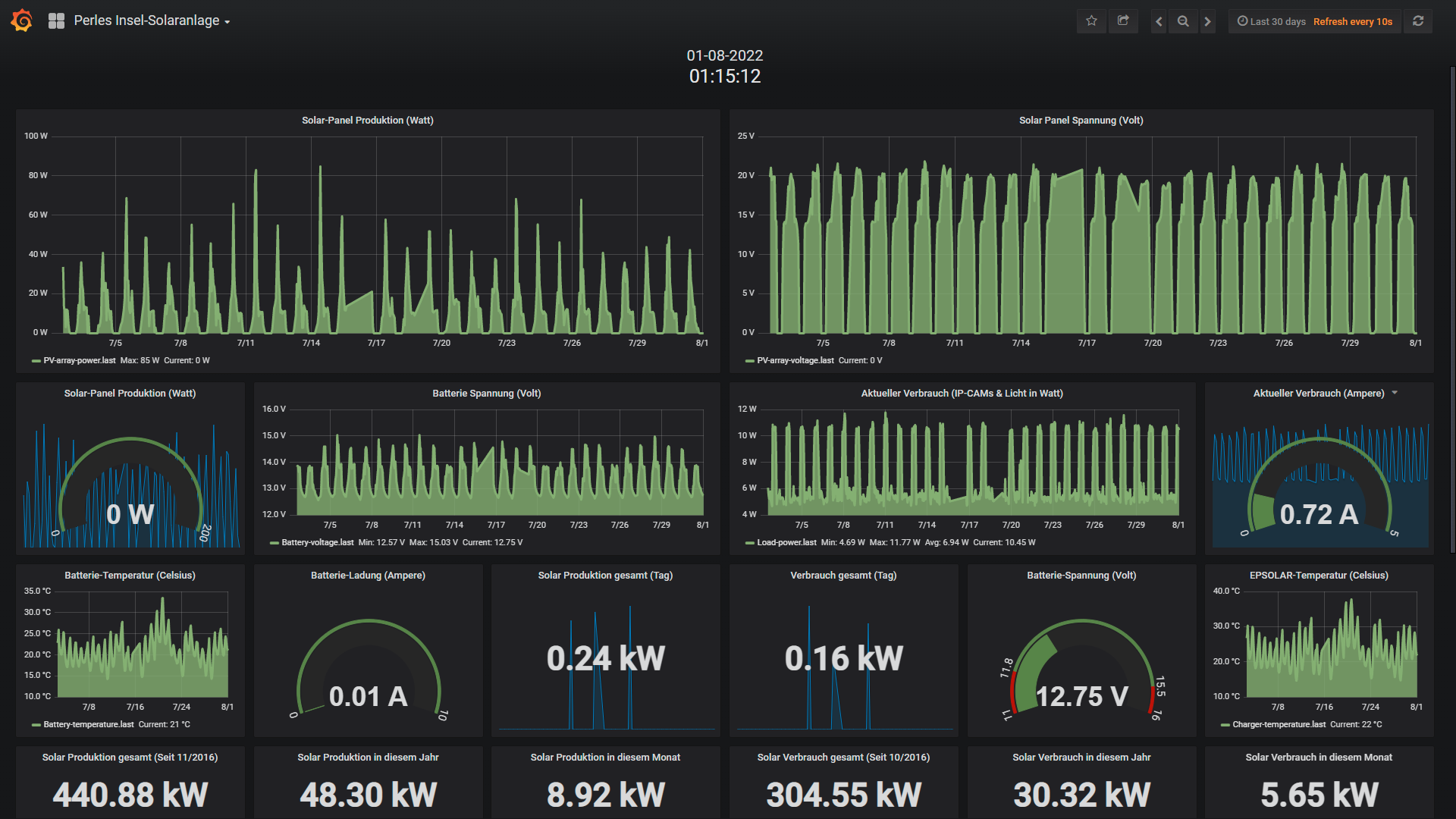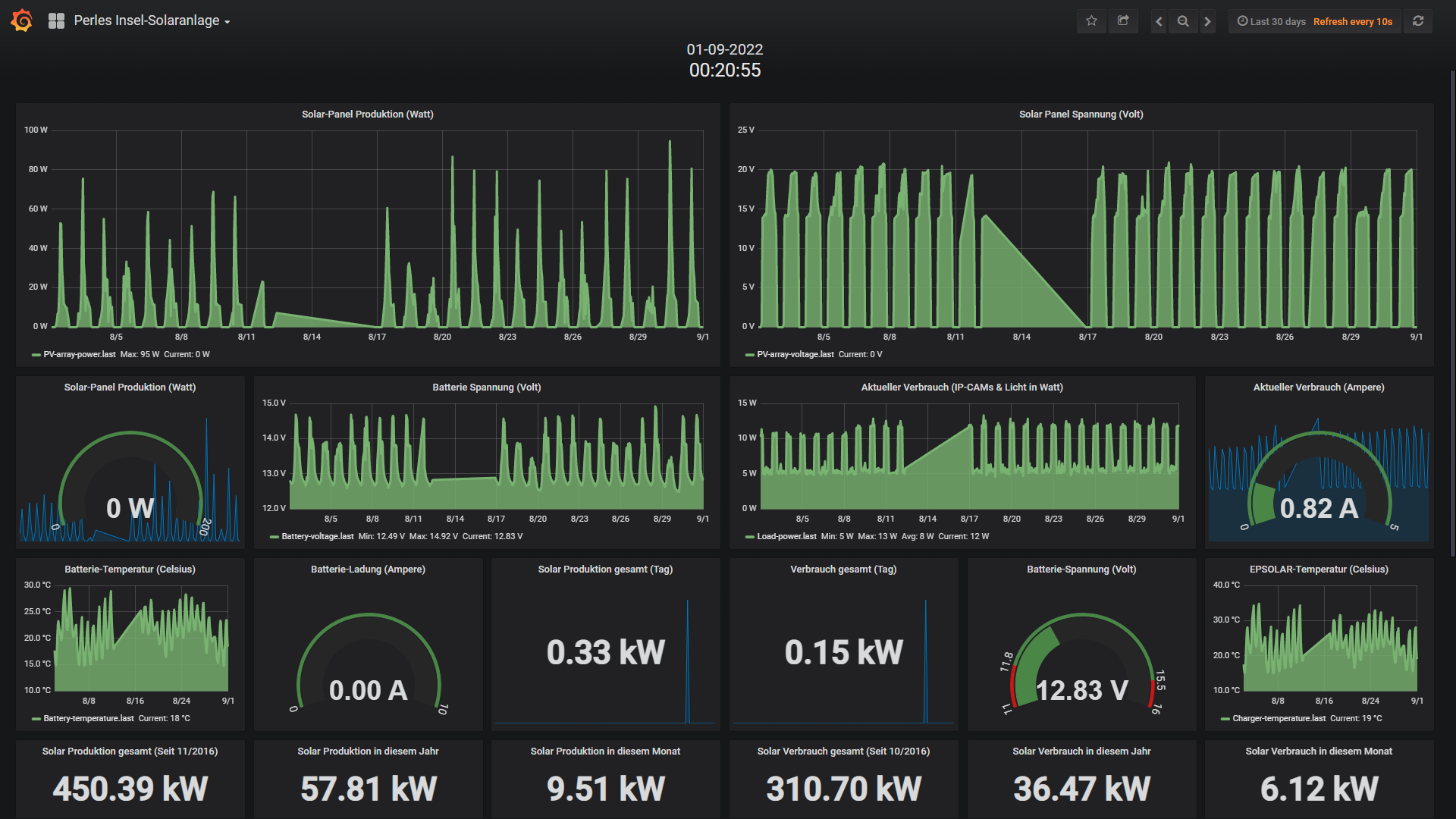 Die kleine 200 Watt Insel-Solaranlage: Wie die Wetterübersicht oben andeutet, bedeutet auch für die Insel-Solaranlage positives. Denn bei solch positiven Wetterverhältnissen war es natürlich ein leichtes, die aus den Akkus entnommene Energie welche vom Raspberry Pi; IR-Flutlicht und Überwachungskamera wieder blitzschnell aufzufüllen. Zwischen dem 11 und 16 August hat sich der Datenlogger verabschiedet und ich bemerkte diesen Ausfall erst am 17 August. Ein kurzer Reset der Anlage (Trennung von den Akkus) und schon lief wieder alles. Wie schon in den Jahren zuvor scheint sich der COM-Port des EPEVER Solar-Reglers hin & wieder mal aus mir unerfindlichen Gründen aufzuhängen. Aber das ist wenig dramatisch und ein schnell und einfach in wenigen Sekunden zu lösendes Problem. Vielleicht hatte das mit der enormen Hitze im Schuppen zu tun, wobei ich in der Anlage auch eine Temperatur-Gesteuerte Kühlung verbaut habe. Zum Glück passiert das eher selten, drum besteht kein Handlungsbedarf: