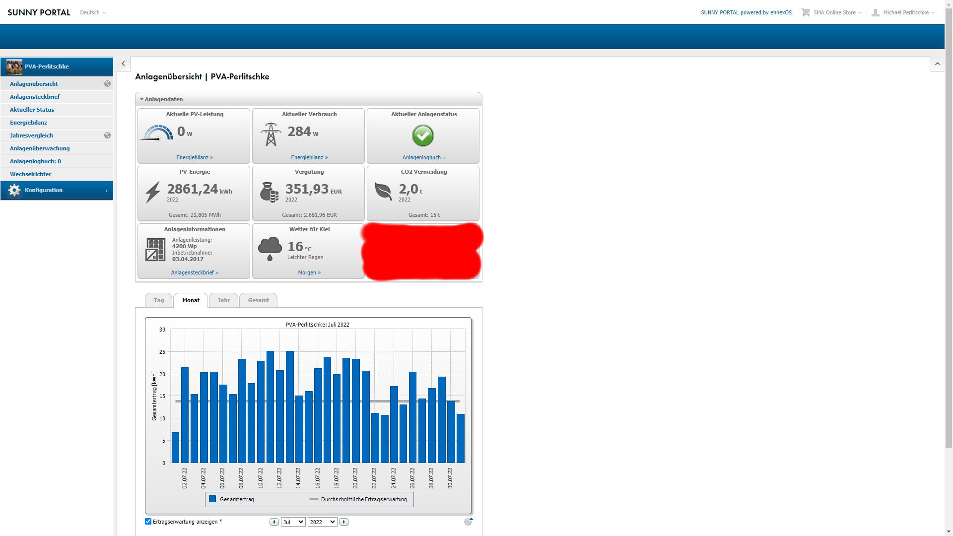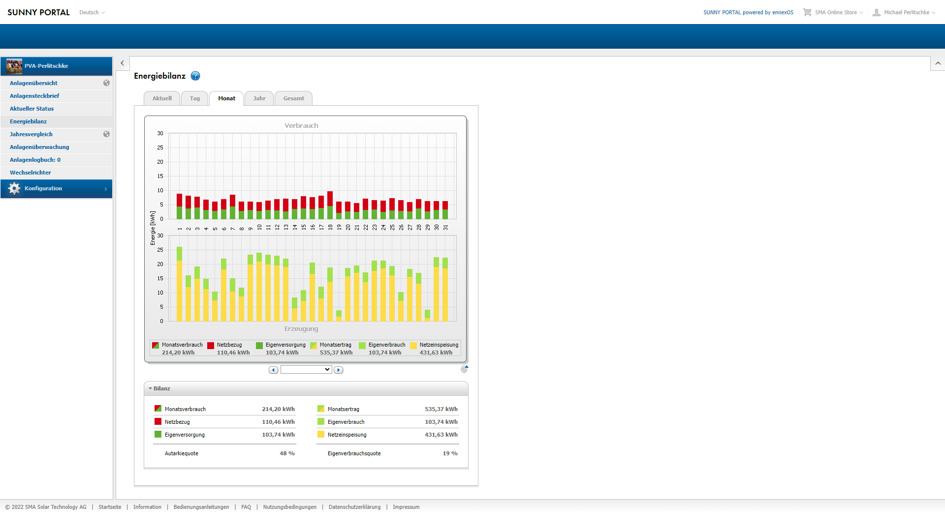 -Juli: 50,51 Euro Gewinn durch Verkauf und Einsparung durch Eigenverbrauch 34,69 Euro: Summe 85,20 Euro