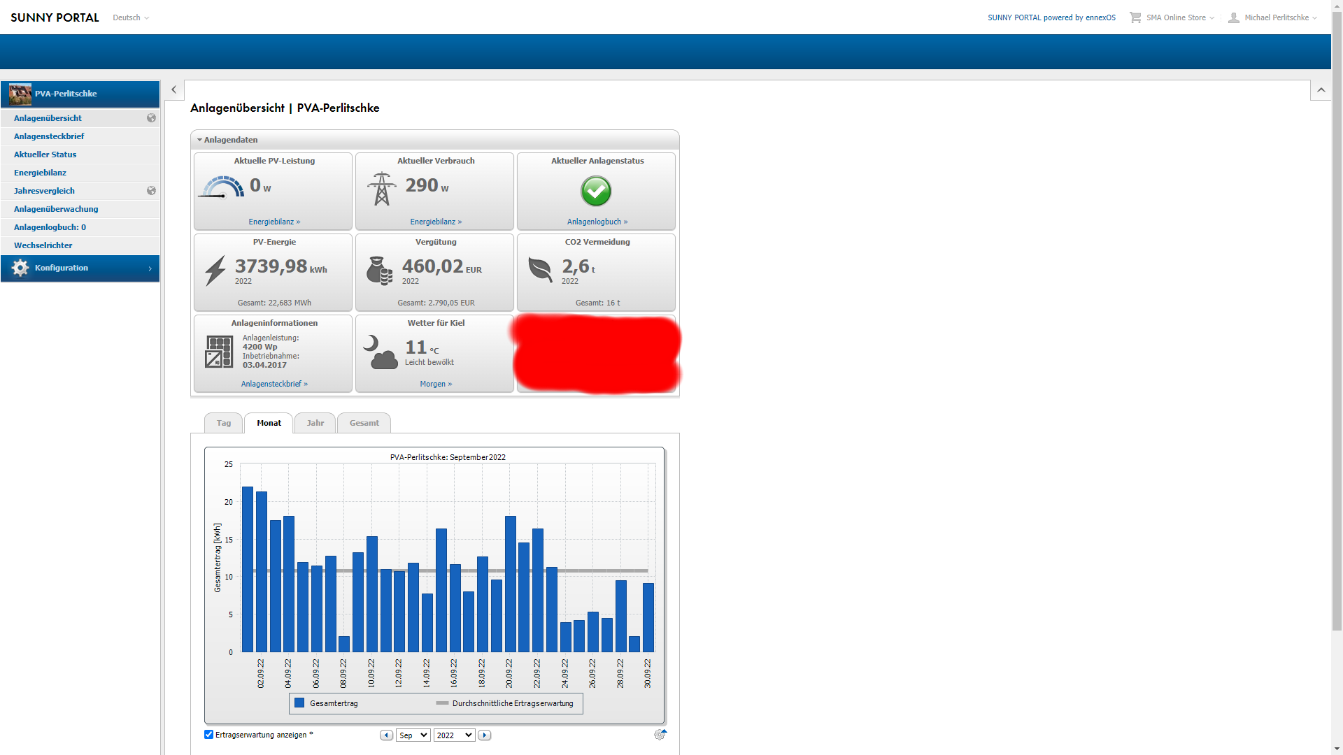 Hier die 4.2kwp Photovoltaik-Anlage auf dem Dach: Die kleine 4,2kwp Dach PV Anlage lief natürlich bei dem oben schon beschriebenen Wettermix etwas ruckelig. Durch den Regen wurden die total verdreckten Module endlich mal wieder richtig anstaendig sauber gewaschen. Diesen Monat knackte die Dach-Anlage für den September gerade so die durchschnittliche Produktionserwartung. Die Ertragserwartung für den September (der schon immer sehr unbeständig in den letzten Jahren war) lag bei 324,77kwh und vom Dach kamen 343,37kwh. Das ungeplante Ertragsplus lag somit nur bei 5,7% über der prognostizierten Ertragserwartung. Immerhin knapp drueber was Platz 4 (von 6) bedeutet. Aber schaut selbst: