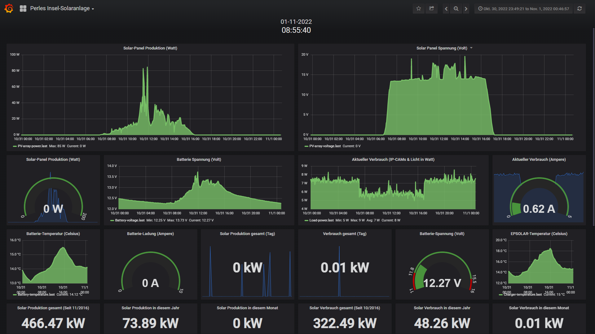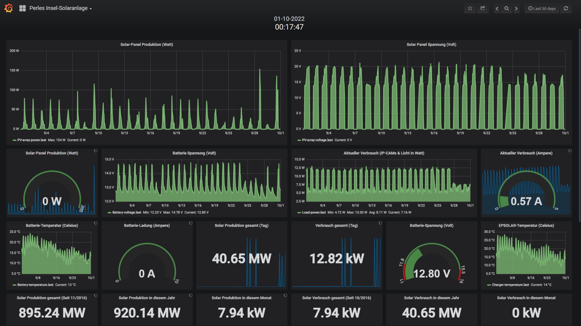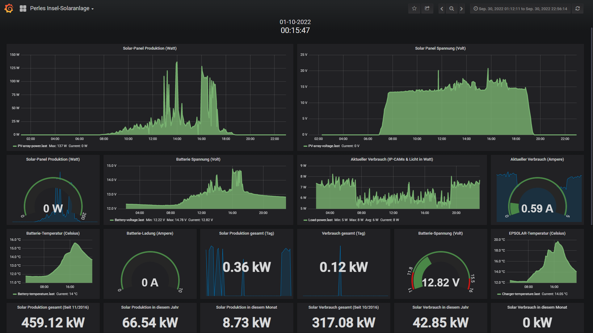 Die kleine 200 Watt Insel-Solaranlage: Wie zu erwarten lief die Anlage trotz merklich kürzer werdenden Tage und immer ungünstiger stehendender Sonne problemlos durch. Da aber in der letzten September-Woche fast nur Regen und dicke Wolken am Start waren, bediente sich die Insel-Anlage ueber die eingelagerte 200Ah Akku-Power und lutschte die Energie stetig weg ohne das nennenswert nachgefuellt wurde. Also beschloss ich 4 Tage vor Ende des Monats bei 12,23 Volt das Infrorot-Flutlicht zu deaktivieren, was bedeutet das Nachts (bei immer länger werdenden Nächten) anstatt 12 Watt nur noch 7 Wh verbraucht wurden. Und das Flutlicht bleibt nun bis Maerz 2023 deaktiviert. Irgendwann im November wird es dann auch noetig die Kamera temporaer (wenn ich zuhause bin) zu deaktivieren. Aber das alles kennen wir ja schon von den letzten 6 Jahren. Fazit: Noch laeuft alles unter Last sauber (bis auf das IR-Flutlicht) und Stoerungsfrei automatisch nach Plan!