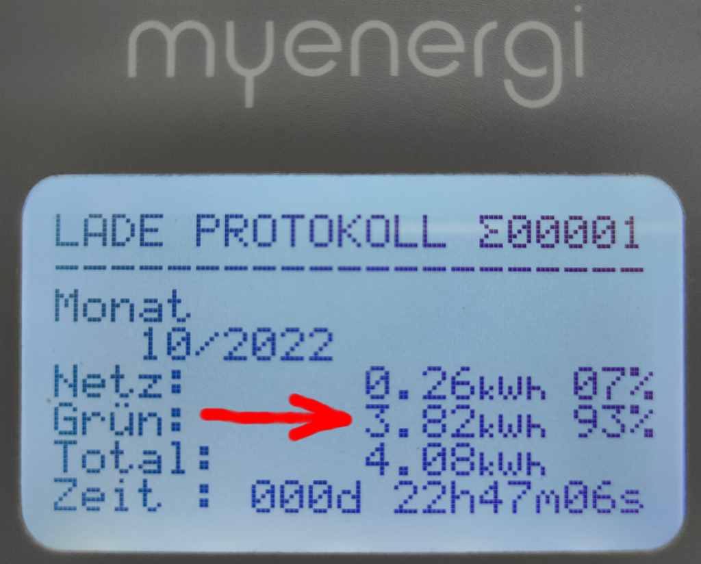 Diese vom SMA als Netzeinspeisung erfasste Energie muss nun mit der von der Zappi gemessenen und genutzten Energie (ins E-Auto umgeleiteten) entsprechend reduziert werden. In obigen Beispiel also 3,82kwh die NICHT verkauft wurden, sondern als zusätzlicher grüner PV Strom dem Eigenverbrauch angerechnet werden muss! Und diese 3,82kwh muss auch von der Netzeinspeisung abgezogen werden, damit wieder alles korrekt gerechnet werden kann. Siehe nächsten Absatz...