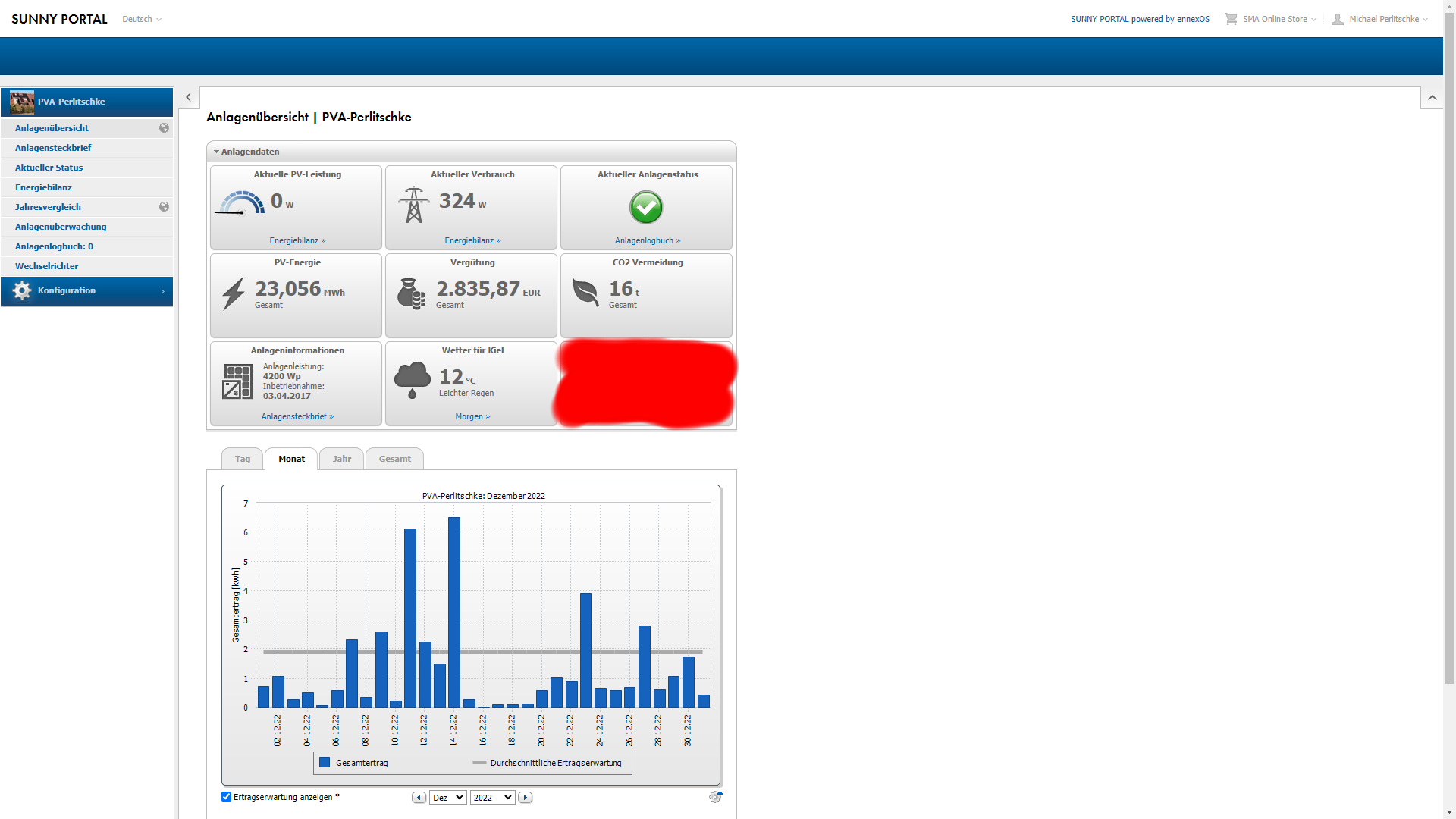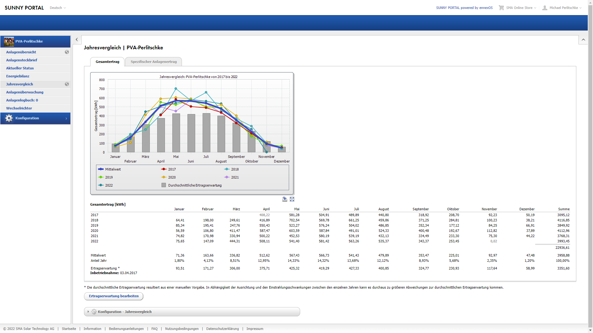 Es stehen noch 3 Monate für das 6te Produktionsjahr aus. Da kann noch richtig viel passieren und es ist alles möglich. Stand jetzt ist das die Anlage im 6ten Produktionsjahr dramatisch und auch erfreulich über den Erwartungen produziert hat. Wie war denn die Performance auf das Jahr 2022 (Januar-Dezember) separiert betrachtet. Die Jährliche Ertragserwartung liegt bei 3351,60kwh. Produziert hat die Anlage im Jahr 2022 satte 4112,55kwh. Das ist ein Rekord und liegt auf gleicher Höhe mit der Produktion der Jahre 2018 & 2020. Also ganz grosse Klasse, da kann man sehr zufrieden sein denn viel besser geht es kaum (man bedenke die West/Südausrichtung und auch das die Anlage hoch im Norden Deutschlands operiert).