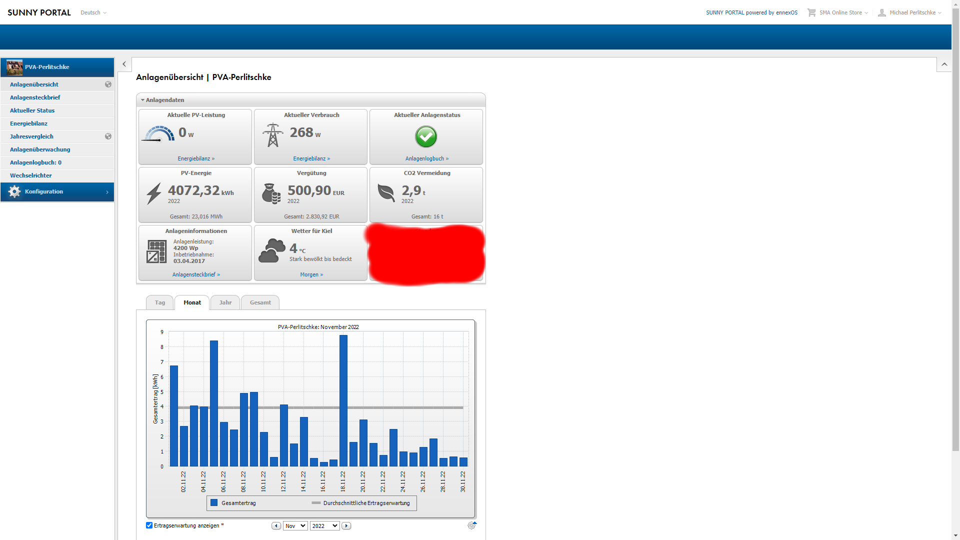 Hier die 4.2kwp Photovoltaik-Anlage auf dem Dach: Nun kommen wir zur kleinen 4,2kwp Dach PV Anlage. Eigentlich gibt es nicht wirklich viel nennenswertes zu berichten. Die Energie kleckerte in homöopathisches Dosen vom Dach und als im Dzember Schnee fiel kam garnichts mehr aus den Modulen (da dick mit Schnee eingepackt). Die Ertragserwartung für den November lag bei 117,64kwh und vom Dach kamen nur 78,88kwh. Um ein Haar wäre der Negativ-Rekord (75,30kwh) von 2021 also letztem Jahr gerissen worden. Somit landet dieser November auf dem vorletzten Platz seit 2017. Das entspricht einem Minus gegenüber der Ertragserwartung von satten 33,05%. Und nun widmen wir uns dem Dezember, denn hier lang die Ertragserwartung bei 58,99kwh und geworden sind es glücklich 40,23kwh. Auch ein fettes Minus von 31,8% aber im Mittelfeld aller Dezember angesiedelt. Ja, die November und Dezember mag meine PV-Anlage definitiv nicht. Noch niemals hat die Anlage die Erwartung im November geschafft und erst einmal im Jahr 2019 im Dezember geschafft! Zum Glück sind das aber beides Monate, die faktisch Betriebswirtschaftlich keine Rolle spielen. Schaut Euch das Nov. & Dez. Desaster einfach mal selbst an: