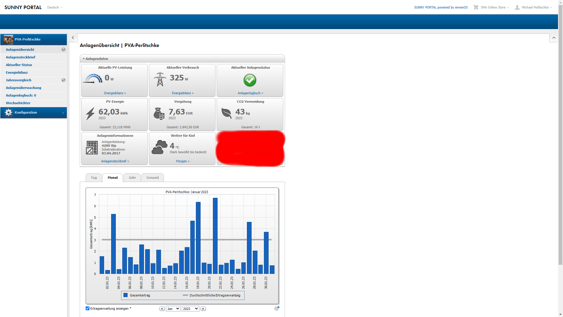Hier die 4.2kwp Photovoltaik-Anlage auf dem Dach: Nun kommen wir zur kleinen 4,2kwp Dach PV Anlage. Eigentlich gibt es nicht wirklich viel zu berichten, denn der Januar und Febuar erinnerten von der Grundstimmung her irgendwie an den November und Dezember. Die Energie kleckerte im Januar in homöopathisches Dosen vom Dach. Die Ertragserwartung für den Januar lag bei 93,51kwh und vom Dach kamen nur 62,03kwh. Das ist das Zweitschlechtesste Januar-Ergebnis seit 2017. Das entspricht einem Minus gegenüber der Ertragserwartung von grausamen 34%. Also ein Schlag ins Gesicht! Und nun widmen wir uns dem Februar, denn hier lang die Ertragserwartung bei 171,27kwh und geworden sind es durch die letzten guten Fabruartage dann glückliche 149,75kwh. Hier nur ein Minus von 12,5% also ein undurchschnittlicher Februar. Der Januar und Februar machen 2023 kein Spass. Zum Glück ist der Januar Betriebswirtschaftlich ohne Bedeutung. Schade das der Februar so schwach war, denn das könnte nun den angedachten neuen Anlagenrekord Ende März extrem gefährden.