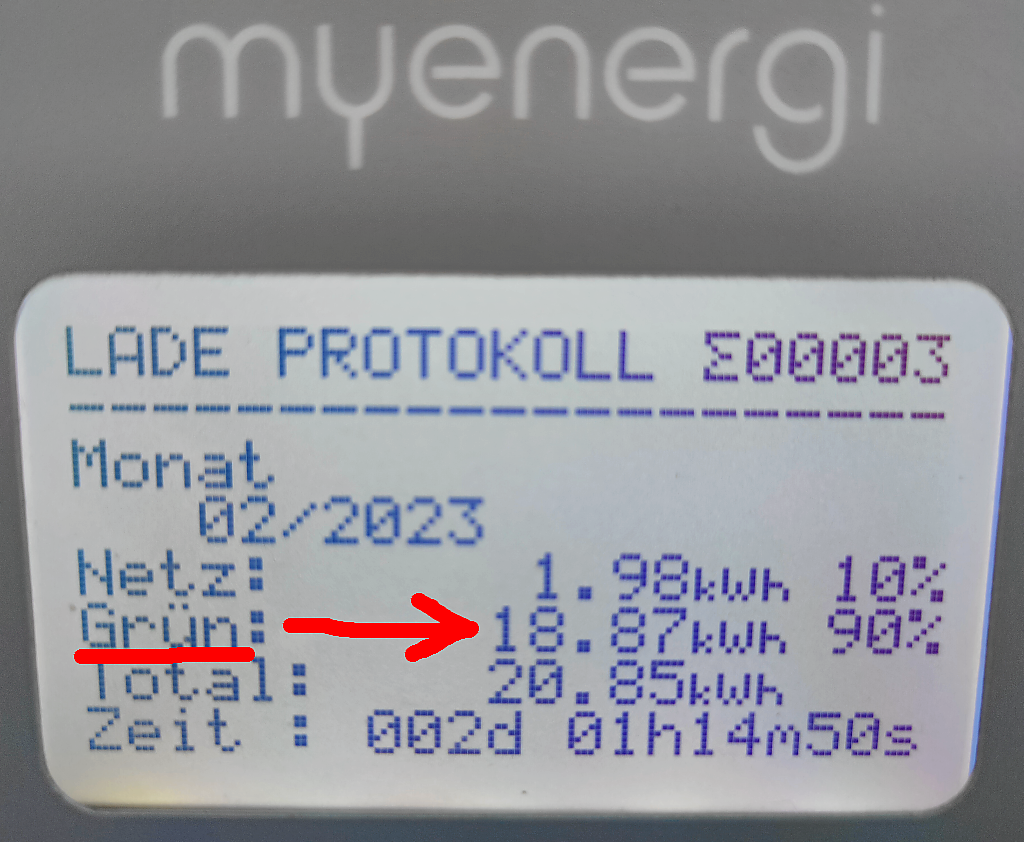 Die myenergie ZAPPI Wallbox: Die kleine Zappi hatte nur bedingt zu tun, denn erst Ende Febuar waren die Tage so, dass wenn die Sonne schien mal wirklich etwas Strom vom Dach kam welches sich in meinen E-Kona umleiten liess. 2mal hatte ich den Wagen kurz an der Zappi baumeln. In dieser kurzen Zeit flossen 18,87kwh Überschuss vom Dach direkt in den Wagen. Da das SMA Energy-Meter ( aufgrund der 3 Phasen-Zappi Installation ) nicht erkennt, dass Strom ins Auto umgeleitet wird, wird der Ueberschluss von SMA und dessen Energie Meter als EXPORT dargestellt welcher vergütet wird. Auch dann, wenn dieser von der Zappi automatisch in das E-Auto umgeleitet. Die Zappi protokolliert allerdings sehr genau die in den Wagen umgeleitete Energie, sodass es mir mit diesen Daten möglich ist, diese weiter unten korrekt zu verrechnen. Hier der Februar Screenshots meiner Zappi-Wallbox: