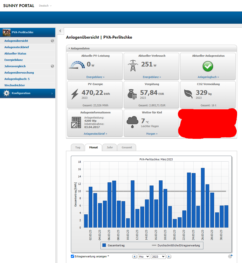 Hier die 4.2kwp Photovoltaik-Anlage auf dem Dach: Nun kommen wir zur kleinen 4,2kwp Dach PV Anlage und dem Maerz-Ertrag, der auf ganzer Linie enttaeuschend war. Die Energie kleckerte in diesem Maerz Wetterbedingt auch in homöopathisches Dosen vom Dach. Die Ertragserwartung für den Maerz lag bei 306kwh und vom Dach kamen nur 258,44kwh. Das ist das Zweitschlechtesste Maerz-Ergebnis seit 2017. Nur das jahr 2019 war noch etwas schlechter! Das entspricht einem Minus gegenüber der Ertragserwartung von 15,55%. Ok, nuechtern betrachtet geht das noch in Ordung und haette viel schlimmer sein koennen, aber fuer ein Maerz ist das wirklich wenig, also eher schlecht. Schade das der Maerz so schwach war, denn das hat der Anlage nun einen neuen Jahres-Produktions Rekord verhagelt: