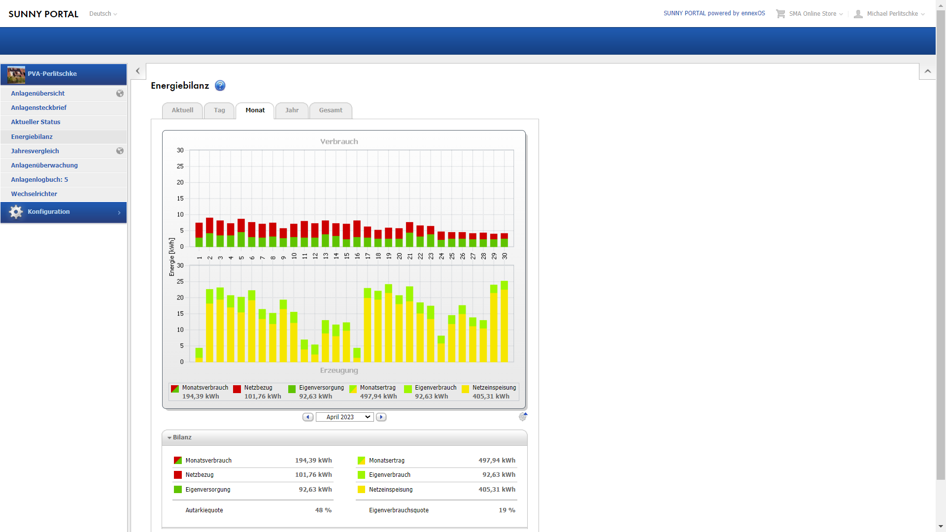 -April: 50,45 Euro Gewinn durch Verkauf und Einsparung durch Eigenverbrauch 26,54 Euro: Summe 76,99 Euro