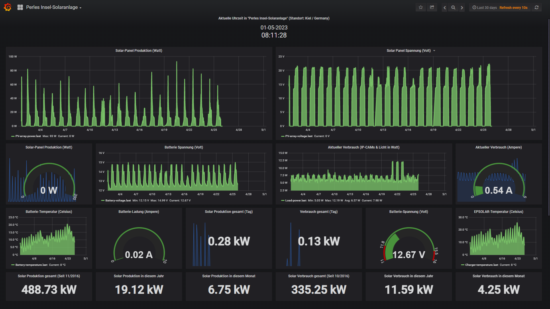 Die kleine 200 Watt Insel-Solaranlage: Die Insel-Solaranlage arbeitete natürlich ganz wunderbar und füllte den Akku bei solchen Traumwetter problemlos in kurzer Zeit. Da ich aber mit Mitte Mai in den USA war, gab es keine Möglichkeit diese Daten zu loggen, da wie schon im April beschrieben mein Selbstbau WLAN-Modul des Ladereglers keine Verbindung zum Router aufbauen konnte. Nach meiner Rückkehr nach Deutschland und einem Reset war der Fehler dann wieder behoben und alles funktionierte wieder
