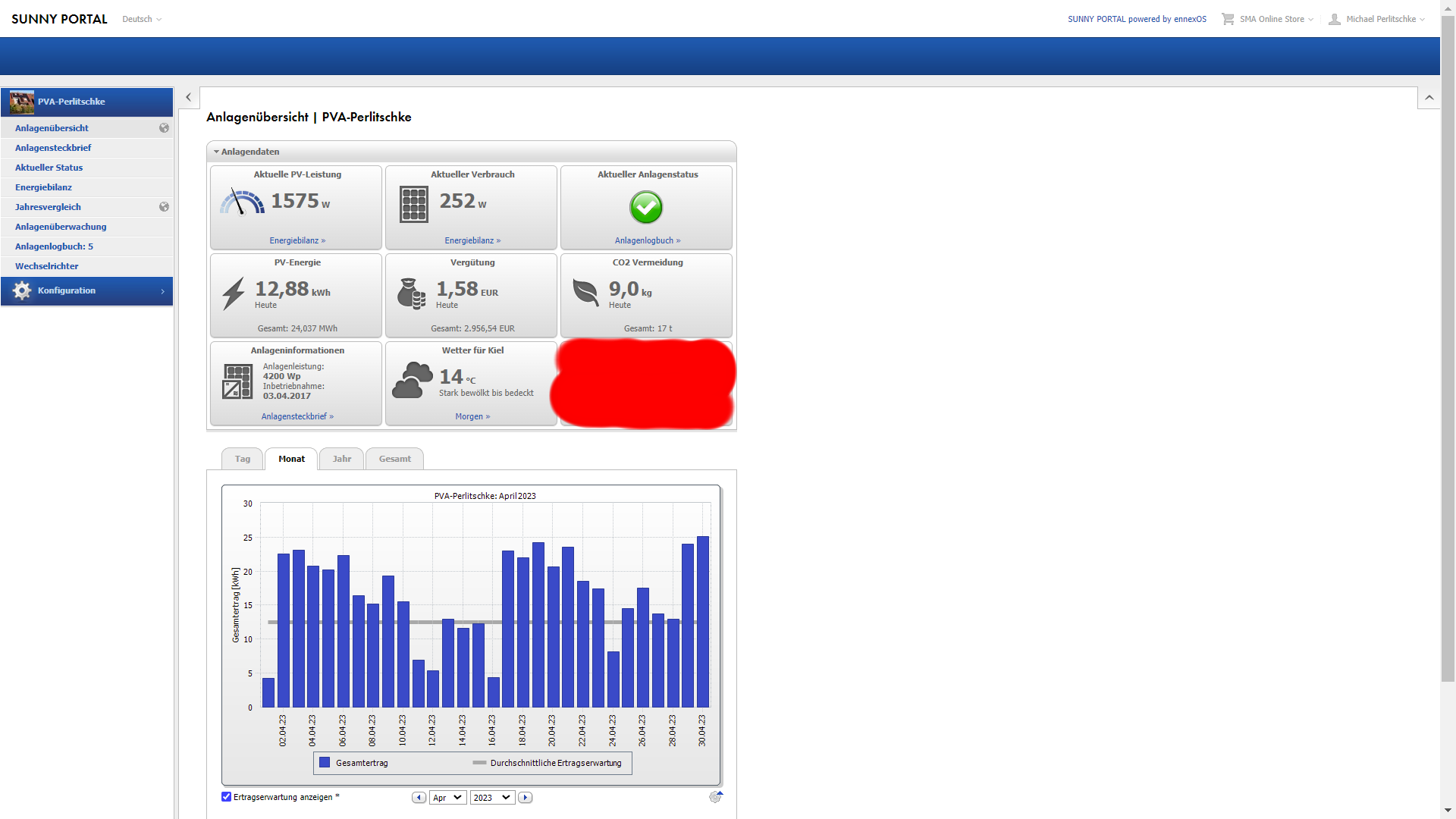 Hier die 4.2kwp Photovoltaik-Anlage auf dem Dach: Nun kommen wir zur kleinen 4,2kwp Dach PV Anlage und dem April-Ertrag, der durchaus mehr als in Ordung war. Die Summe der Energie welche vom Dach kam war gut aber nicht Rekord-Verdächtig. Die Ertragserwartung für den April lag bei 375,71kwh und vom Dach kamen nur 497,94kwh. Das liegt über die letzten 7 Jahre gesehen grob im unteren Mittelfeld aller April Erträge. Das entspricht einem Plus gegenüber der Ertragserwartung von 32,5%. Somit muss Somit ein respecktables Monatsergebnis mit dem man zufrieden sein muss: