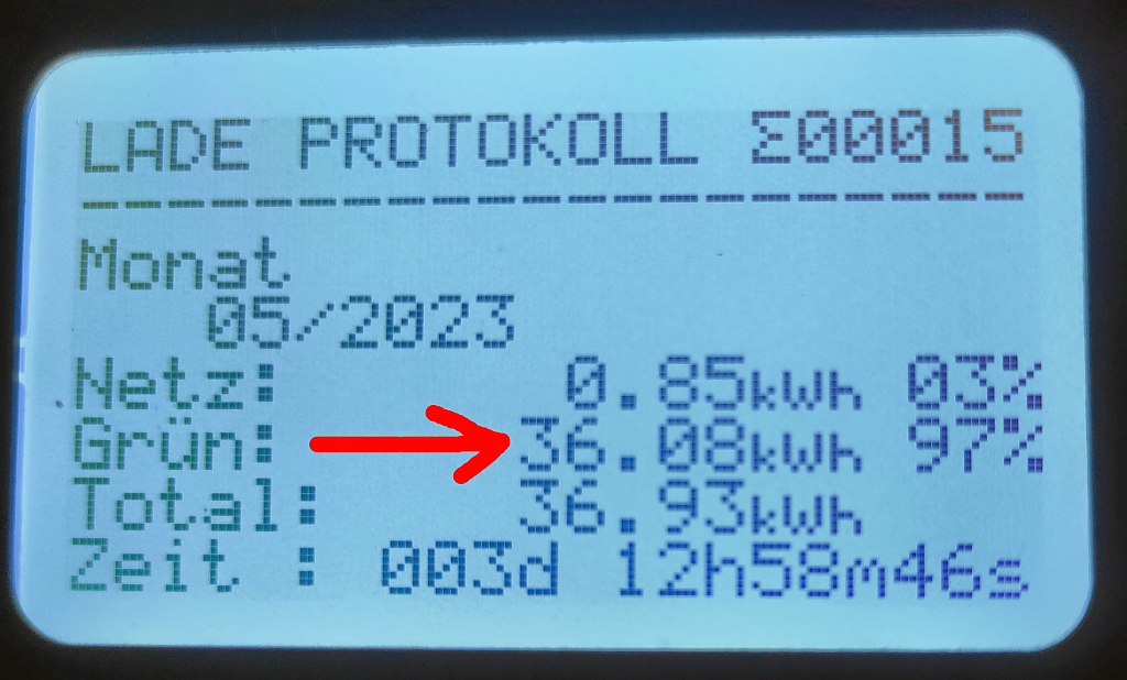 Nun aber zum Mai 2023 mit dem Faktor E-Auto resp. Zappi-Wallbox also das Ergebnis des zweiten Monats im frisch gestarteten 7ten Betriebsjahr. Vom Dach kamen in diesem Mai 2023 in Summe 600,64kwh. Der Stromzukauf von den Stadtwerken lag für diesen Mai bei 79,23kwh, welche bei 35,67 Cents pro Kilowattstunde meines Ökostrom-Tarifes ca. 28,26 Euro Strom Einkaufskosten bedeutet. Von den produzierten 600,64kwh habe ich selbst 103,54kwh plus 36,08kwh für das E-Auto, also in Summe 139,62kwh verbraucht, was eine Ersparnis bei einem Kilowattstundenpreis von 35,67 Cents in Summe 49,80 Euro ergibt. Den Rest, also 497,10kwh minus 36,08kwh (E-Auto)= 461,02kwh an Strom wurden für 0,123 Cents ins Netz abverkauft, was letztendlich 56,71 Euro an Einnahmen durch den Stromverkauf bedeutet.